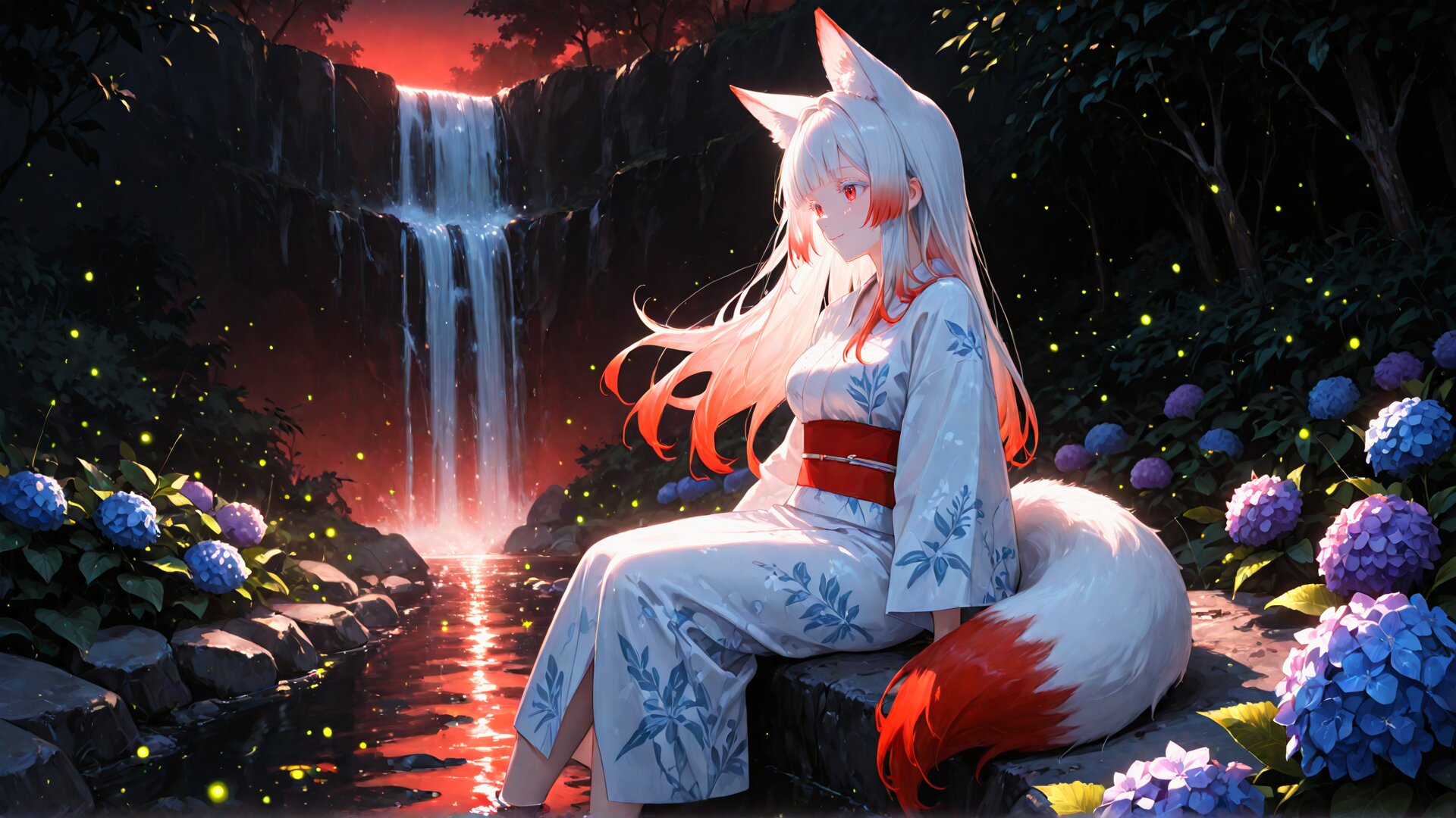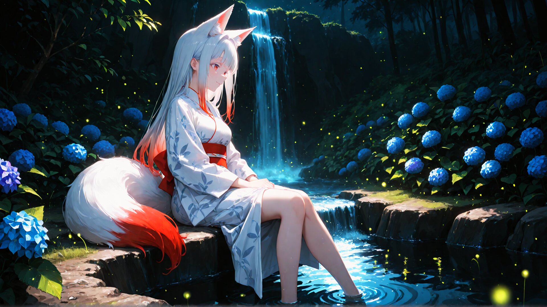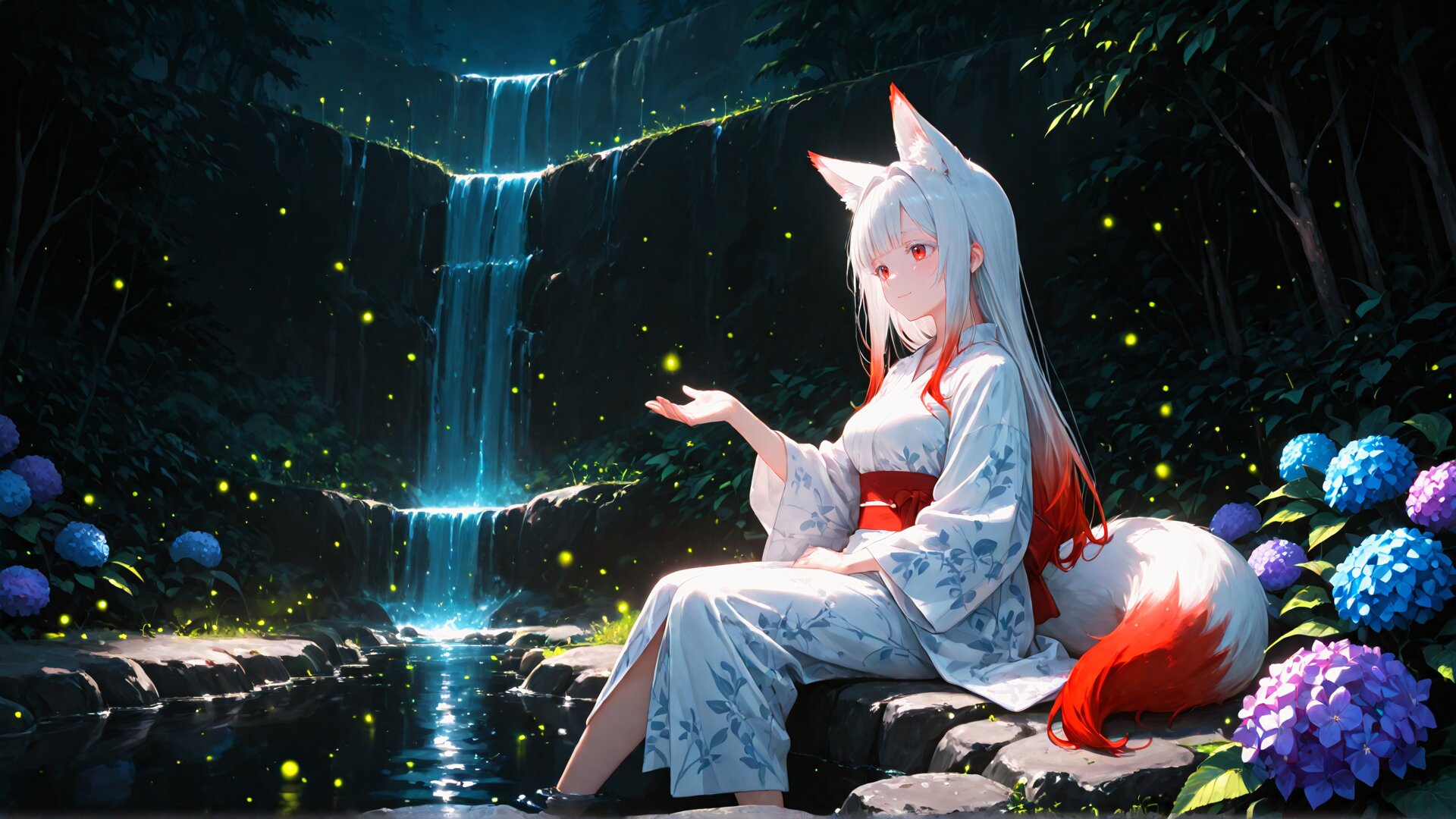 landscape,at night,river side,waterfall, 1girl,solo,20 years old,<聖さん>, white yukata,sitting,folded legs,knees together feet apart,facing to the side, (smile:0.8),(sad:0.6),reaching to firefly, hydrangea,(fireflies:1.3), from side,wide shot, darkness,<lora:flat_sdxl:-0.4>,<lora:outline_xl_kohaku_delta_spv5x:-0.4>,<lora:Detailer_NoobAI_Incrs_v1:0.8>,detailed,, appropriate posture,appropriate configuration,ideal ratio body proportions,perfect anatomy, <lora:Fixhands_anime_bdsqlsz_V1:1>, masterpiece,best quality,newest,absurdres,highres,ultra high res,8K UHD,hyper-detailed,