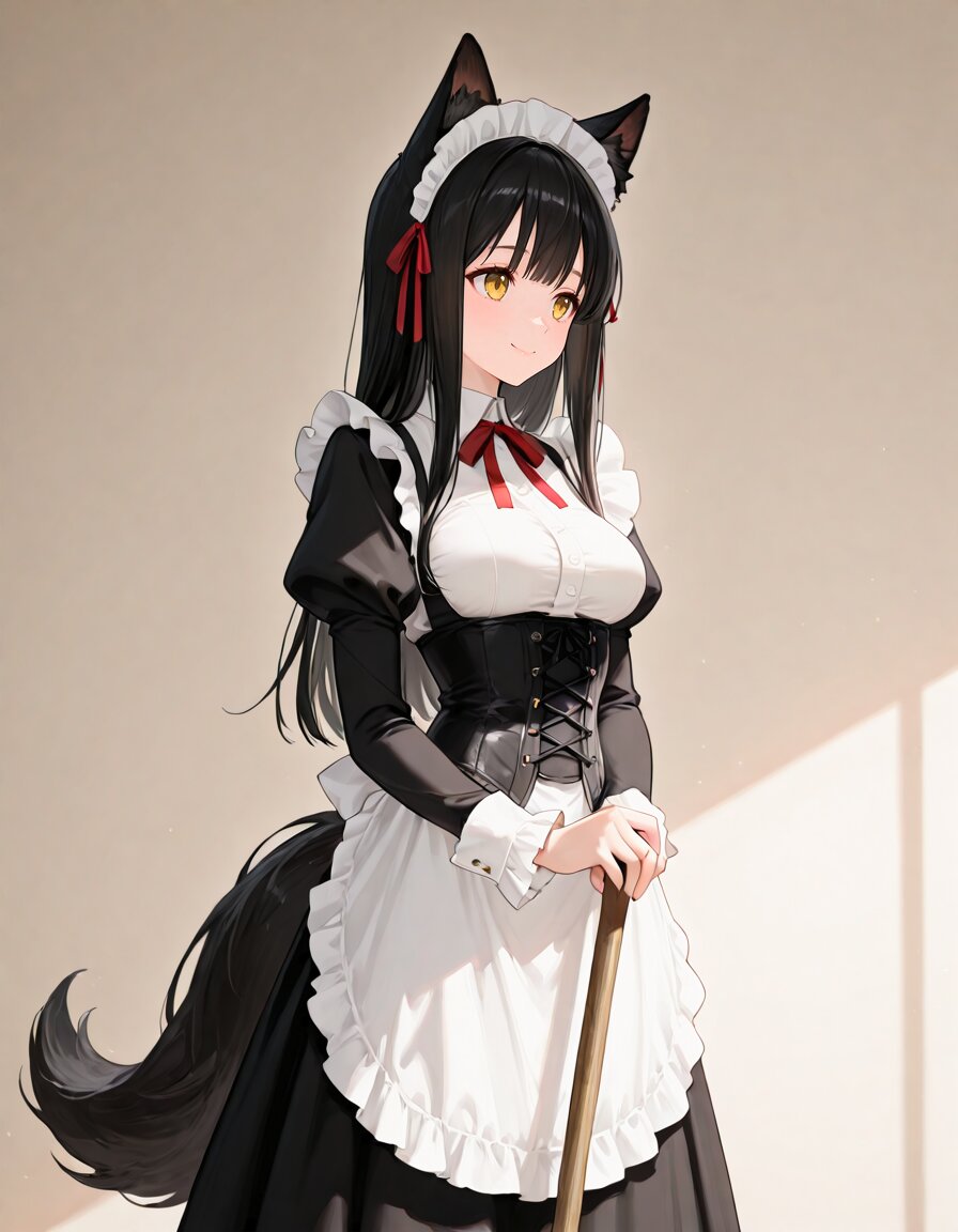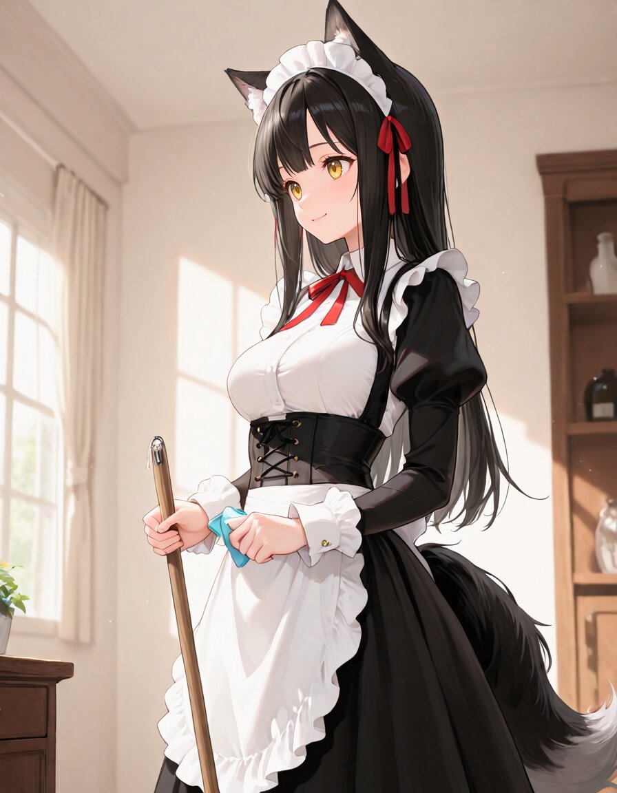 1girl,solo,<澪さん>, maid,grey clothes,maid apron,black corset,white shirt,maid headdress,long skirt,black juliet sleeves,frilled sleeves,black pantyhose,covered breasts, cleaning,smile,looking away, general,safe,, appropriate posture,appropriate configuration,ideal ratio body proportions,perfect anatomy, <lora:Fixhands_anime_bdsqlsz_V1:1>, masterpiece,best quality,newest,absurdres,highres,ultra high res,8K UHD,hyper-detailed,