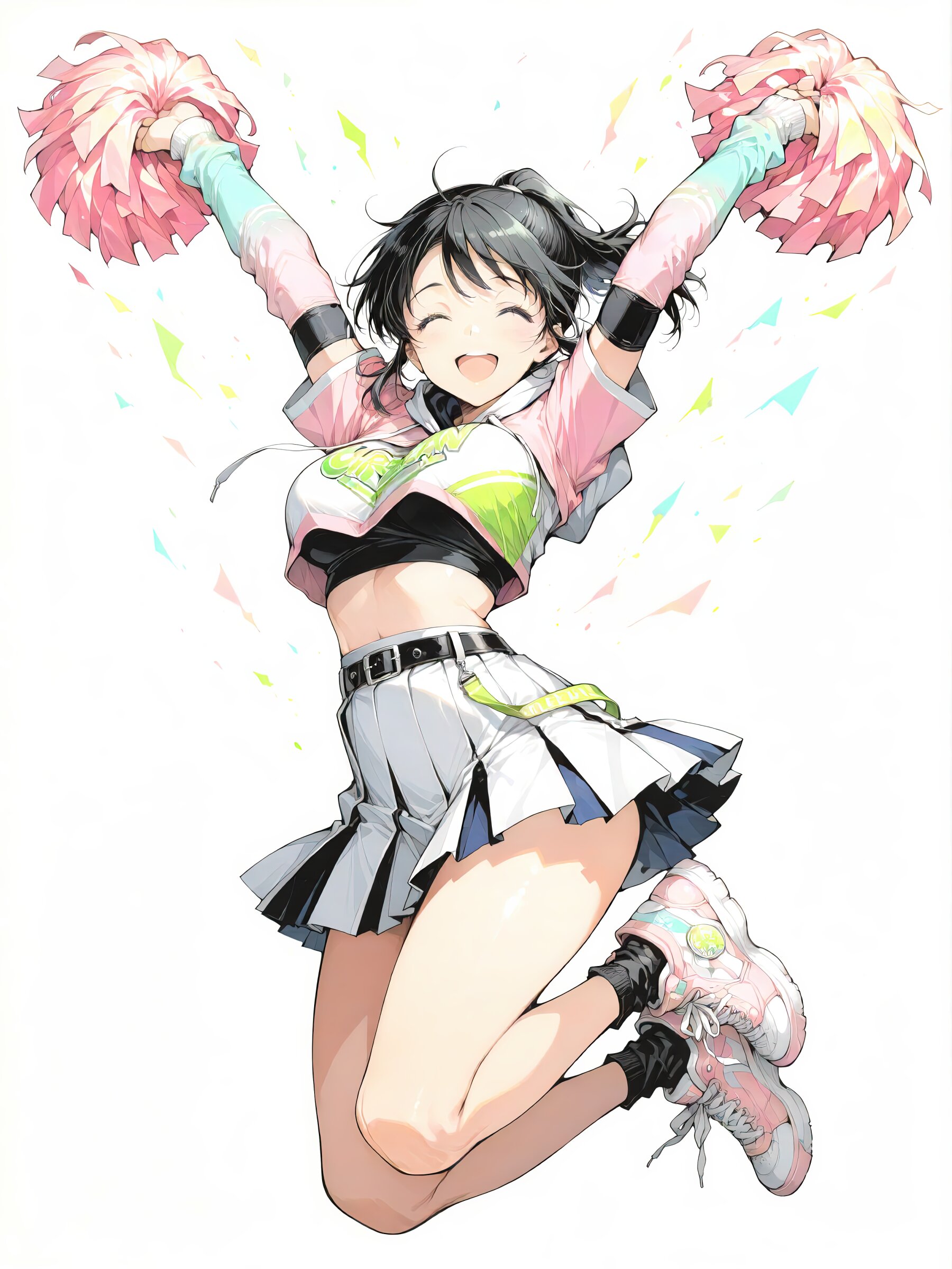 Best quality, Masterpieces, simple background with a minimalist design, lots of negative space, delicate anime-style illustration, white background, solo, (young girl), cute face and eyes, big breasts, black hair, clear black eyes, single short ponytail hair, cute and lovely, Vigorous, lively, and spontaneous personality, smile, open mouth, closed eyes, Jumping with arms raised, cheering, cheerleader outfit with street fashion elements, black and neon green color combo, cropped hoodie top, pleated skirt with belts, logo patches, arm warmers, chunky sneakers, edgy and urban feel, pink to lavender, minimal