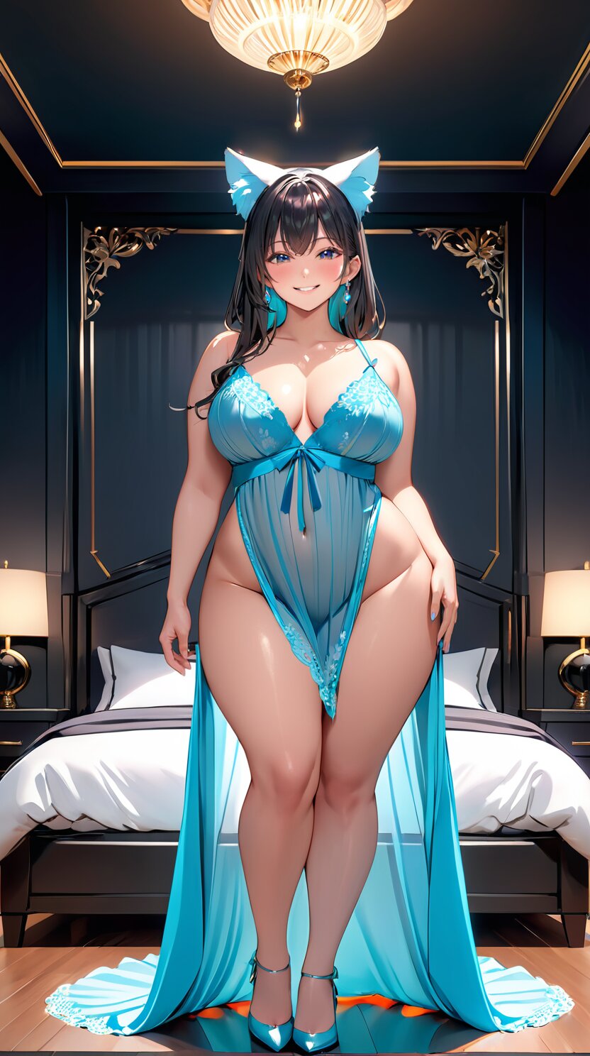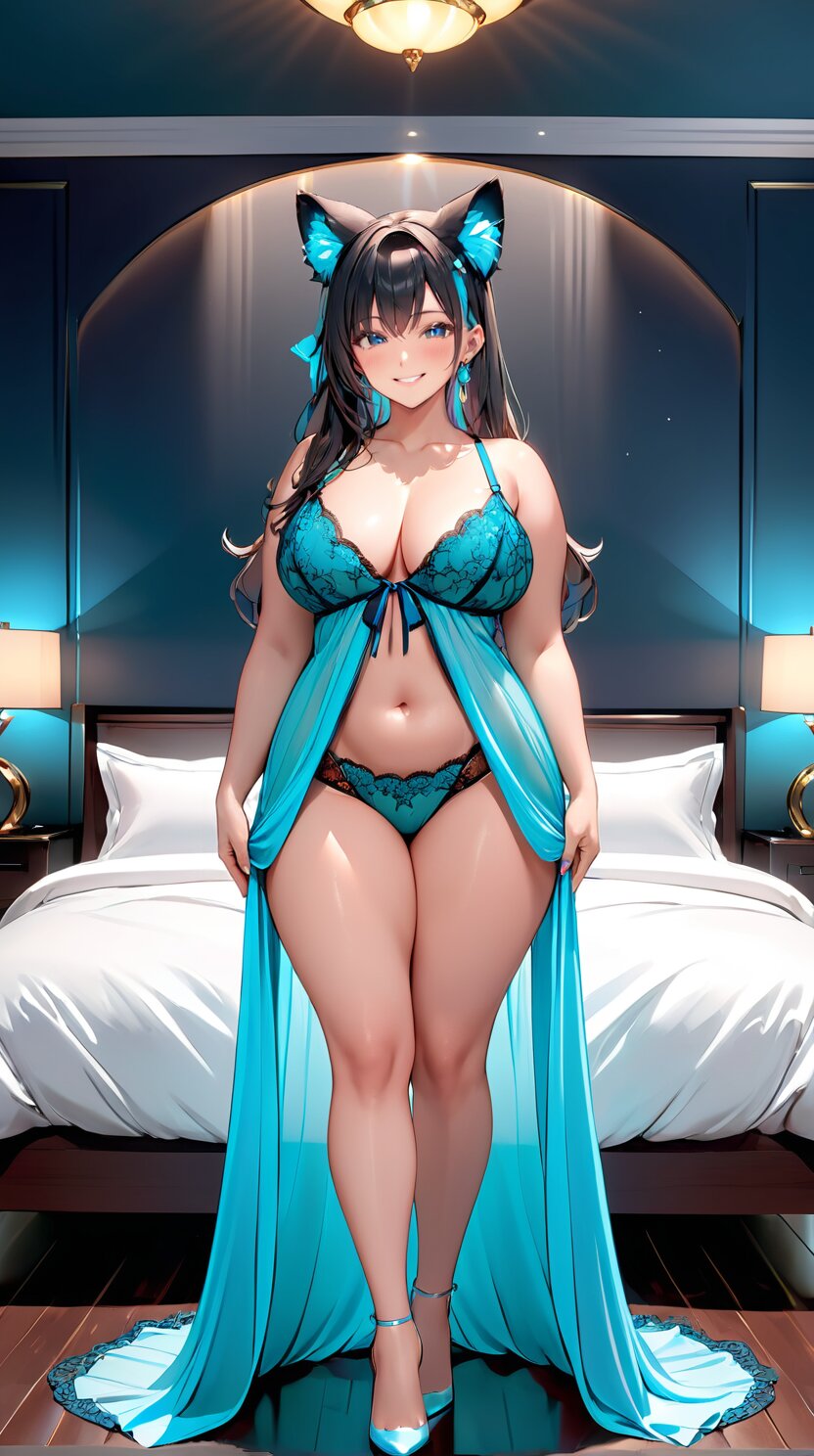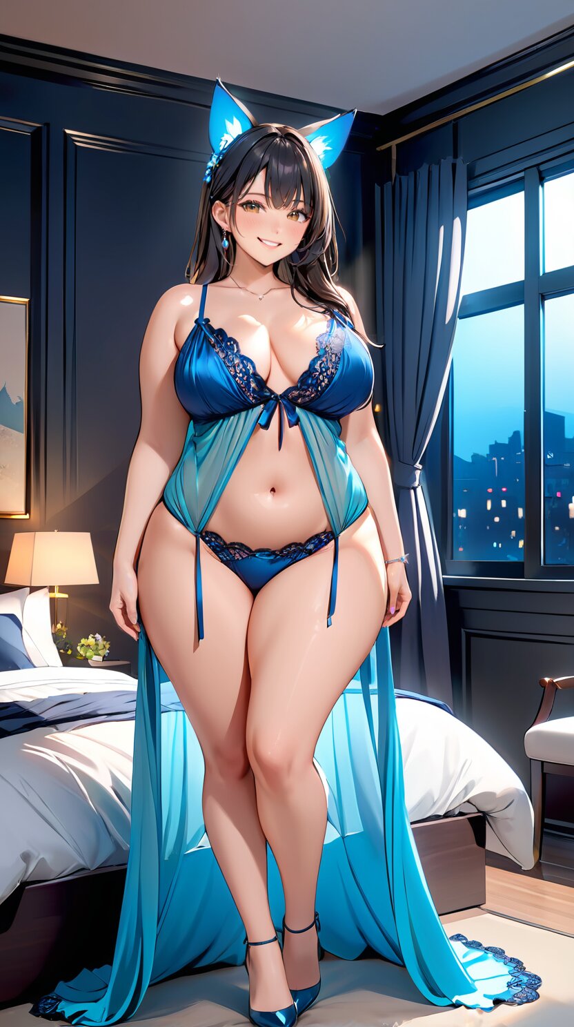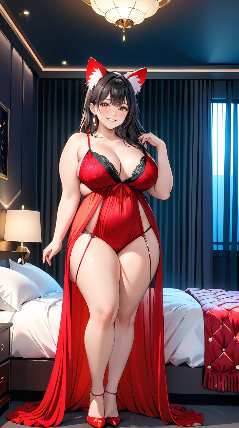 (from front: 1.8), perfect anatomy, (masterpiece:1.3), (best quality:1.3), (ultra-detailed:1.2), 8K, HDR, (incredibly absurdres:1.2), (vibrant color:1.2), 1girl, solo, 22 years old, (perfect body, sexy solid color lace negligee: 1.6), plump, black hair, on back, (full body, sexy posing: 1.8), huge breasts, (an extremely delicate and beautiful hands), nails, beautiful detailed ears, (intricate detail), highly detailed, beautiful detailed eyes, beautiful detailed glow, detailed light, shiny skin, shiny hair, (standing and posing in the dark bedroom: 1.8), <lora:fujikoM_v01:1>