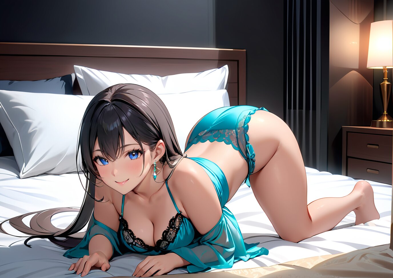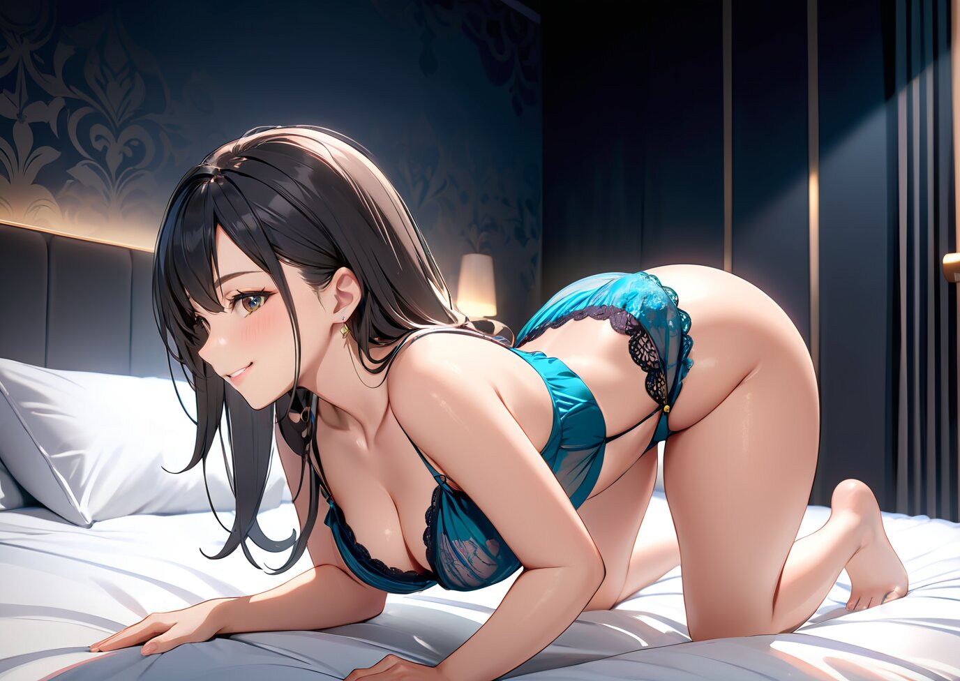 (from side: 1.8), perfect anatomy, (masterpiece:1.3), (best quality:1.3), (ultra-detailed:1.2), 8K, HDR, (incredibly absurdres:1.2), (vibrant color:1.2), 1girl, solo, 22 years old, (perfect body, sexy solid color lace negligee: 1.6), plump, black hair, on back, (full body, sexy posing: 1.8), huge breasts, (an extremely delicate and beautiful hands), nails, beautiful detailed ears, (intricate detail), highly detailed, beautiful detailed eyes, beautiful detailed glow, detailed light, shiny skin, shiny hair, (on all fours on bed, in the dark bedroom: 1.8), <lora:fujikoM_v01:1>