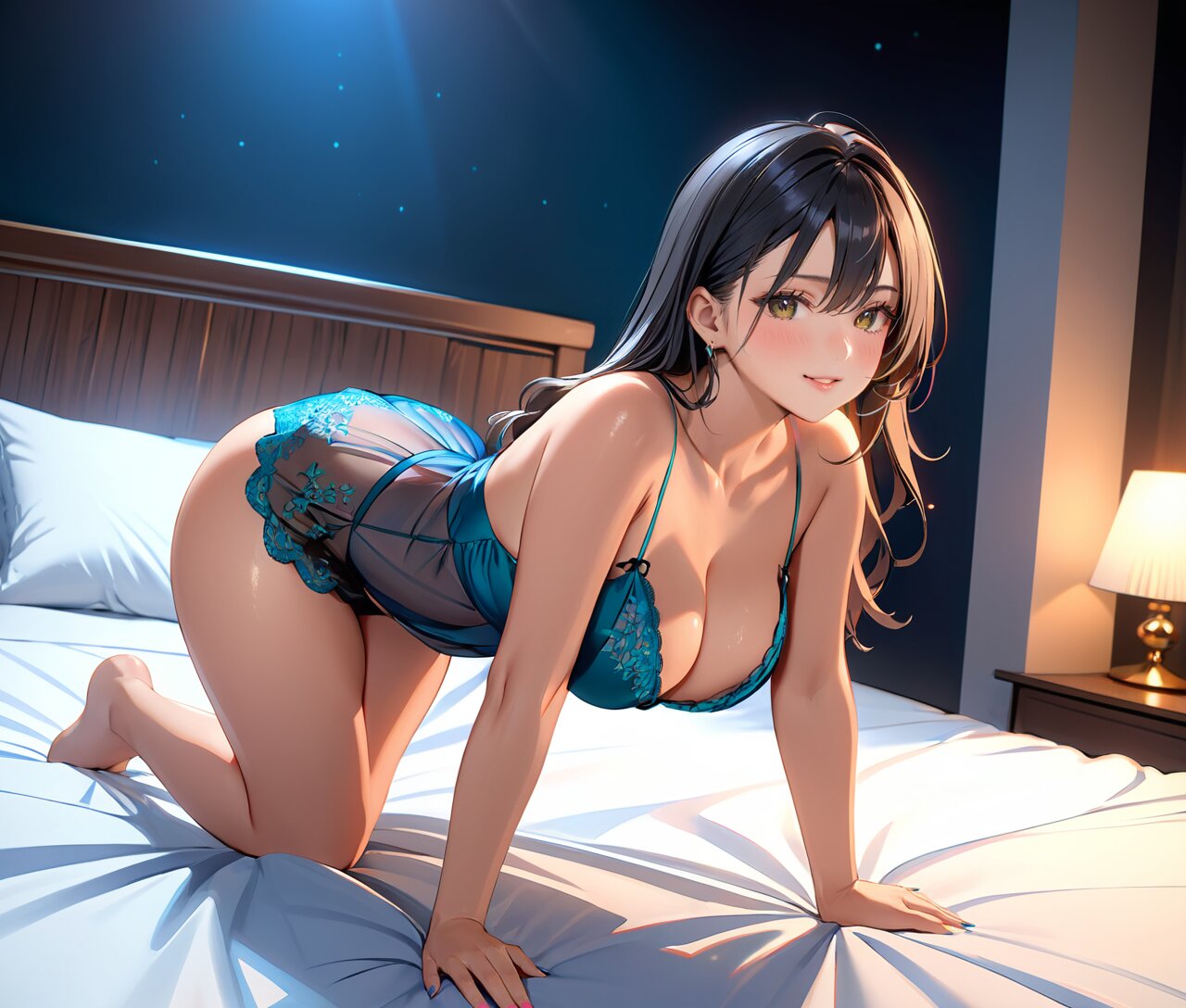 (from back: 1.2), perfect anatomy, (masterpiece:1.3), (best quality:1.3), (ultra-detailed:1.2), 8K, HDR, (incredibly absurdres:1.2), (vibrant color:1.2), 1girl, solo, 22 years old, (perfect body, sexy solid color lace negligee: 1.6), plump, black hair, on back, (full body, sexy posing: 1.8), (huge breasts, big ass: 1.2), (an extremely delicate and beautiful hands), nails, beautiful detailed ears, (intricate detail), highly detailed, beautiful detailed eyes, beautiful detailed glow, detailed light, shiny skin, shiny hair, (on all fours on bed, in the dark bedroom: 1.8), <lora:fujikoM_v01:1>
