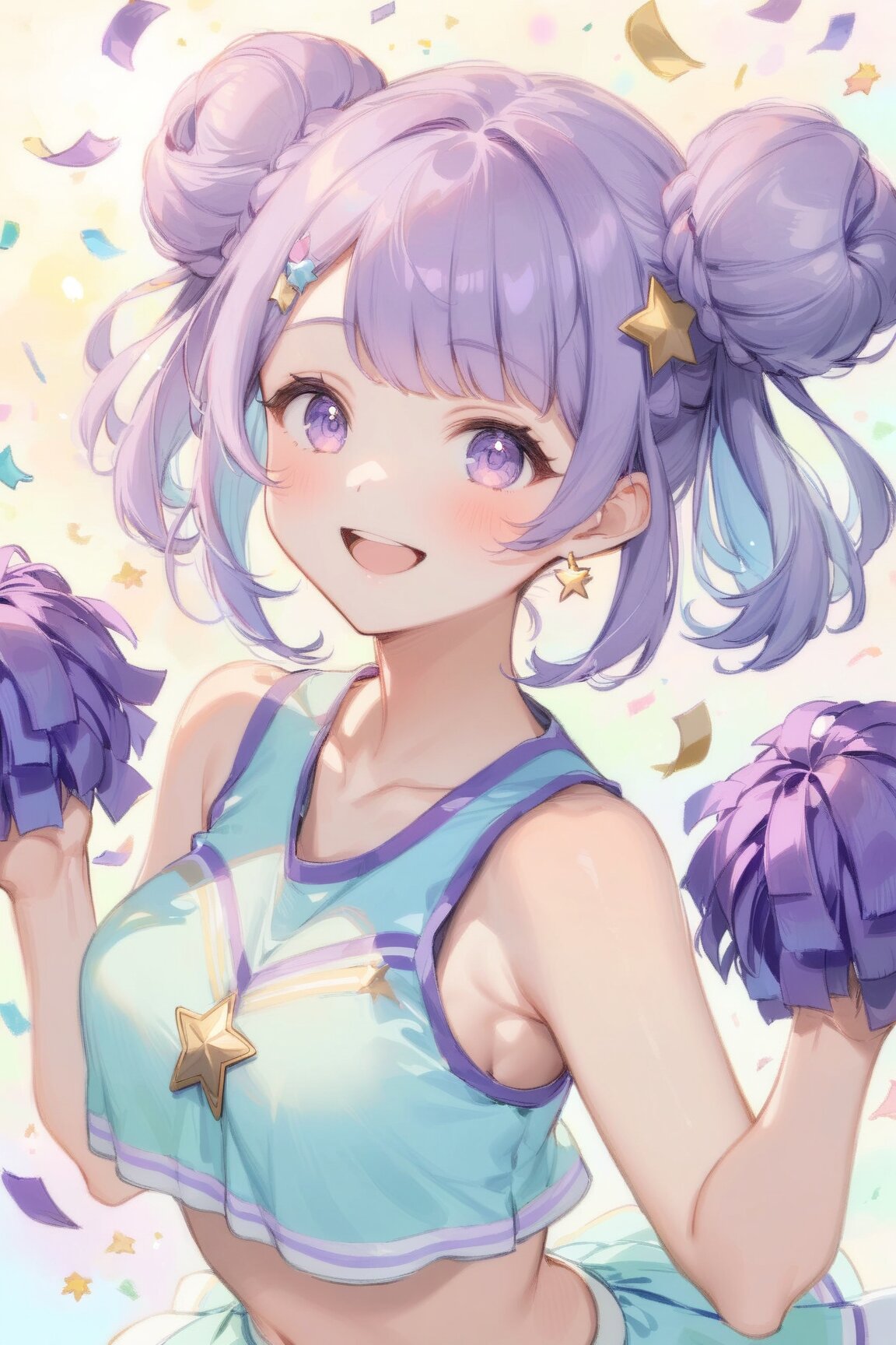 masterpiece, best quality, solo, upper body, slightly top-down angle, looking up at viewer, cheerful energetic expression, open-mouth smile, big sparkling purple eyes, soft blush, twin bun hairstyle with long side strands, long purple hair with light blue inner highlights, star-shaped hair accessory near buns, pastel cheerleader uniform, frilly crop top with star emblem, holding pastel pom-poms near shoulders, soft sparkles, floating confetti, warm golden sunlight, soft shadows, cute Friday cheer energy, dreamy soft background, masterpiece, best quality, soft pastel color palette, thin delicate lineart, pale colors, watercolor texture, matte finish, subtle shading, minimal contrast,