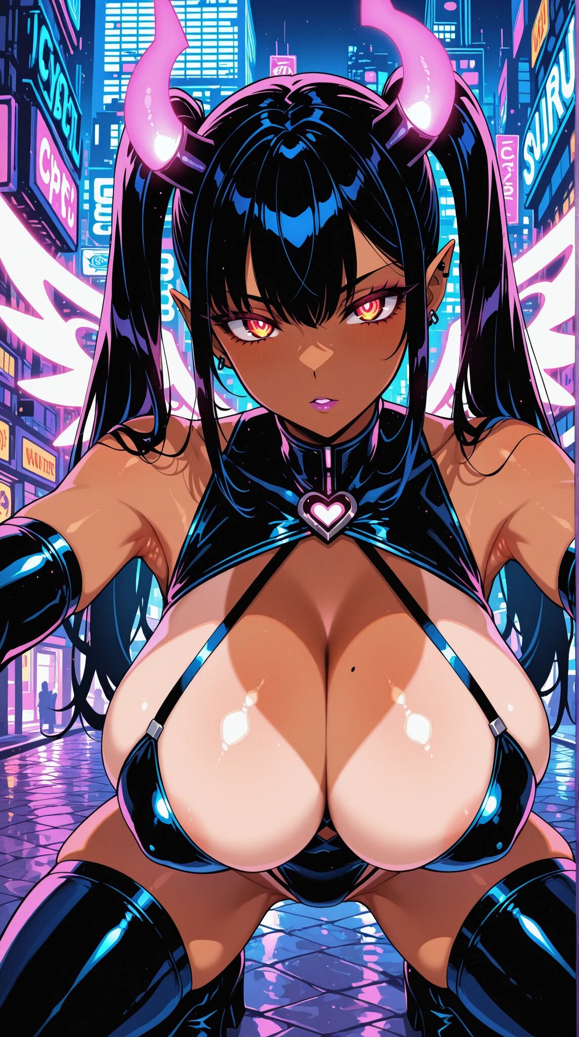 masterpiece, cyber succubus, glowing wings, tanned skin, huge breasts, provocative stare, neon city background, hovering pose, twin tails