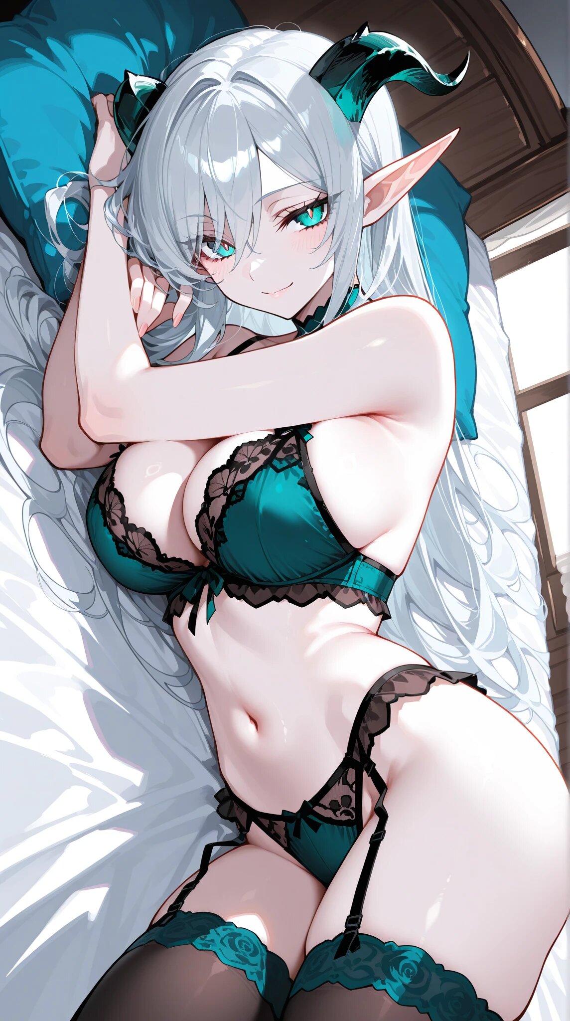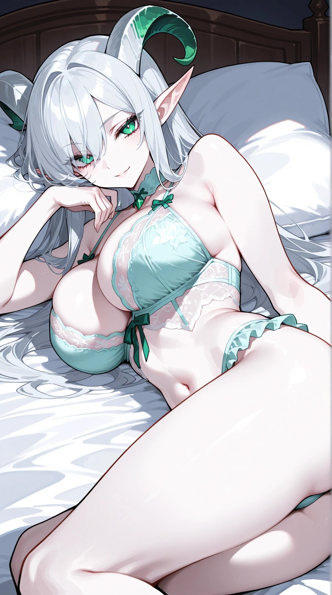 masterpiece, horned elf woman, pale skin, lingerie outfit, big breasts, seductive expression, bedroom scene, lying on side, short silver hair, looking at viewer