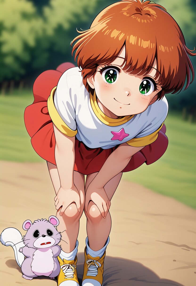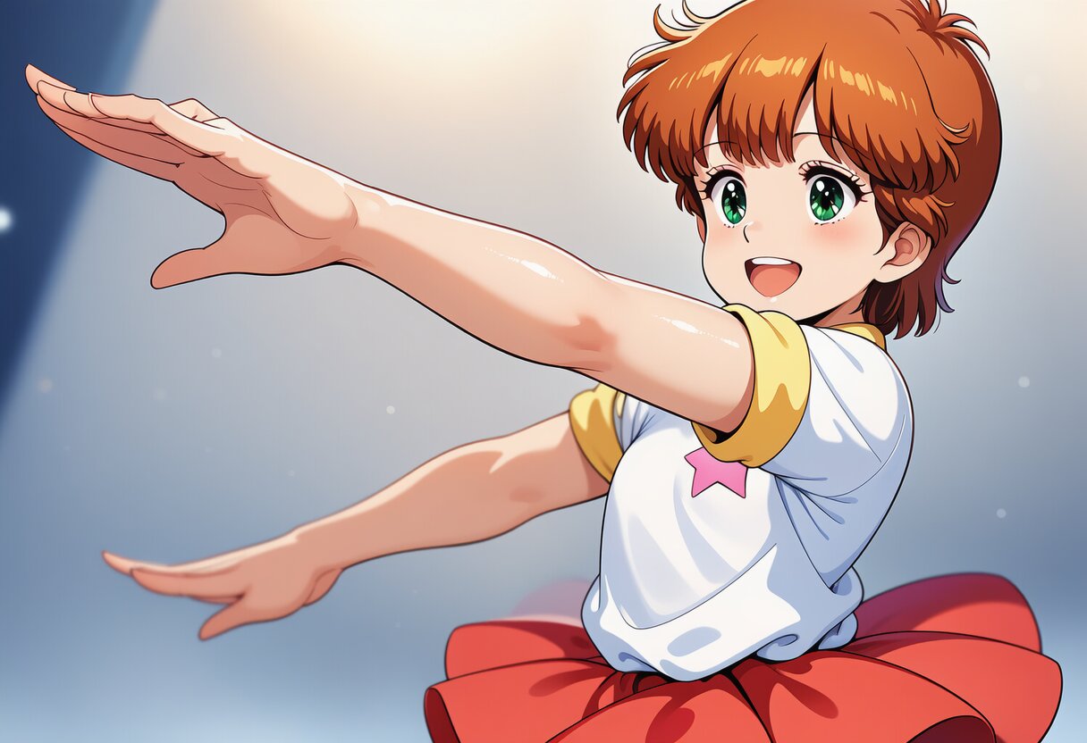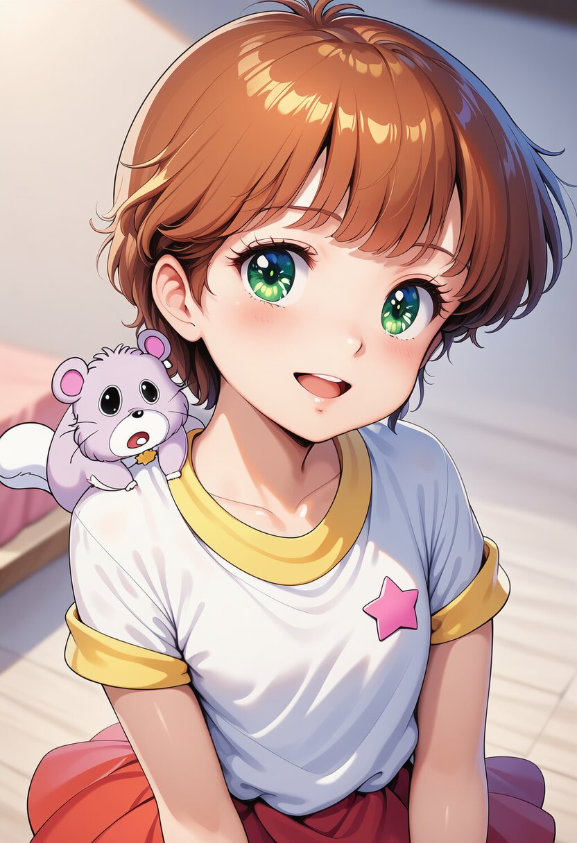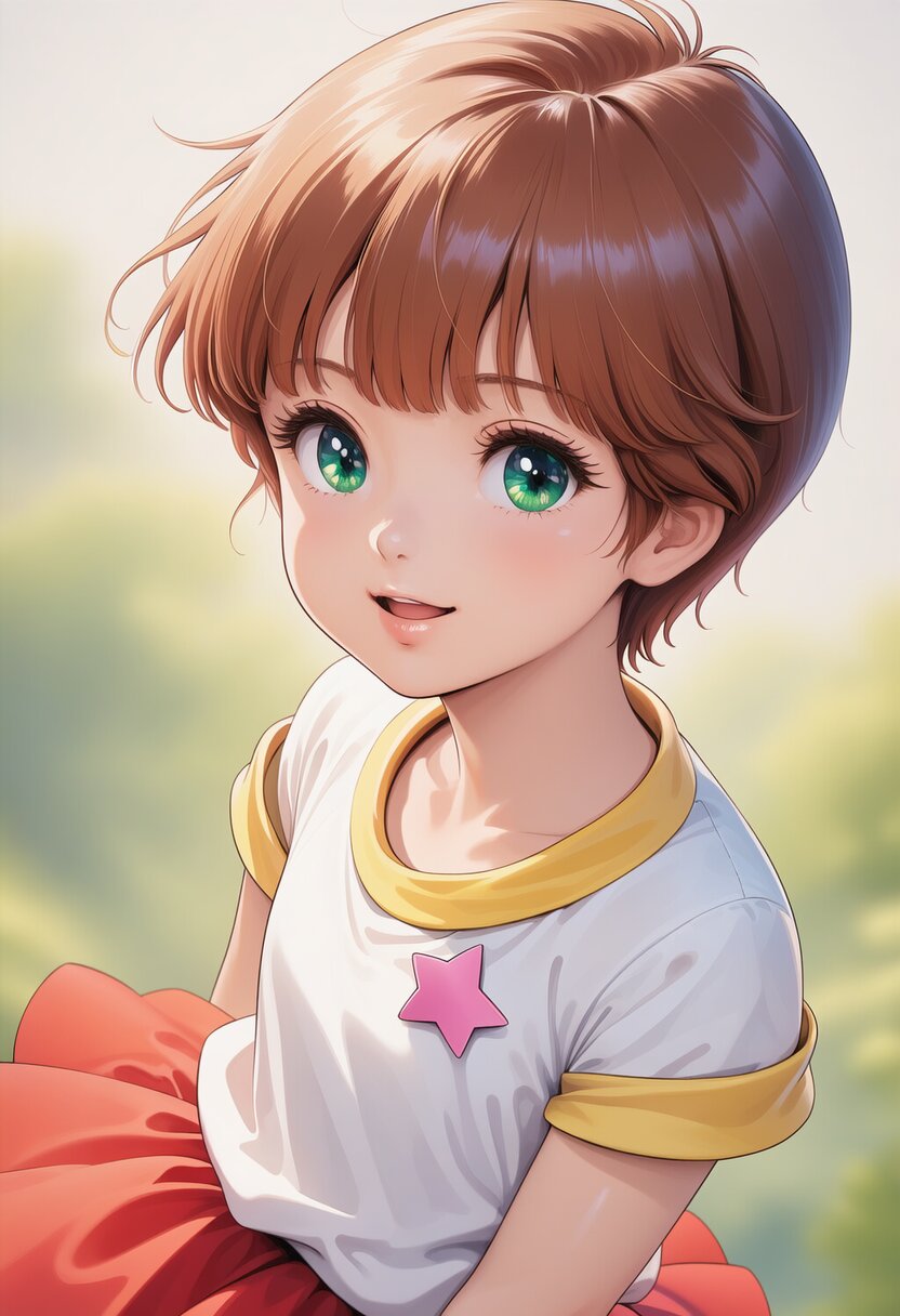{{{1girl}}},shiny skin, detailed face, Japanese idol, beautiful face,{{{{{game cg,illustration,madeon,masterpiece,taste of japanese anime in 1988,ai-generated,official style,mahou no star magical emi,katsuki mai(mahou no star magical emi),topo(mahou no star magical emi)}}}},{{ideal ratio body proportions,no breasts,flat chest}}, {{5 years old female child,beautiful girl.no chest,no breastsl}},{{white shirt,red flared mini skirt,star shaped pink button,costume of katsuki mai(mahou no star magical emi)}},{{{beautiful detailed eyes,cute eyes,eyelashes,twinkle eyes,emerald eyes}}},{{{{{{brown hair,short hair}}}}},{{simply background,blurry background}},{{{{cinematic angle,open mouth,light smile,upper body}},rating:general, location, very aesthetic, masterpiece, no text