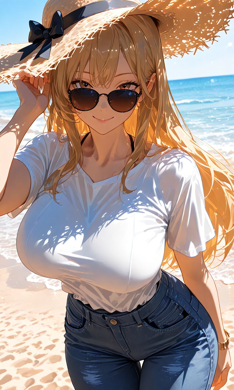 1 lady, long hair, blonde hair, sunglasses, cool, straw hat, (White Tshirt, jeans), big breasts, beach, smile, cowboy shot,