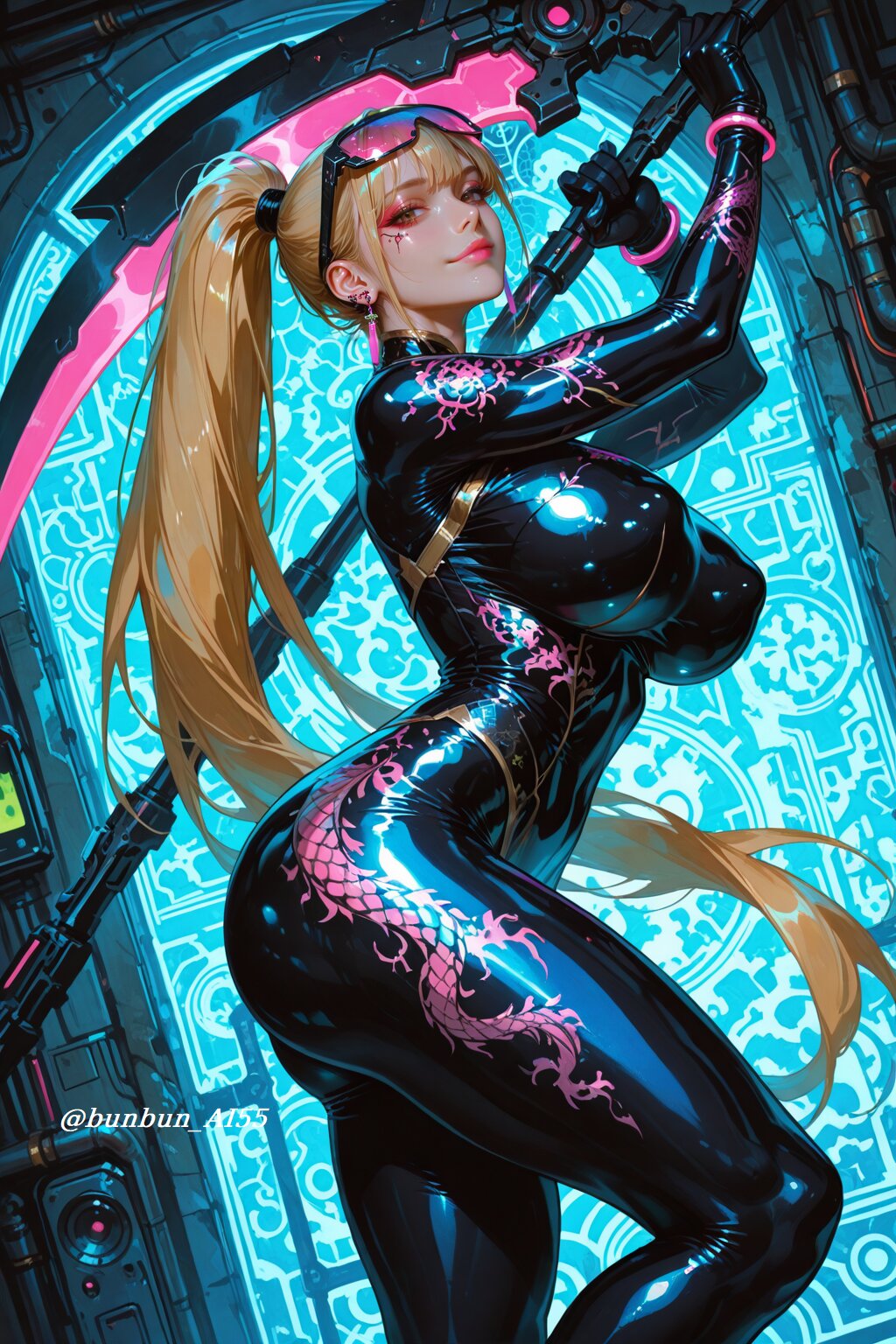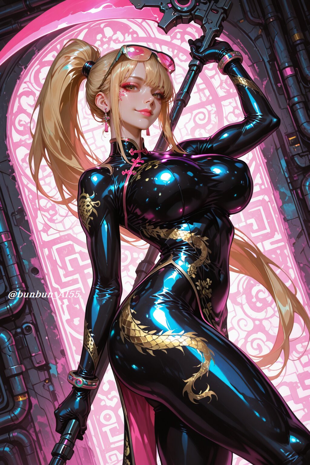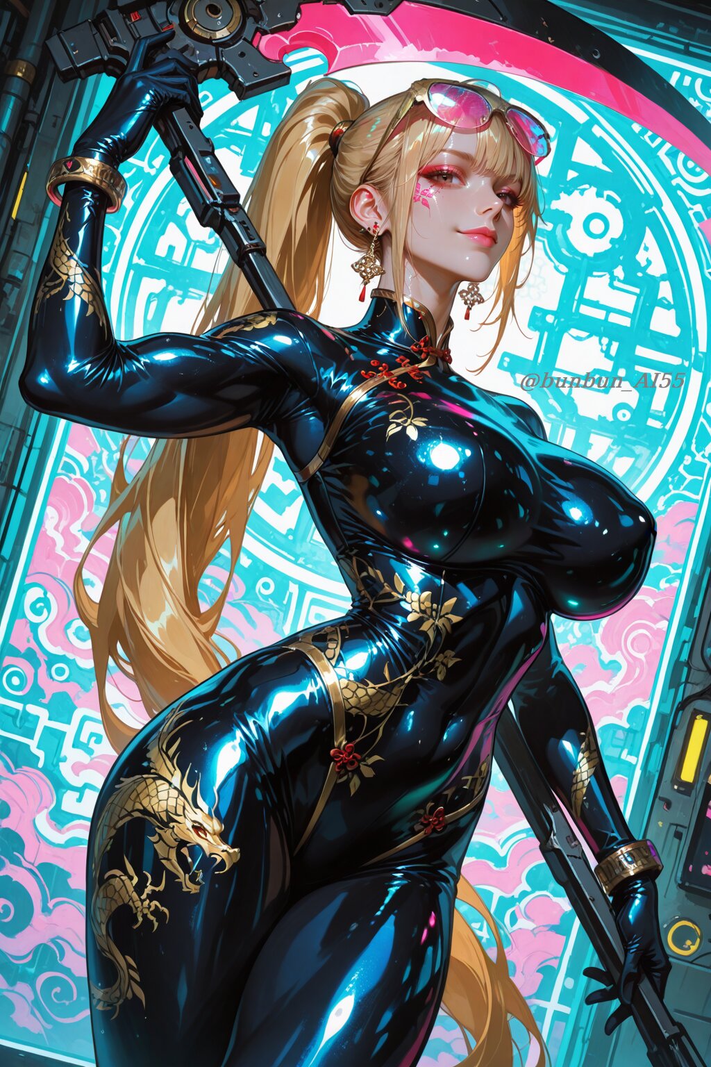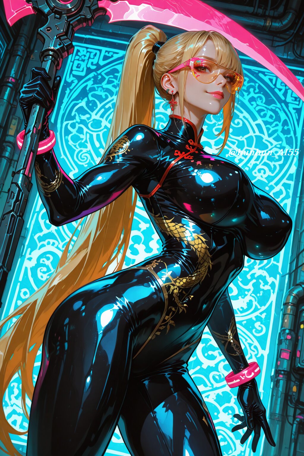 HDR, 8K, best quality, amazing quality, very awa, very aesthetic, absurdres, newest, realistic eyes, realistic body, (realistic, hyperrealistic), highres, hyper detail, add detail, sharp detailes, anime style, illustration, cyberpunk art, BREAK perfect lighting, professional lighting, (1girl, beautiful girl:1.5, 20year old), (sexy, model, kawaii), (brown eyes, chinese makeup, pink lips), (looking at viewer, seductive smile), BREAK (blonde very long ponytail:1.5), (stylish cyber eyewear), (jewelry, piercing, earrings, bracelet), nsfw, (huge breasts, pointy breasts),(long legs, muscle leg:1.2), (perfect hands), (shiny skin, glossy skin), (super model body:1.2, slim body, athletic body:1.2, muscle body:1.2), BREAK (wearing a china dress-style bodysuit with dragon design pattern), (bodysuit, spandex), (latex gloves), (light reflections), (shiny, glossy, luster, latex), (tight fit), BREAK (standing pose, holding a gigantic scythe, fighting pose, dynamic pose, elegant and powerful), (cyberpunk chinese pattern background, ornate patterns, traditional art, vibrant colors, cyberpunk setting), (from a diagonal view), (face focus shot:1.3, bust-up shot:1.3, upper body shot:1.3, medium shot:1.2, dynamic angle, dutch angle),