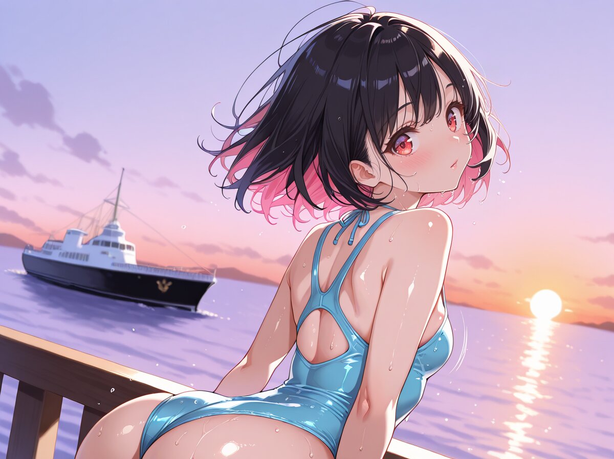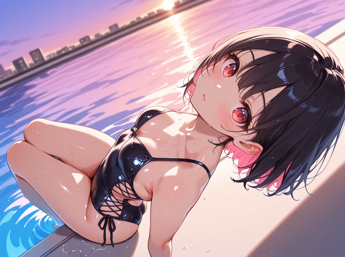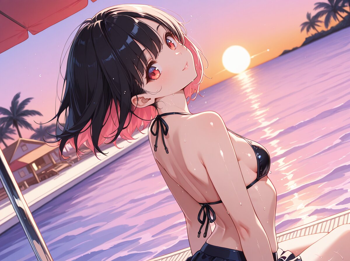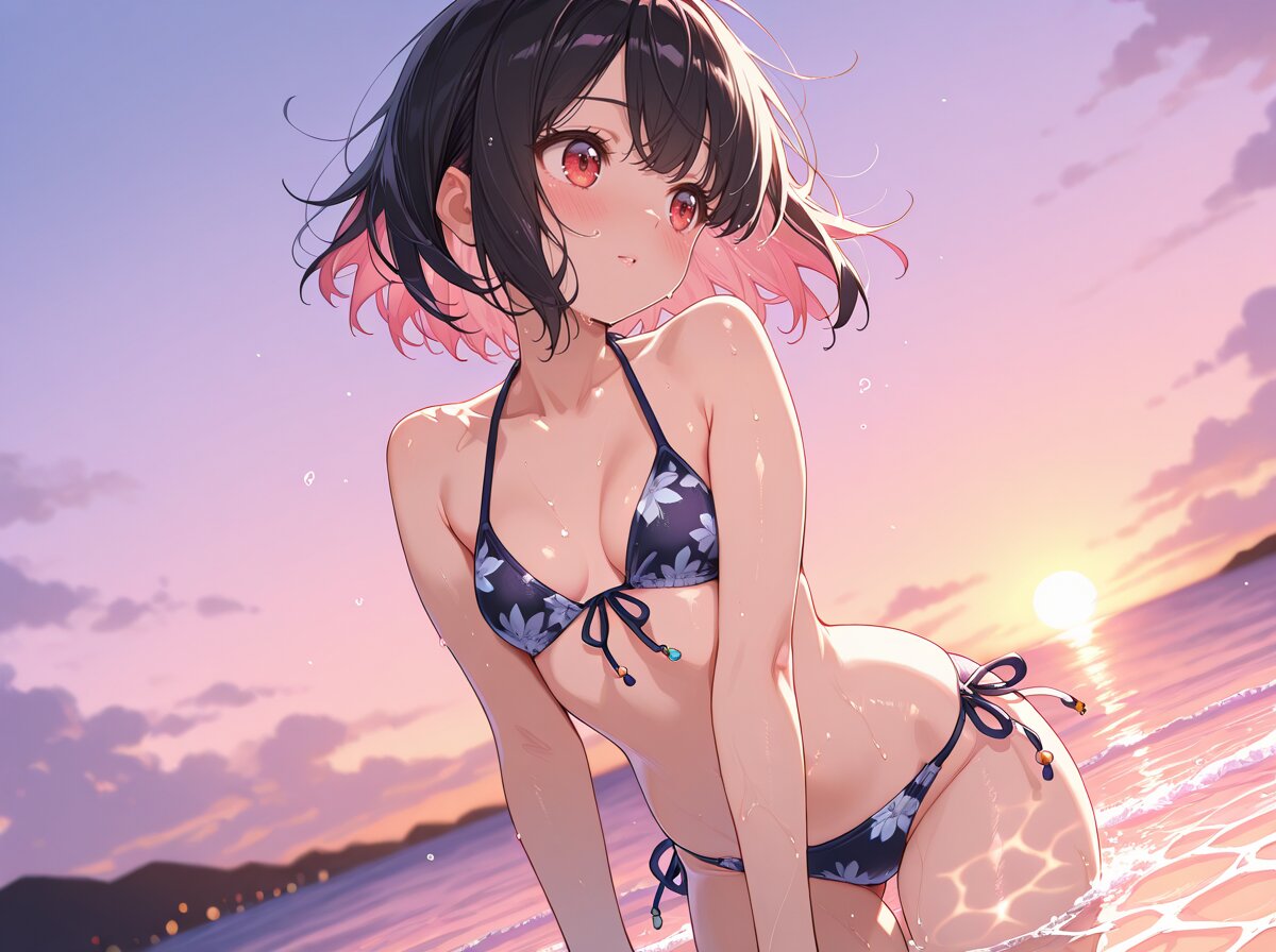 (NSFW:1.2), solo, 1 girl, (16 YO:1.5), kawaii, (red color eyes:1.2), (tareme:1.2),(big eyes:1.2), (black hair), (pink inner hair), bob hair, bangs, pink lips, short stature, (small breasts), (curvy:1.2), (glistening skin:1.5), embarrassed, blushing:1.1 , BREAK wet bikini, high neck swimwear BREAK (look away:1.3) , (sexy pose:1.2) , (head tilt), from above , sideways , profile, bend over , sunset, backlighting BREAK on crowd beach , BREAK (masterpiece:1.5),(8k,4k,best quality, very aesthetic, ultra-detailed:1.8), (pastel colors:1.5), (game CG:1.2), (Smooth skin), (ultra highres), (Extremely detailed face),(Extremely detailed eyes), (cute:1.5), (depth of field:1.3), (soft-edged:1.2), (soft lines:1.2) (cinematic angle:1.3), (dutch angle:1.4),(ambient light:1.2), (bloom:1.3) (high brightness, high saturation, soft contrast:1.3), (erotic atmosphere:1.5), <lora:illustrious_style_pastel_colors_v1:1><lora:detailed_notrigger:1> <lora:Expressive_H:1>, <lora:privet-part:1>