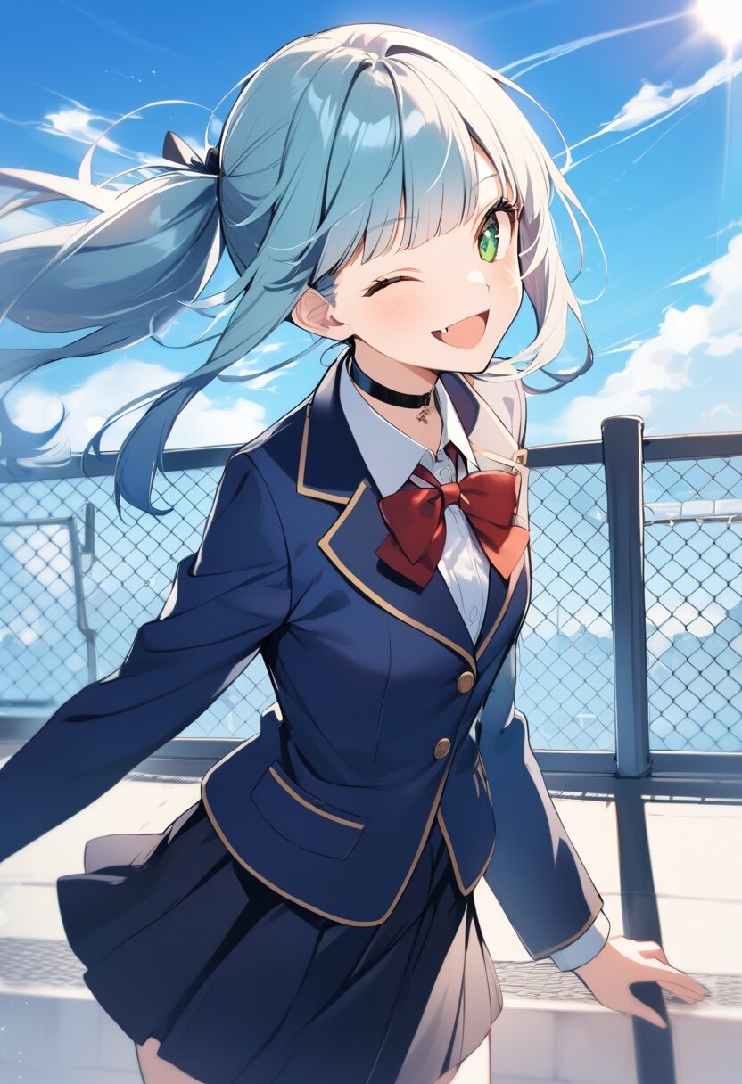 1girl, solo, 15years old, looking at viewer, long hair, light blue hair, blunt bangs, twintail, green eyes, jewelry, choker, blue blazer, red bowtie, collared shirt, dark blue straight skirt, white socks, brown loafer, arched back, one eye closed, smile, fang, noon, sky, sunsine, wind, standing, rooftop, fence, chain-link fence,