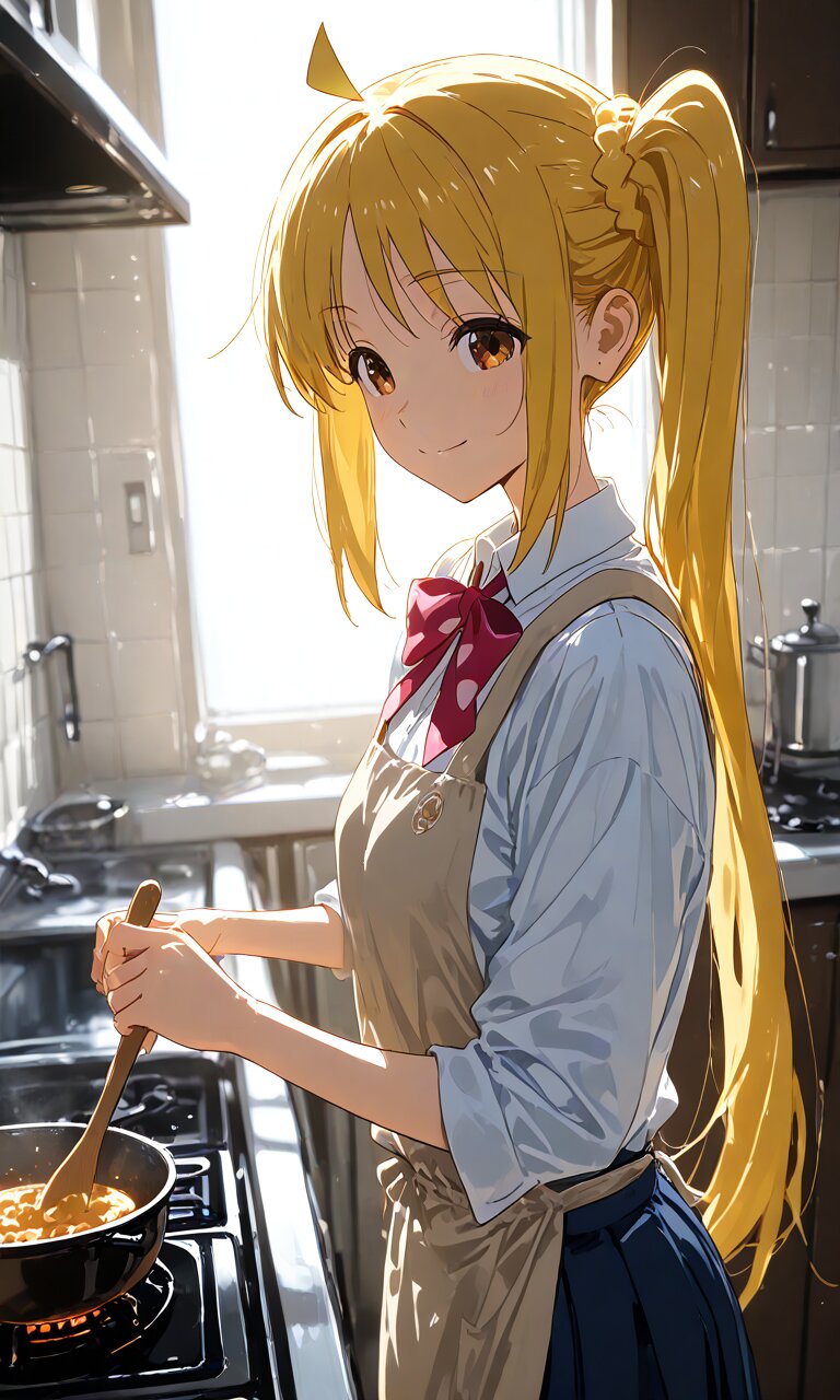 1 girl, school uniform, (cooking), kitchen,side view, smile,nijika ijichi, ahoge, yellow hair, brown eyes, long hair, side ponytail,