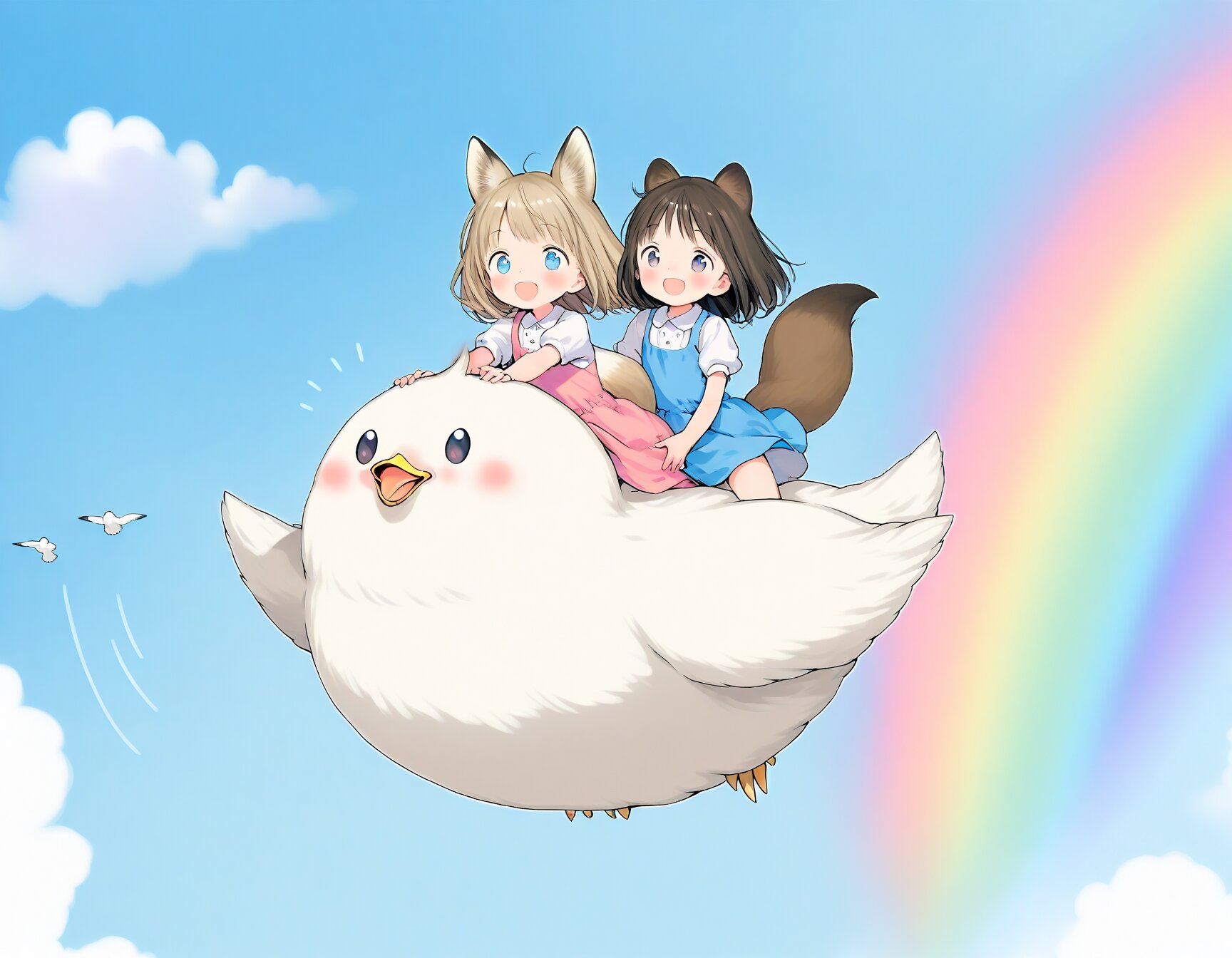 2girls, loli, riding on a giant fluffy round white bird, flying in the sky, fluffy clouds, big rainbow in the background, pastel colors, soft shading, whimsical, storybook style, dreamy atmosphere, traditional media, (colored pencil drawing), pastel colors, soft tone, (blurred boundaries, drawing lines, Paper texture), cute, deformed, ultra-detailed background, (oyari ashito:0.1), (barasui:0.1), (masterpiece, best quality, amazing quality), dynamic pose, dynamic angle, dynamic composition, cowboy shot, BREAK fox girl, loli, light brown hair, medium hair, bangs, blue eyes, (light brown fox ears, Light brown fox tail with white tip, petite), pink pinafore dress, smile, happy, BREAK raccoon girl, loli, dark brown hair, short hair, messy hair, bangs, (green eyes), tareme, (dark brown raccoon ears, dark brown raccoon tail with striped pattern), green pinafore dress, laughing, happy, BREAK giant fluffy round white bird, flying in the sky, fluffy clouds, black round eyes,