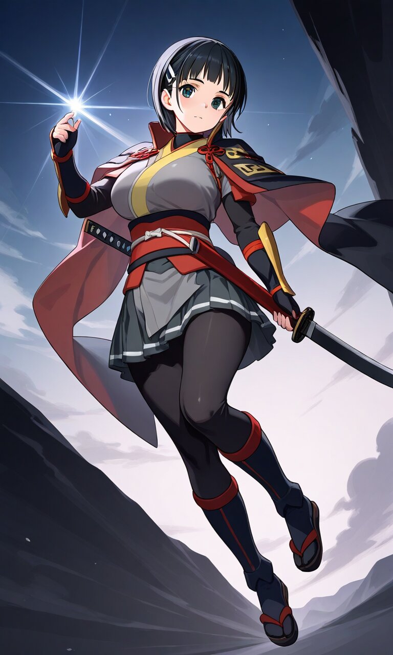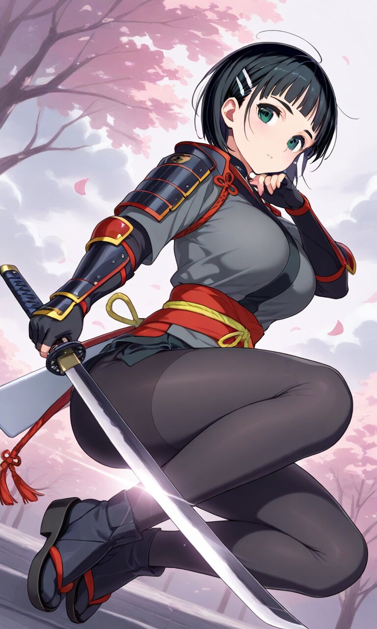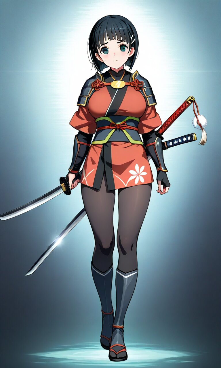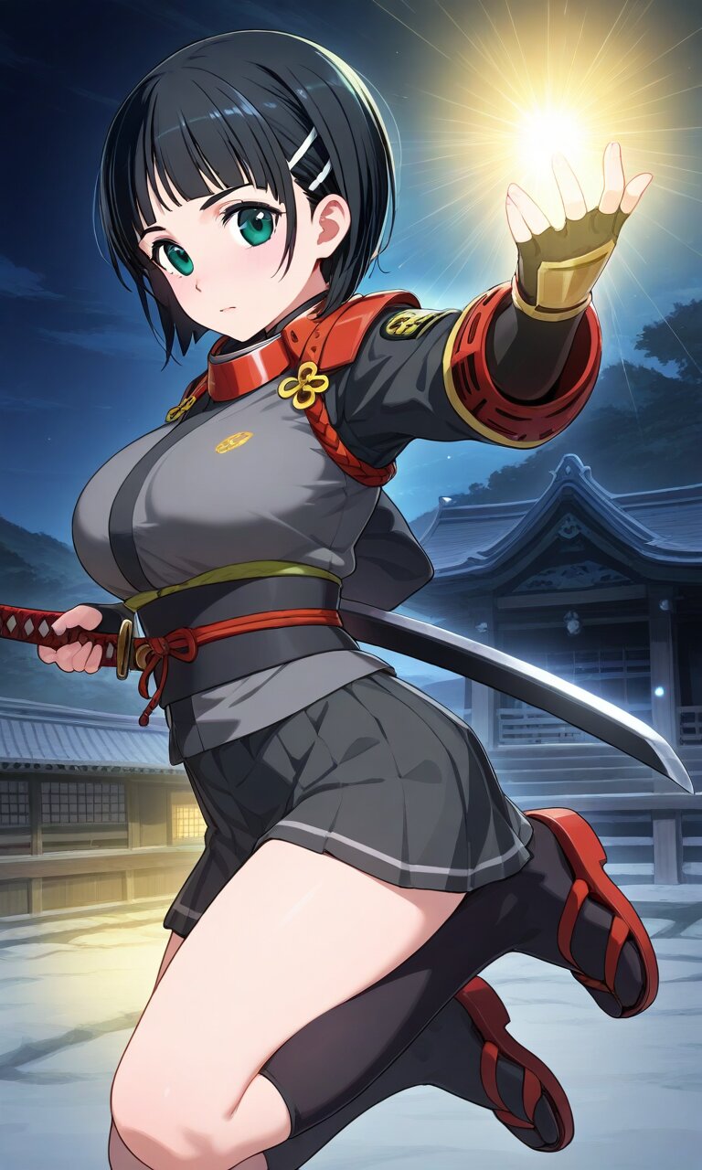 suguha, short hair, hairclip, large breasts, best quality}, {very aesthetic}, {ultra-detailed}, {best illustration} nsfw, perfect hands, perfect face, perfect eyes, perfect light, dynamic light, natural light, full body Onimusha gauntlets, Japanese sword