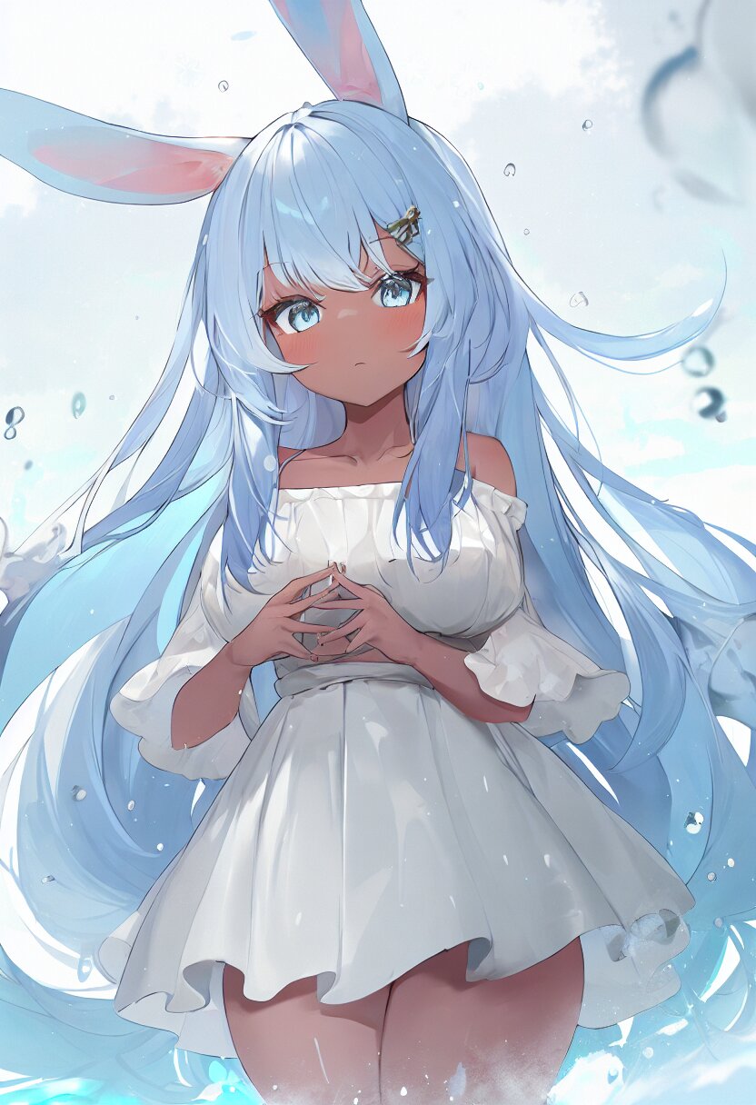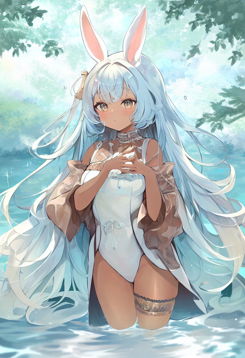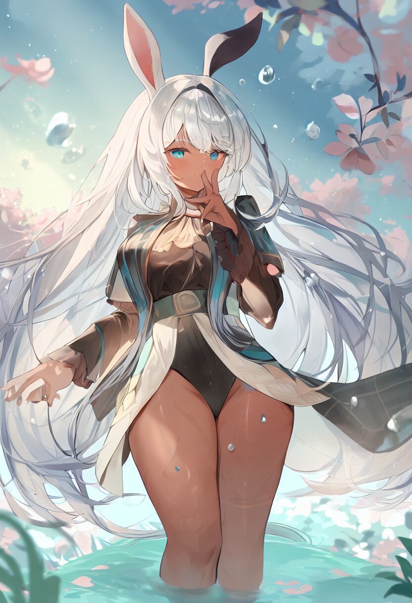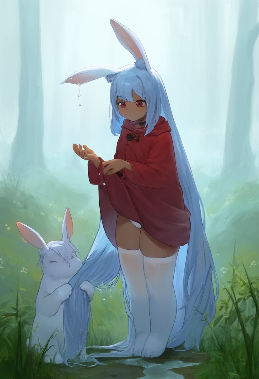 very aesthetic, best quality, absurdres, A girl with dark skin and absurdly long blue hair adjusts her red surcoat while standing in a misty meadow. Her companion, with rabbit ears and thick thighs, runs playful fingers through her light blue hair. The soft morning light and glistening water drops create a serene and enchanting mood.