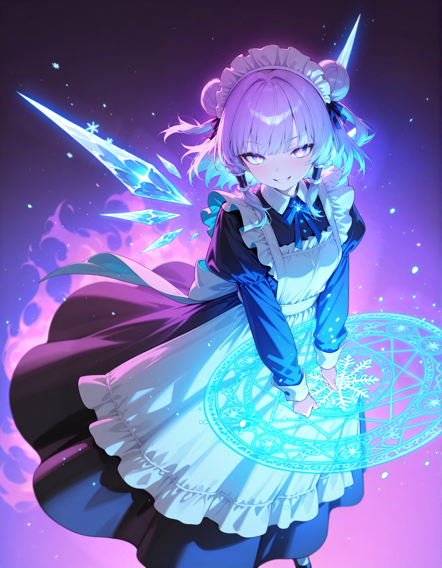 (fisheye,fisheye lens angle:1.0), High Horizon (absurdres absolutely resolution:1.2),texture, official art, ultra detailed, unity 8k wallpaper, dark theme, (simple light purple background:1.2), drop shadow, colored shadow, 1girl, (ultra-detailed), solo, maid, pale skin, chest length hair, bun with braided base blunt bangs , hair tubes, pale light purple hair, (beautiful slit pupils, naughty face:1.0), long sleeves classic maid uniform, long skirt, maid headdress, maid apron, luminous effect lens flare lotion shiny-glistening cute girl solo front view, (blizzard aura, ice wings, snowflakes:1.1), (ultra detailed floating glowing magic circle:1.2), (high saturation) depth of field, bokeh, super fine concept art, hard surface, 8K, unreal engine, newest, masterpiece, best quality, amazing quality, very aesthetic, absurdres, you can add scenery, (volumetric lighting), To make the background more distinctive. professional art lots of details, , overexposure, shiny-glistening, (watercolor style:0.0), (pastel color style:0.0) 4ur4_illu,shiny, glowing, glowing particles, glowing light particles, light particles, flame light purple, <lora:noline (1):-0.5> <lora:sdxl2-flat2-512b:-0.2> <lora:facelightup_xl_v10:0.5> <lora:V2_yakumo_alchemy:0.5> <lora:Aura_illu:0.1>