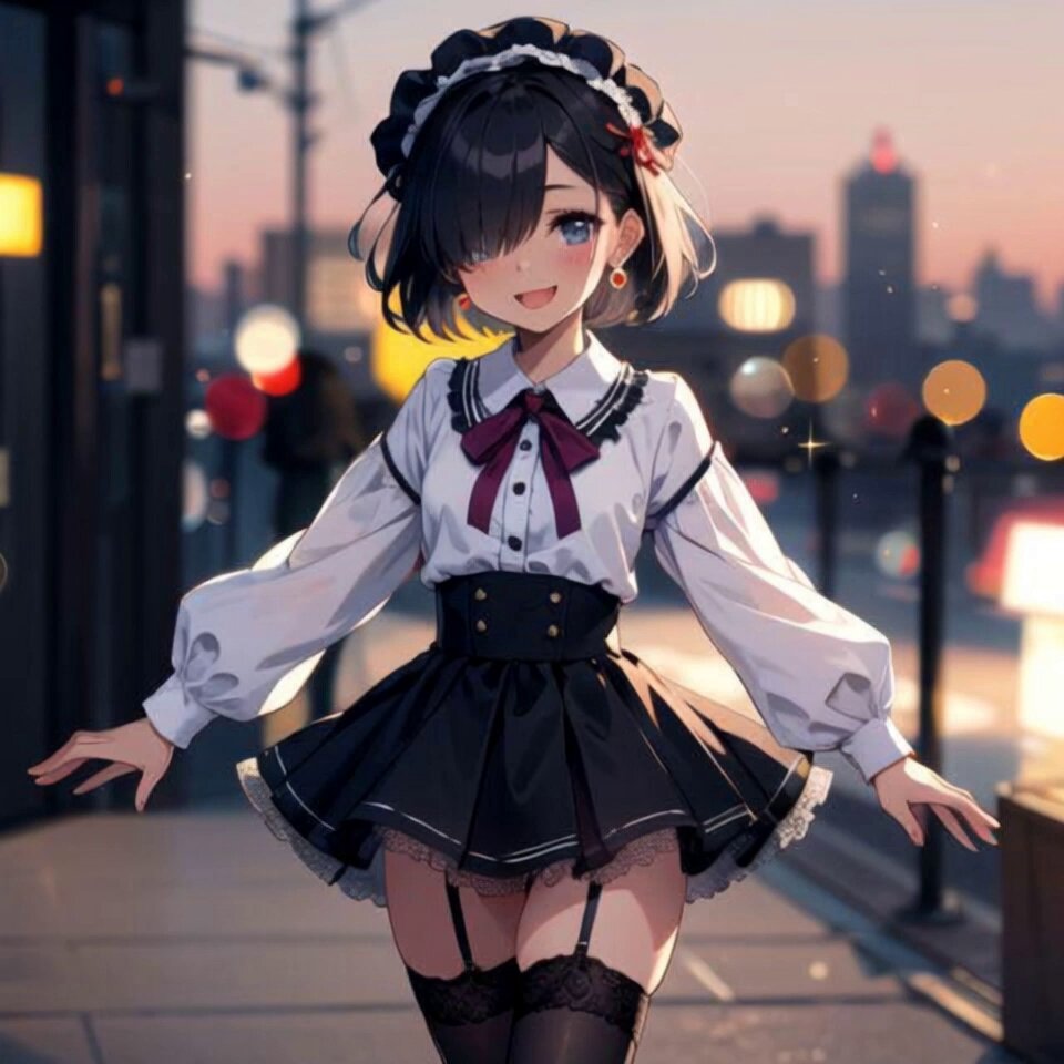 little_girl,loli,kawaii,bishoujo,lolita,miniskirt,lace_skirt,ribbon-trimmed_skirt,thighhighs,garter_straps,leg_garter,leg_ribbon,fluffy,heart_earrings,maid_headdress,:d,hands_on_headwear,dusk,castle,city,hair over one eye、aroused、early teen、dark skin、solo、black hair、short hair、tareme、1girl、blurry background、