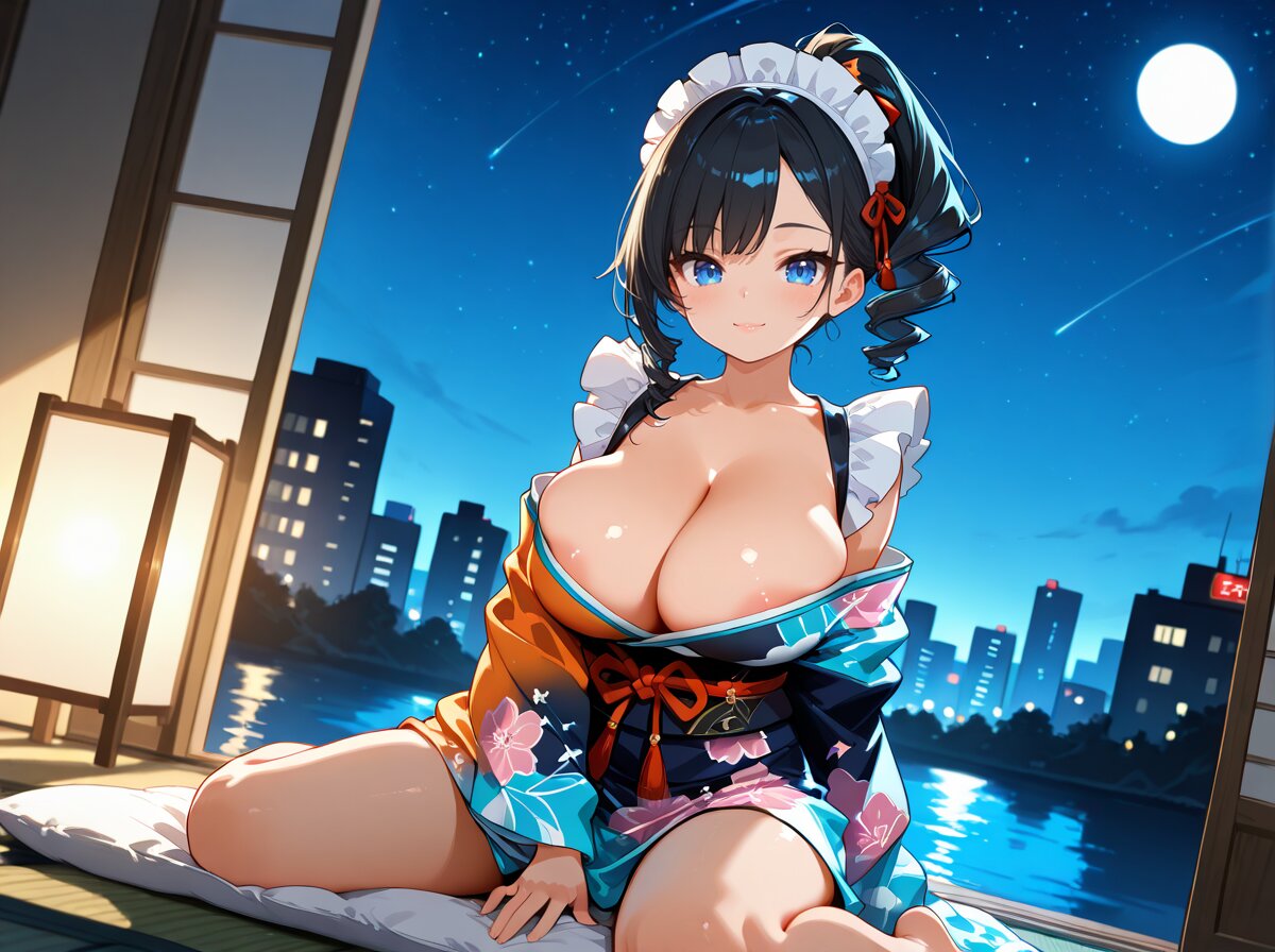 (NSFW:1.3), (1 girl:1.5), (17 YO:1.2), (kimono maid :1.3), (Various color kimono maid costume:1.4) pigtail hair, hair over one eye, voluptuous , (bursting breasts:1.2), (kawaii:1.1), (tsurime:1.2),(big eyes:1.2), (black hair), pink lips, (glistening skin:1.5), BREAK (smile) (looking viewer), BREAK (stylish poses:1.5) :1.5), bent over BREAK (tatami floor:1.4) (futon), indoors, night time, (starry sky, moon:1.3), window, (old city neon light:1.3), (backlighting:1.5) BREAK from side , back shot , wide shot, BREAK (masterpiece:1.5),8k,4k,best quality, very aesthetic, (ultra-detailed:1.7), (pastel colors:1.4), (flat colors:1.8), (Smooth skin), (ultra highres), (Extremely detailed face),(Extremely detailed eyes), (cute:1.5), (blurry foreground:1.5), (blurry background:1.5), (ultra-detailed-background), (depth of field:1.3), (soft-edged:1.2), (soft lines:1.2) (cinematic angle:1.3), (dutch angle:1.4),(ambient light:1.5), (cinematic lighting:1.5), (bloom:1.1) (high brightness, high saturation, soft contrast:1.3), (erotic atmosphere:1.5), <lora:illustrious_style_pastel_colors_v1:1><lora:detailed_notrigger:1> <lora:Expressive_H:1>, <lora:privet-part:1>