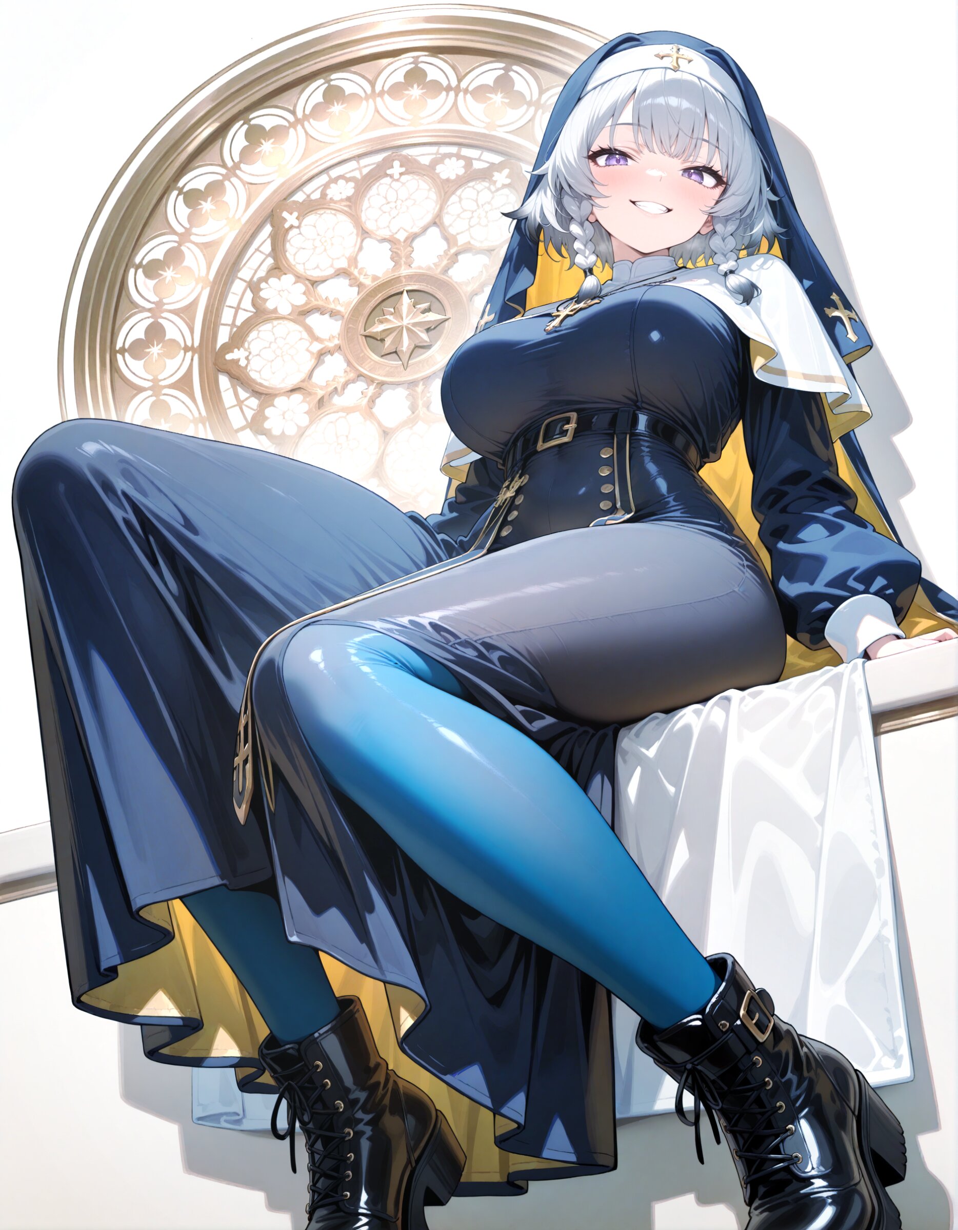 from behind, thrust out one's hip, looking back (close up:1.0) (from below,looking down:1.2) POV, looking at viewer, (simple transparent background:1.1), drop shadow, colored shadow, 1girl, priest, beautiful detailed eyes, holy face, cool Elegant and sophisticated demeanor, (redness skin:1.0), skindentation, beautiful sepia eyes, , silver hair, grey colored tips, short hair, side braids,fanged bangs , airy hair, first-rate female bodies perfect body beautiful framed breasts wide hips, ,, solo, nun, Good texture Mystical Veil, gold simple cape, cloak, white divine Pulpit gown, long sleeves, the feel of silky, , belt buckle, chest belt, , , , high-waist skirt, long skirt, blue high-waist pantyhose, ankle boots, shiny smile, (seductive grin:1.0), reclining, super fine concept art, unreal engine, graceful eyes, masterpiece, best quality, amazing quality, very aesthetic, absurdres, newest, professional art lots of details, , overexposure, shiny-glistening, (watercolor style:0.0), (pastel color style:0.0) <lora:noline (1):-0.5> <lora:sdxl2-flat2-512b:0.0> <lora:facelightup_xl_v10:0.5>
