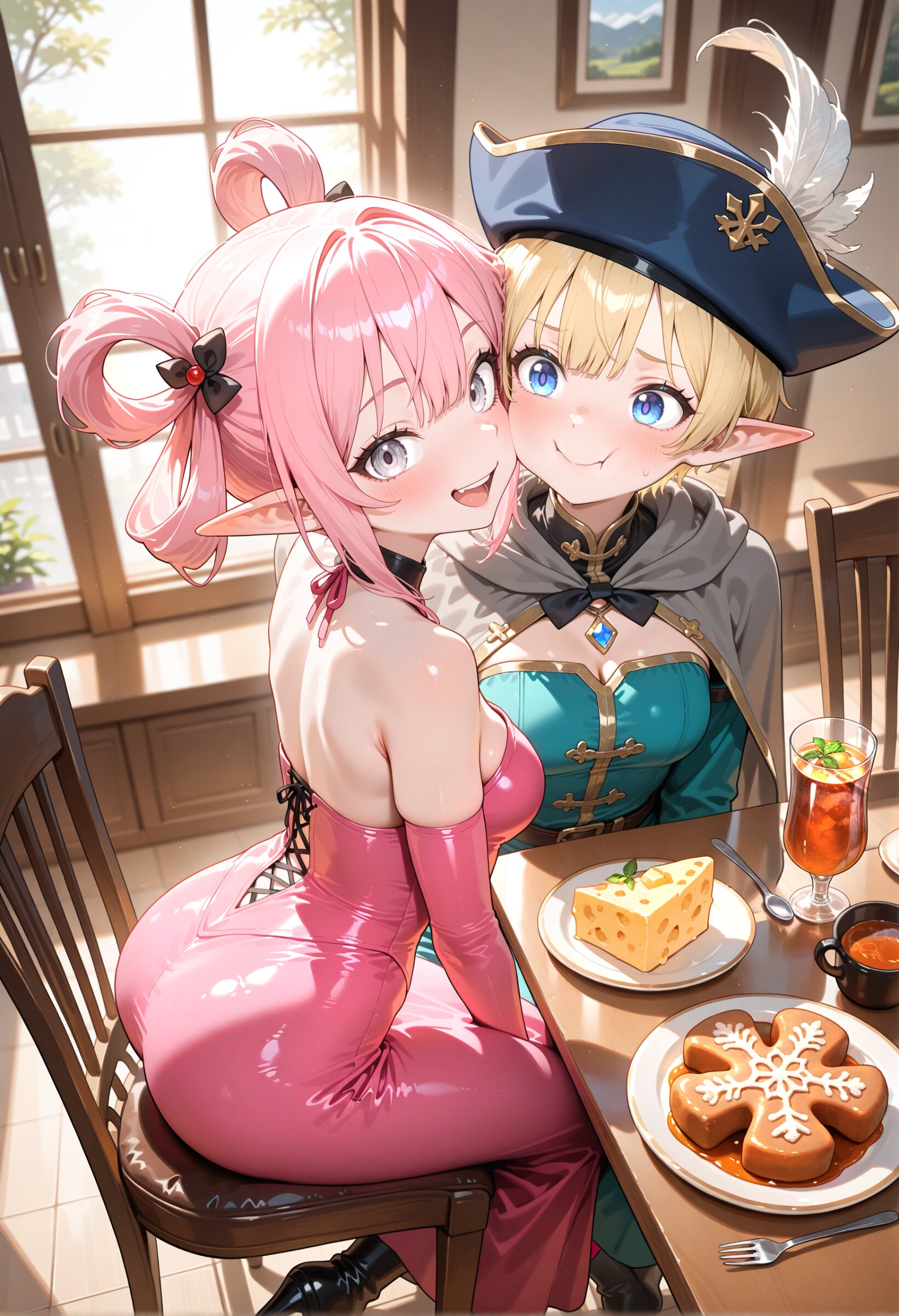 multiple girls, 4girls, (elf girls:1.2), , having a drinking party at a restaurant. (The restaurant's rooftop terrace offers breathtaking panoramic views of the forest and medieval fantasy town:1.0). They are seated around a square table, drinking, chatting, and enjoying their food. Please show their joyous expressions and the sense of camaraderie between them, (noon:1.0), soft natural sunlight, ((close up:1.0), cheek-to-cheek:1.1), from side, looking back, from above, , , perfect anatomy, with fork ,spoon, , eating gratin on pan, pork gingerbread on plate, , cheese, tomato on plate, professional anime art lots of details, , overexposure, shiny-glistening, (watercolor style:0.8), (pastel color style:1.2) you can add scenery, (volumetric lighting), To make the background more distinctive. super fine concept art, hard surface, 8K, unreal engine, masterpiece, best quality, amazing quality, very aesthetic, absurdres, newest, ambient occlusion, raytracing, <lora:noline (1):-0.5> <lora:sdxl2-flat2-512b:0.2> <lora:facelightup_xl_v10:0.5> ((close up:1.0), cheek-to-cheek:1.1), from side, looking back, from above, sexy elf girls sitting on Chinese-style chair,(redness skin:1.0), short hair, hair rings,hairline , shiny hair, insanely beautiful lightgray eyes, first-rate female bodies, perfect body, large breasts, small hips, (embarrassed:0.5), (drunkard, happy:1.2), ringed eyes,, mismatched pupils, upper teeth only, smile a little, fantasy pink leather full armor cuirass capelet high heel boots helmet , bare shoulders, looking at viewer, detached sleeves dynamic lighting, sunlighting, warm sunlight, (perfect anatomy:1.2), cute girls, extremely detailed, perfect face, perfect eyes, (depth of field),warm, 文字数制限により省略