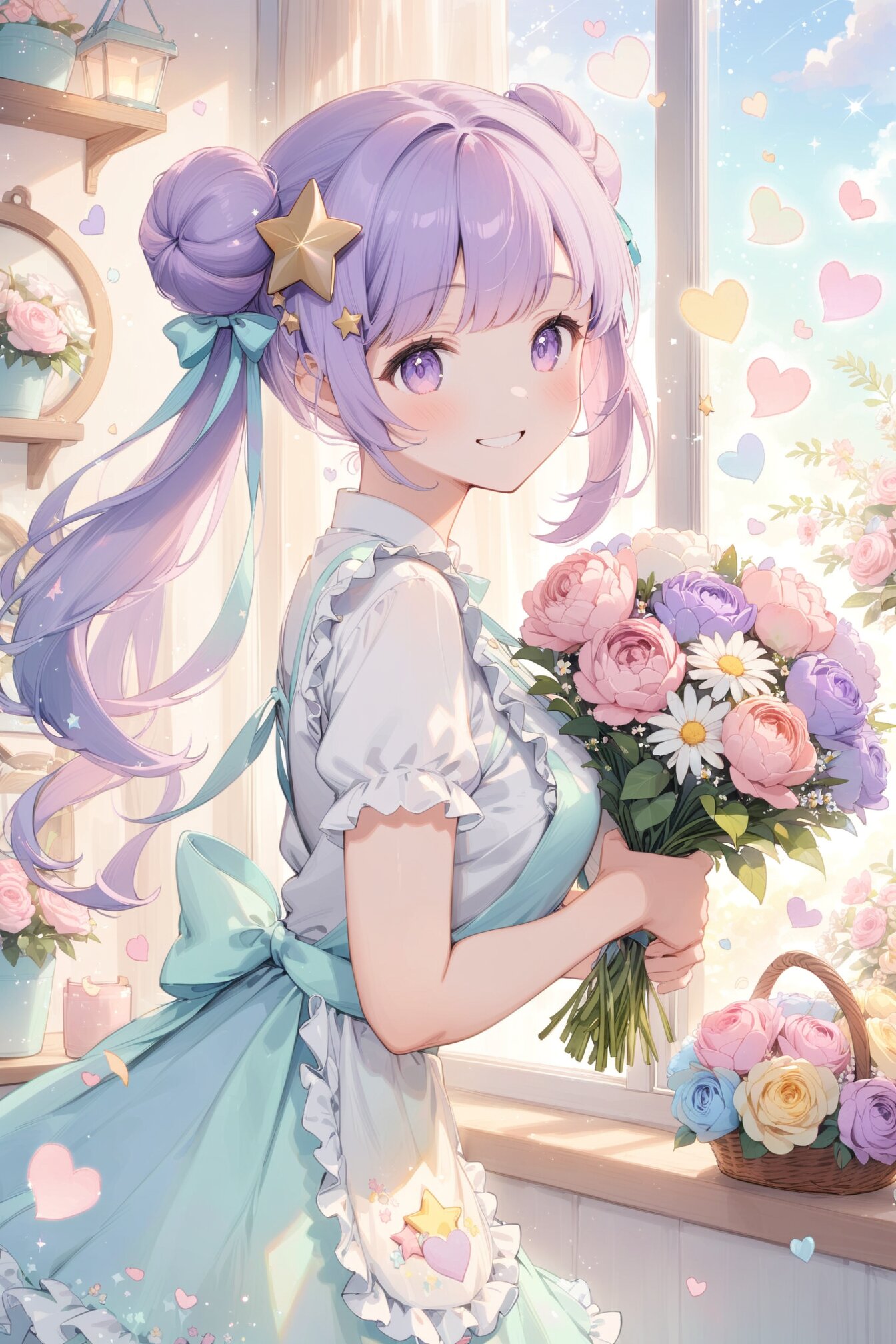 masterpiece, best quality, solo, upper body, slightly top-down angle, beautiful anime girl, cheerful gentle smile, sparkling purple eyes, long pastel purple hair with light blue inner highlights, twin bun hairstyle with soft trailing side hair, star-shaped hair accessory, pastel florist uniform with soft ruffled apron, holding a small bouquet of pastel flowers, flower basket on one arm, surrounded by blooming pastel roses, peonies, daisies, warm sunlight streaming through shop window, dreamy and colorful flower shop background, soft glow, floral particles, warm gentle atmosphere, yumekawaii aesthetic, masterpiece, best quality, soft pastel color palette, thin delicate lineart, pale colors, watercolor texture, matte finish, subtle shading, minimal contrast,, pastel color palette, soft glow, sparkles, floating petals, fluffy textures, star motifs, heart motifs, translucent fabric, soft frills, magical atmosphere, gentle light, dreamy background, faint clouds, cute accessories, subtle rainbow tones