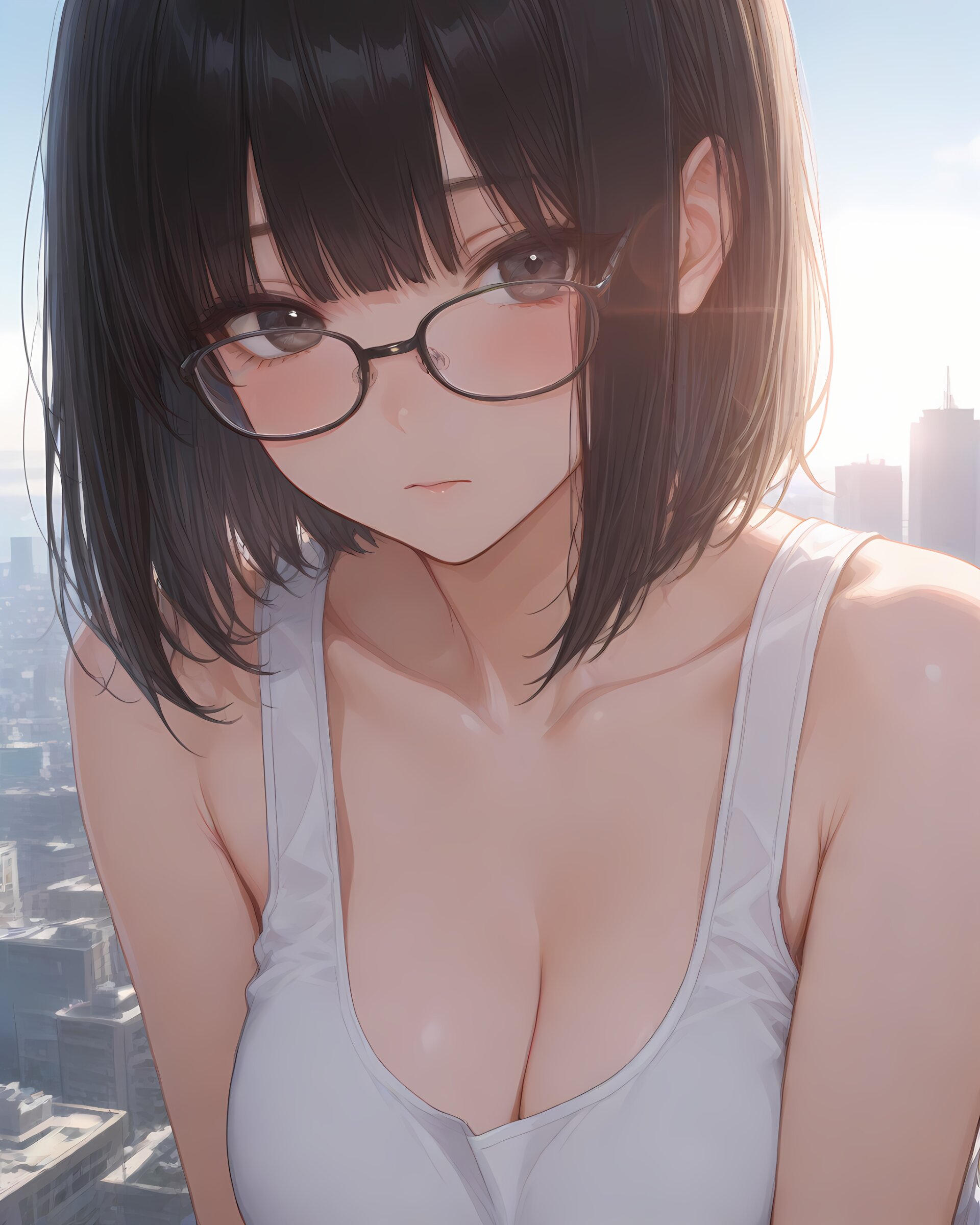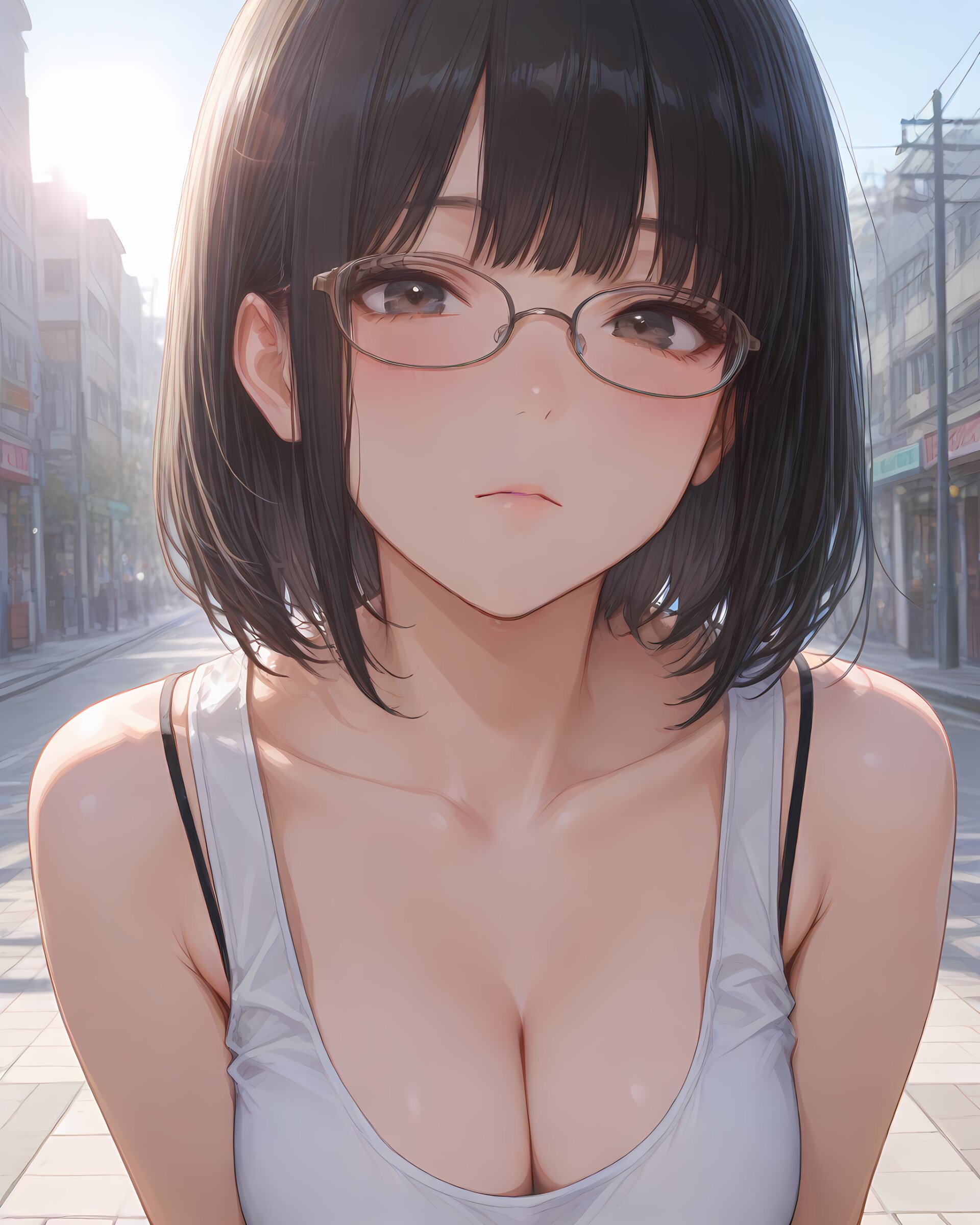 <lora:hyper_sdxl_8_step_lora_f16:1>,, 1girl, sidewalk, urban city, outdoors, day, sun, lens flare, close up, focus face, BREAK 18 years old, girl, short straight black hair, blunt bangs, large breasts, cleavage, collarbone, tank top, spaghetti strap, glasses, blush, BREAK masterpiece, amazing quality, best quality, ultra-detailed, 8K, newest, Japanese,