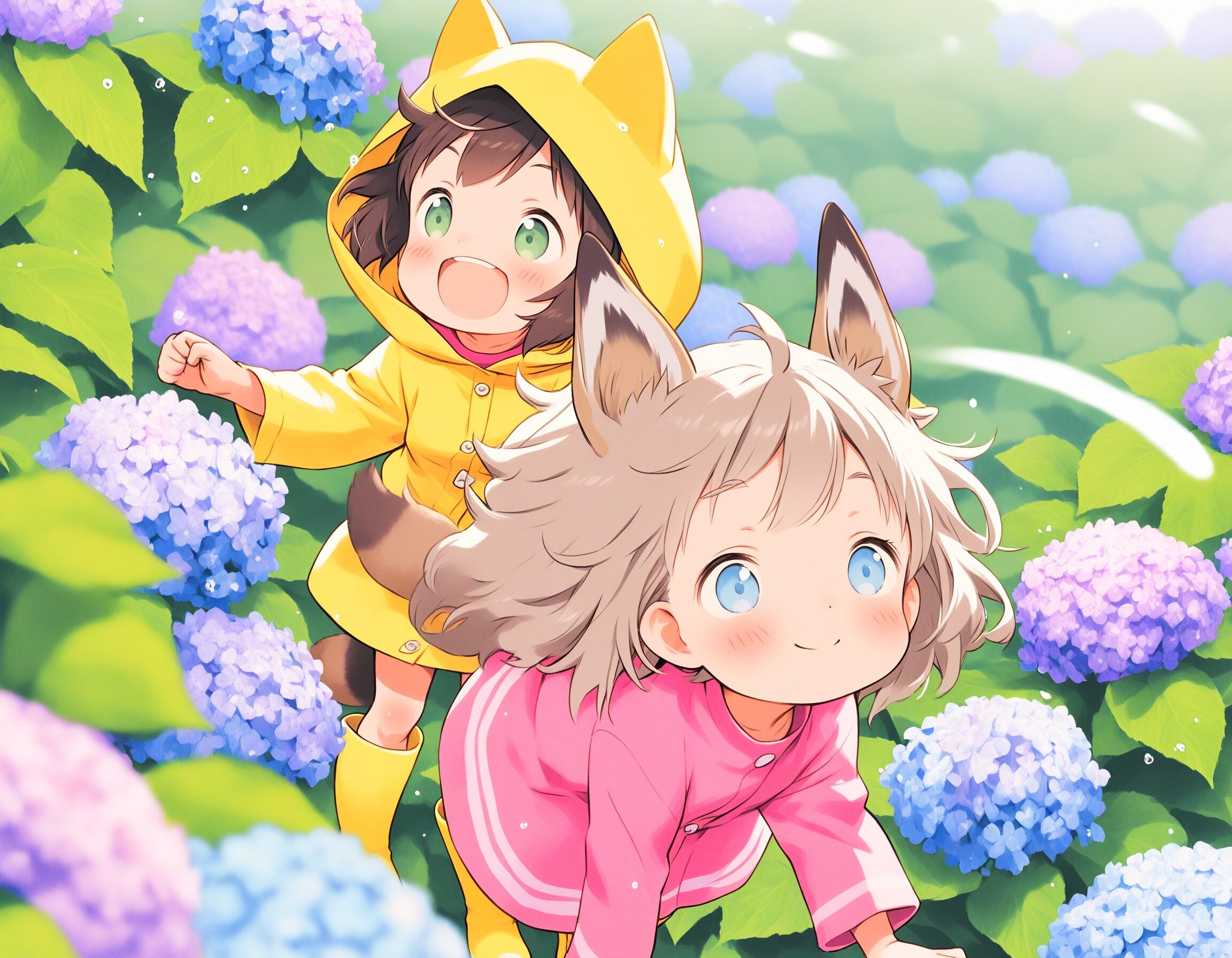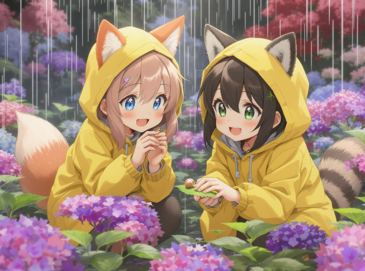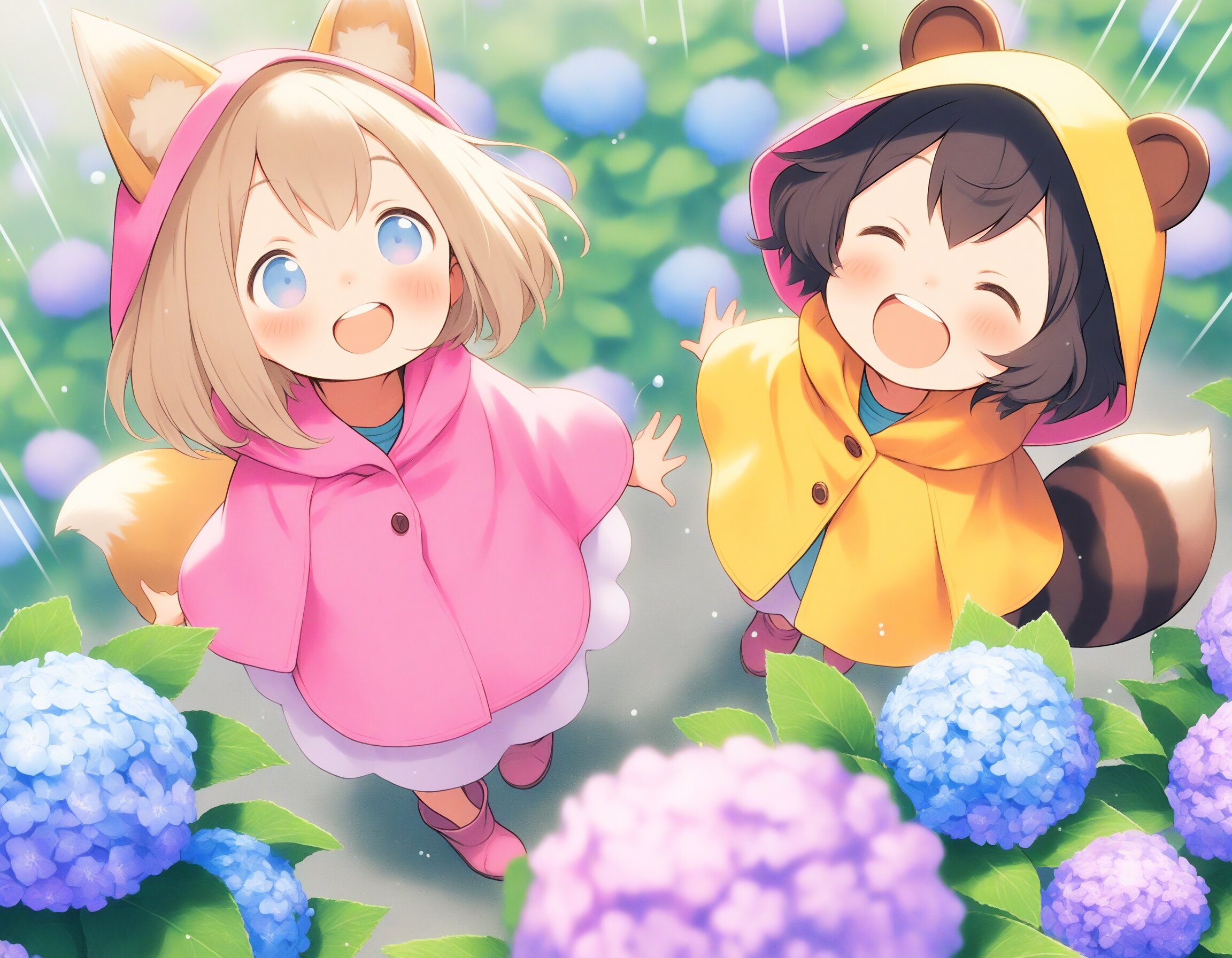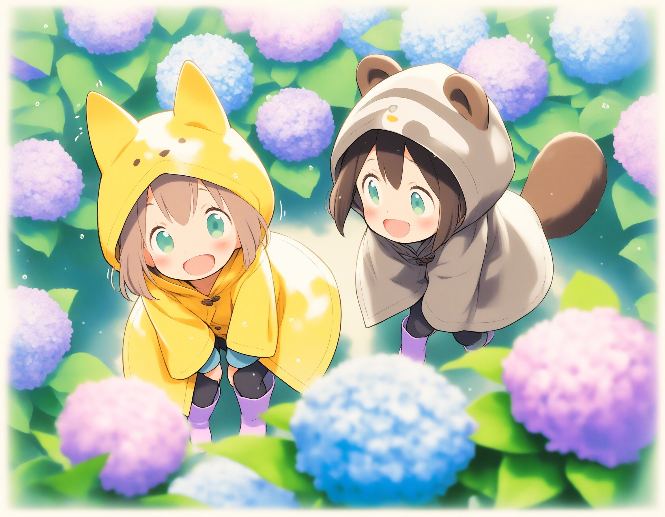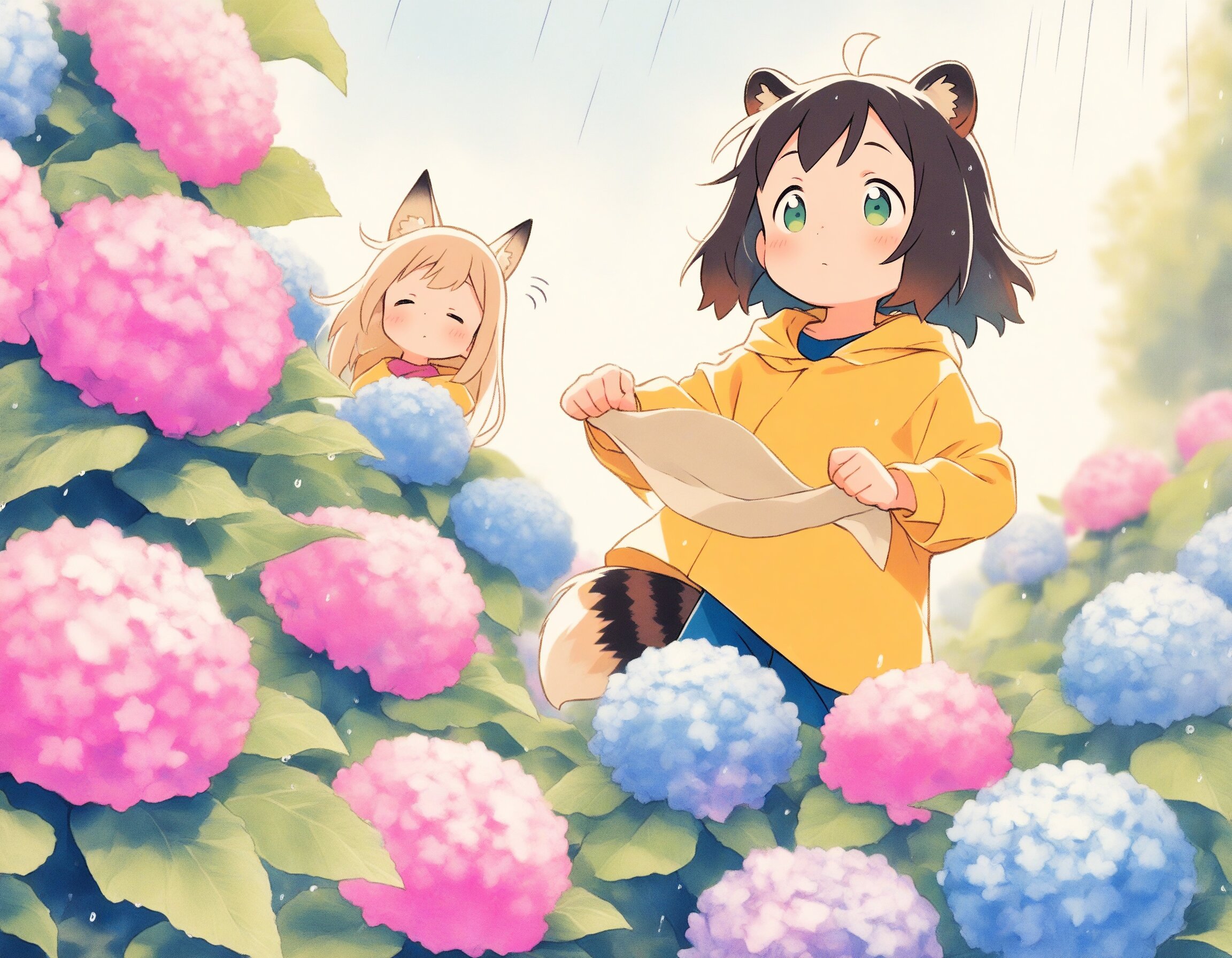 2girls, loli, mid, general, traditional media, (colored pencil drawing), pastel colors, soft tone, (blurred boundaries, drawing lines, Paper texture), cute, deformed, ultra-detailed background, (oyari ashito:0.1), (barasui:0.1), (masterpiece, best quality), dynamic pose, dynamic angle, dynamic composition, cowboy shot, from above , crouching in a hydrangea garden, colorful blooming hydrangeas, purple pink and blue flowers, gentle rain, hooded yellow raincoats, watching a snail on a leaf, anime style, vibrant colors, soft lighting, translucent atmosphere, rainy day, beautiful illustration, BREAK 2girls, loli, light brown hair, medium hair, bangs, blue eyes, (light brown fox ears, Light brown fox tail with white tip, petite), smile, happy, interesting, BREAK 2girls, loli,, dark brown hair, short hair, messy hair, bangs, green eyes, tareme, (dark brown raccoon ears, dark brown raccoon tail with striped pattern), laughing, happy,