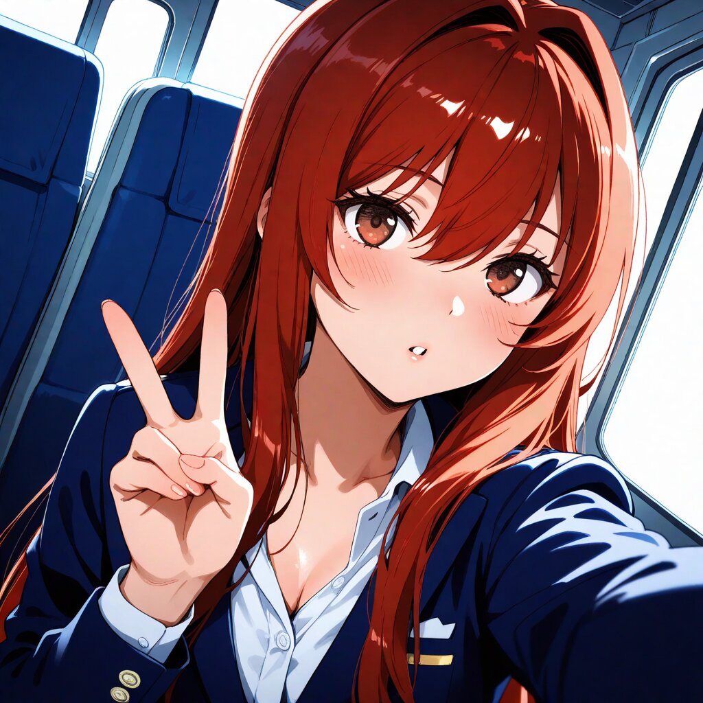 masterpiece,best quality,amazing quality,very aesthetic,absurdres,newest,okashirastyle,highres, 1girl,long_hair,brown_hair,red_eyes,hair_between_eyes,very_long_hair,brown_eyes,red_hair,floating_hair,hair_intakes,straight_hair,shiny_skin, selfie, v-sign, peace sign, airliner cabin, passengers in the background causing a commotion,cabin_attendant_costume