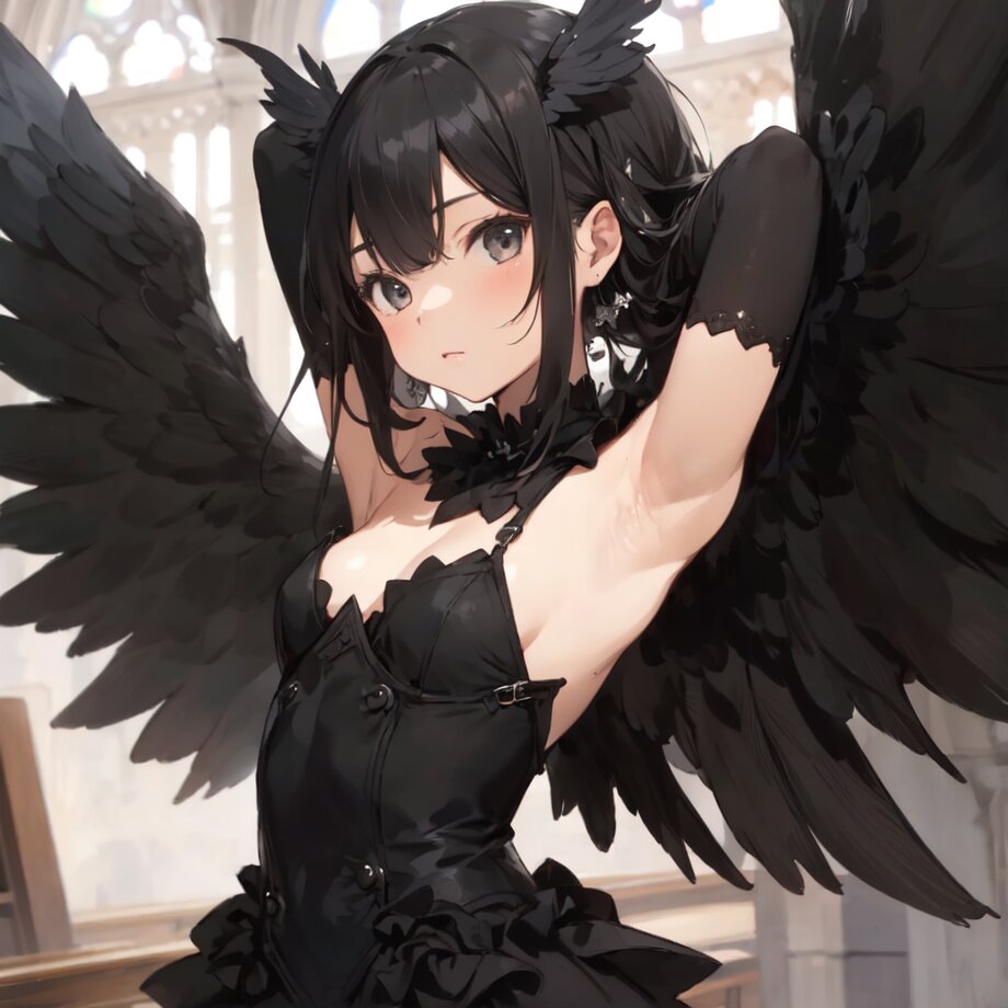 masterpiece, best quality, 1girl, kawaii, All black, angel, black gloves, black wings, (arms behind head:1.3), armpit, church