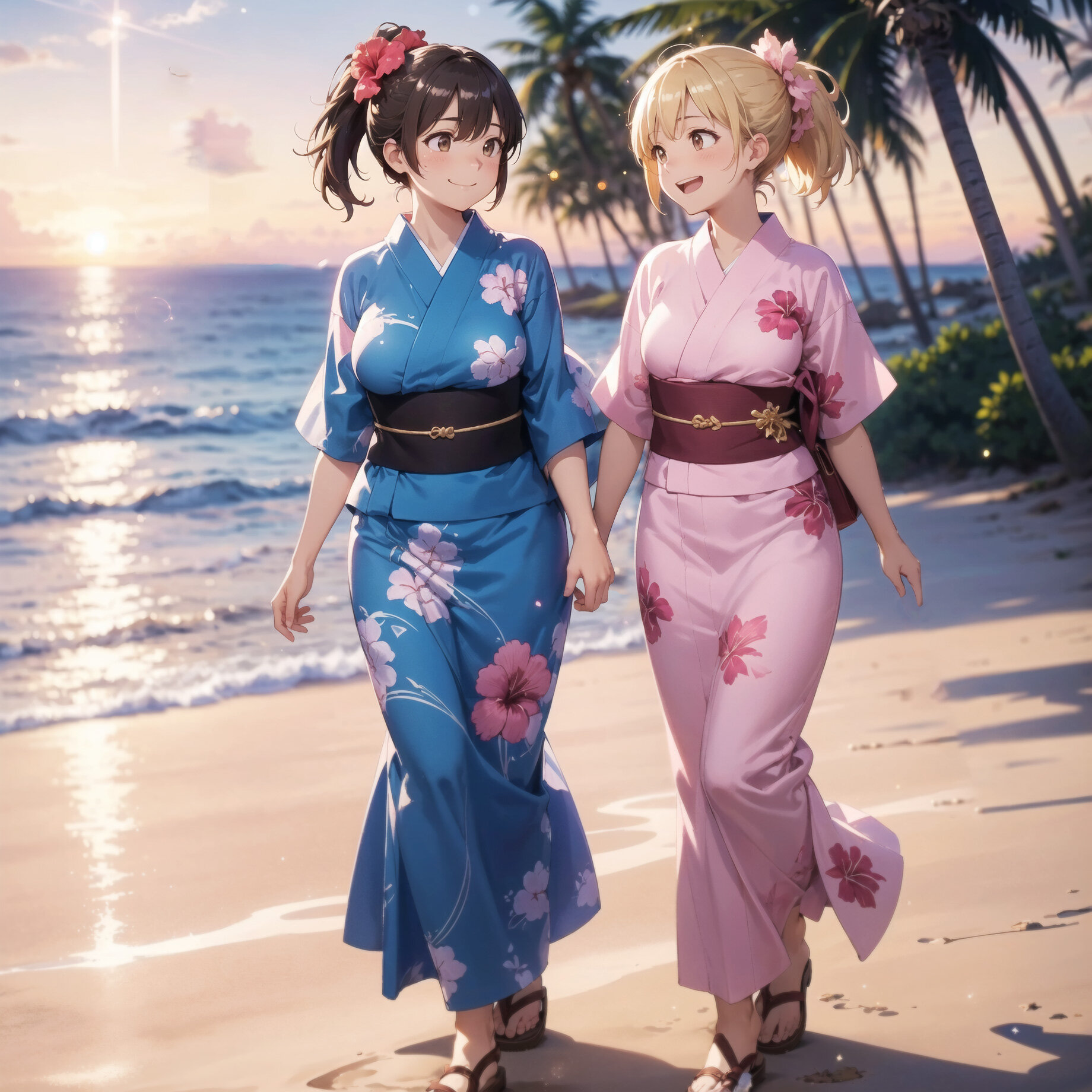 (pink theme:1.4),(masterpiece,high resolusion,illustration,ultra detailed 8k art,extremely detailed CG,official art,clothes reflecting light,detailed shiny skin,detailed background:1.3), ((highly detailed beautiful face and eyes)),(2 woman,15yo:1.5),(medium breasts:1.4),(curvy:1.4),(fat:1.1), (beautiful blonde short hair,ponytail,beautiful brown eyes:1.2),(eye contact:1.3),(laughing with open eyes:1.3),(closed mouth:1.2), (beautiful blue sky,lens flare:1.4),(A tropical beach scene with a girl wearing a hibiscus flower in her hair, colorful summer shorty yukata, walking by the ocean at sunset, palm trees swaying, golden hour light, dreamy and emotional atmosphere,sandals,sunset:1.2), , <lora:MultipleGirlsGroup:0.25:lbw=pose>(2woman,lineup:1.3),(fullbody shot:1.2),(magnificient views:1.5), (shiny skin:1.0), bloom,natural light,outside, <lora:jk fashion_v2:0.7:lbw=ware>, (jk fashion,short sleeves,mature female:1.3),(beautiful brown eyes:1.3),<lora:glowingdust:0.2:lbw=back>(GLOWINGDUST,BOKEH:1.6),<lora:flat2:-0.4>, <lora:hipoly3DModelLora_v10:0.25:lbw=ware>,(hiqcgbody:1.2) ,<lora:tareme_v10:0.3>(nice hands,perfect hands:1.0),brown hair, <lora:GoodHands-beta2:1>