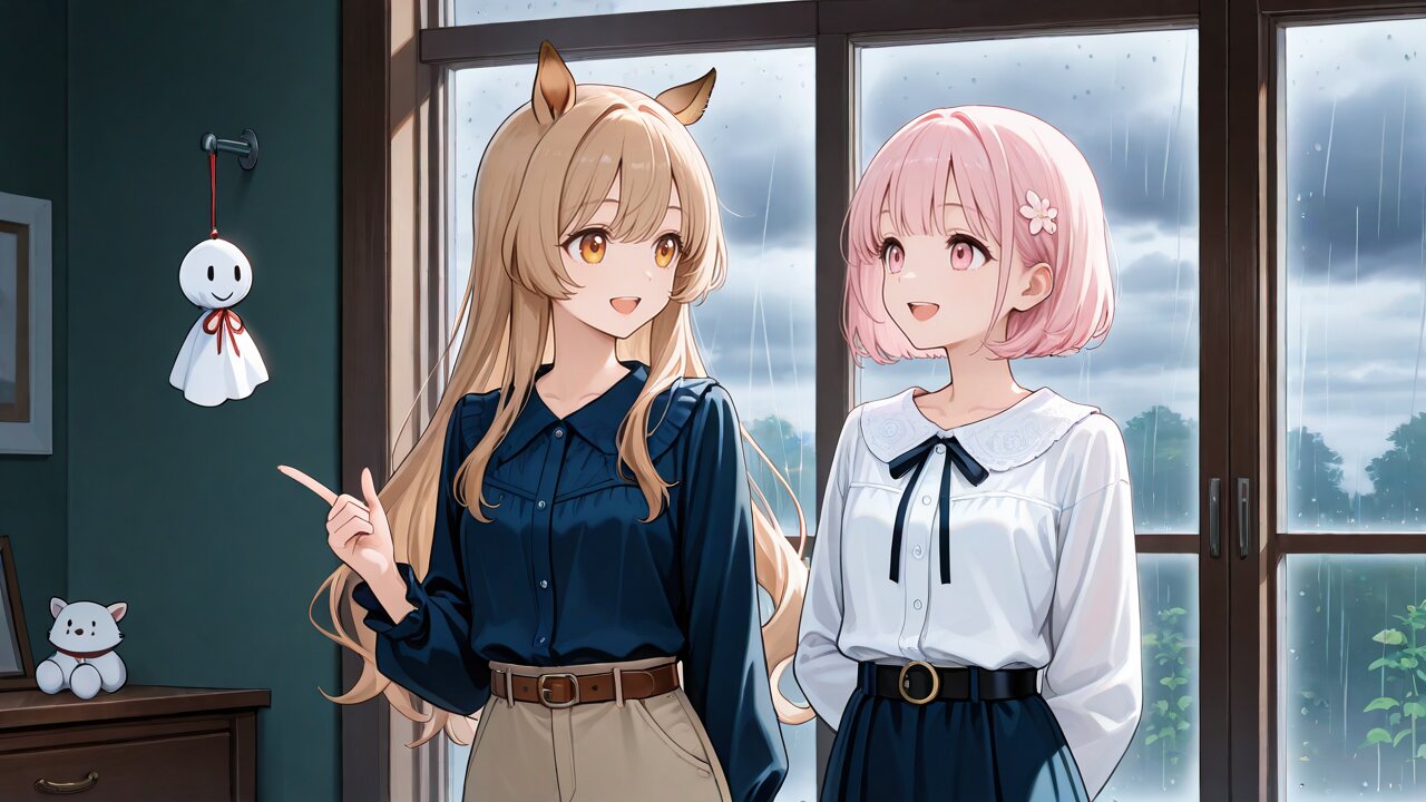 masterpiece,best quality,highres,highly detailed,perfect hands,general,It's raining outside the window,huge white smile teruterubouzu BREAK 2girls,upper body,light brown hair,long hair,amber eyes,wild boar's ears,bangs,smile,open mouth,blouse,long pants,belt,looking at another,index finger raised,Rain falling outside the closed window,dark clouds,cowboy shot,in living room,huge white smile teruterubouzu BREAK 2girls,upper body,light pink hair,light pink eyes,loose wavy hairstyle,short bob cut,floral hair accessory,happy smile,open mouth,blouse,long pants,belt,looking at another,arm behind back,Rain falling outside the closed window,dark clouds,cowboy shot,in living room,,huge white smile teruterubouzu
