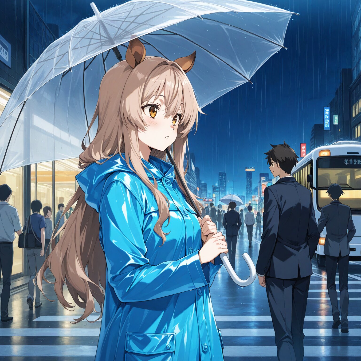 (1girl), BREAK, light brown hair, long hair, amber eyes, wild boar's ears, Raincoat, holding an umbrella, plastic umbrella In front of the station, downtown, terminal, bus, car, crowd Outdoors BREAK, ((newest, year 2024, anime, animation, anime screen capture, anime style:1.3)) BREAK, ((masterpiece, , vibrant, very aesthetic, highly detailed, best quality, 16k:1.3)) Perfect hands, perfect fingers,
