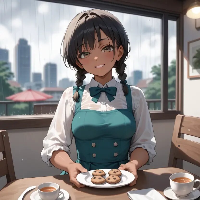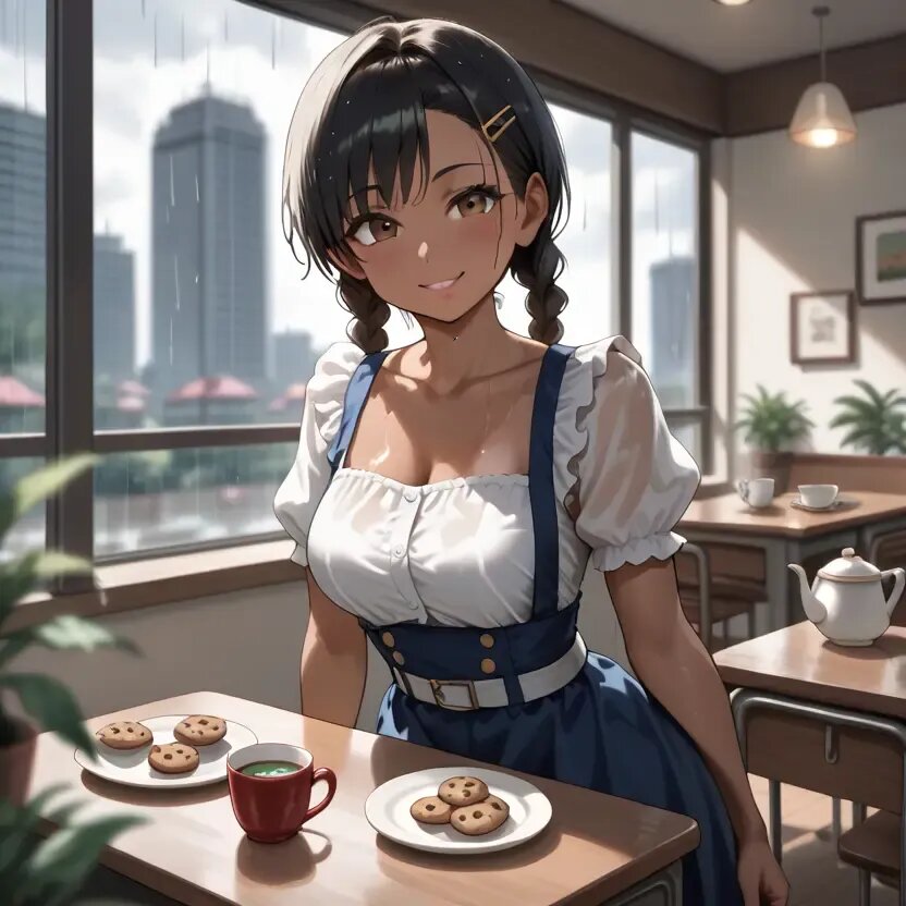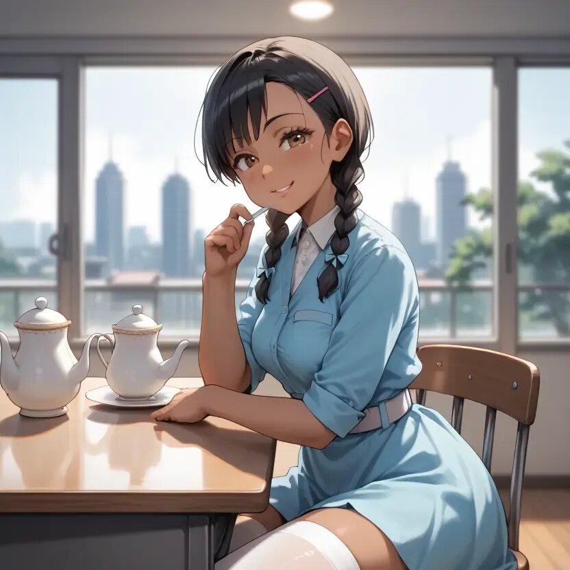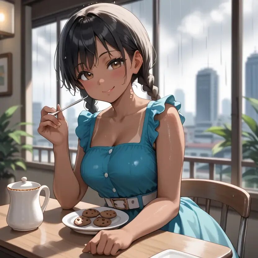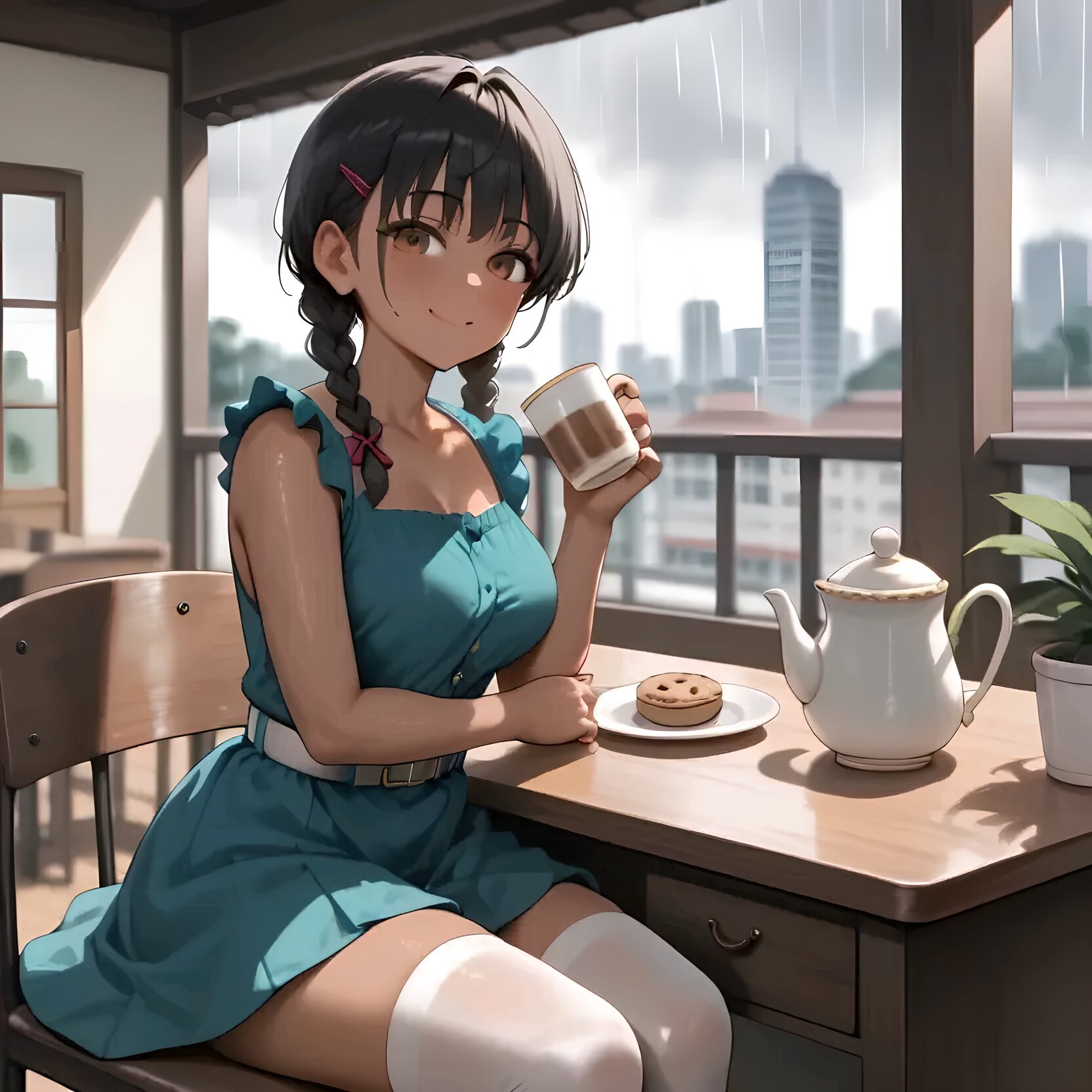 Cafe time, indoors, a cafe with large windows, a cityscape seen from the window, rain outside, daytime, summer, white-painted pillars, a girl sitting in a chair in front of the window, a white-painted desk, a white chair with a backrest, a light blue dress, a girl wearing a dress with a white belt around her waist, white stockings, a girl drinking tea from a white mug, a glass teapot on a desk, a teapot filled with tea, a plate on a desk, cookies on a plate,twin braids,bishoujo,early teen, black hair short cut, blurry background.tan., naughty face, tareme.brown_skin,early teen,curvy,Medium breasts,slender_waist,twin braids,bishoujo,early teen, black hair short cut, blurry background.tan., naughty face, tareme.brown_skin,early teen,curvy,Medium breasts,slender_waist,