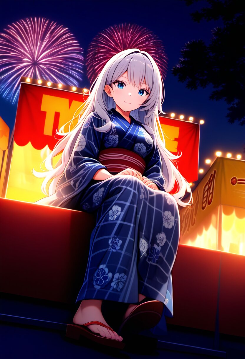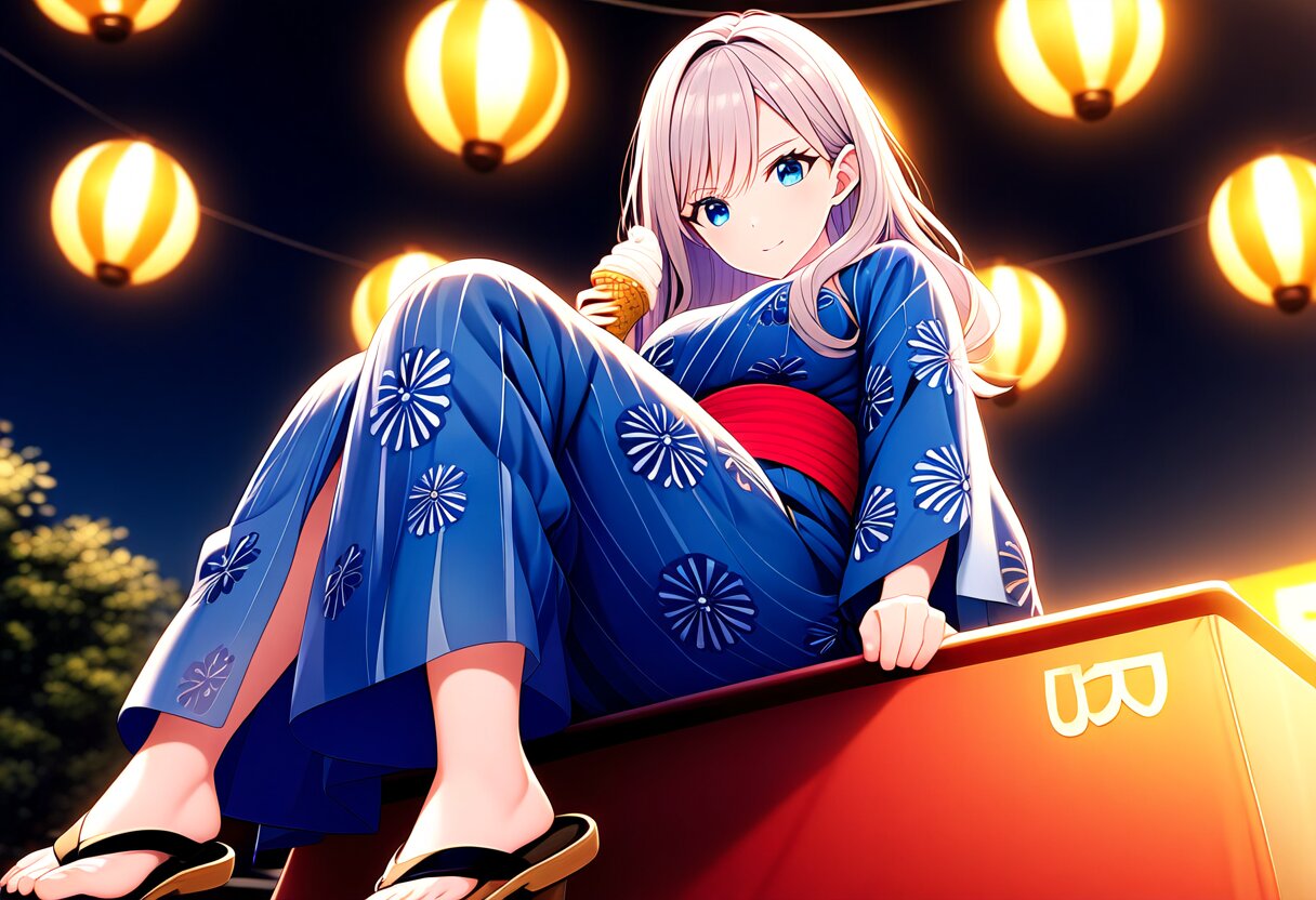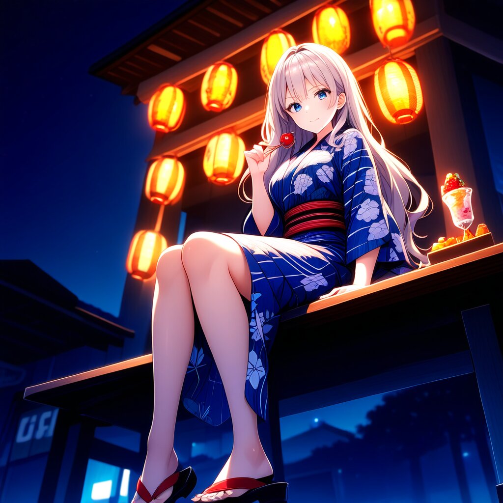 {{{masterpiece}}}, {{{best quality}}}, {{{very aesthetic}}}, {{{ultra-detailed}}}, {illustration}, {{{extremely detailed}}}, {{{an extremely delicate and beautiful}}}, {{{highly detailed}}}, {{official style}}, {{game cg}}, style of ai-generated, {{girlfriend (kari)}}, 1girl, solo, silver hair, long hair, blue eyes, tareme, light smile, serious, medium breasts, {{sandal}}, sitting, full body, night, blue yukata, night, festival, food stand, {{eat ice cream}}, {{{{{{{{from below, depth of field, looking down, looking at viewer}}}}}}}}