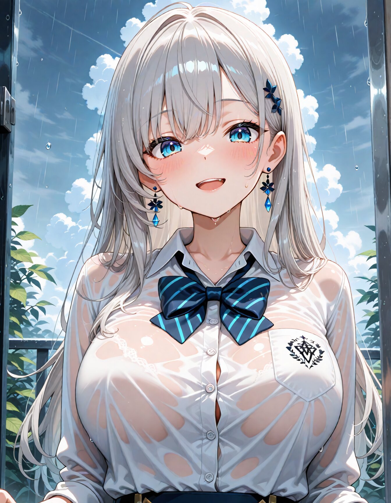 1girl, ultra detailed illustration, large breasts, long hair, beautiful face, Heather Gray hair, rainy, outdoors, solo, water drop, looking at viewer, dress shirt, see-through, collared shirt, shirt, earrings, cloud, school uniform, ribbon, open mouth, wet clothes, bow, breasts, virtual youtuber, rain, blue bow, upper body, blue bowtie, bowtie, white shirt, jewelry, black ribbon, sky, smile, cloudy sky, blush, wet, masterpiece, very aesthetic, newest, absurdres, safe,