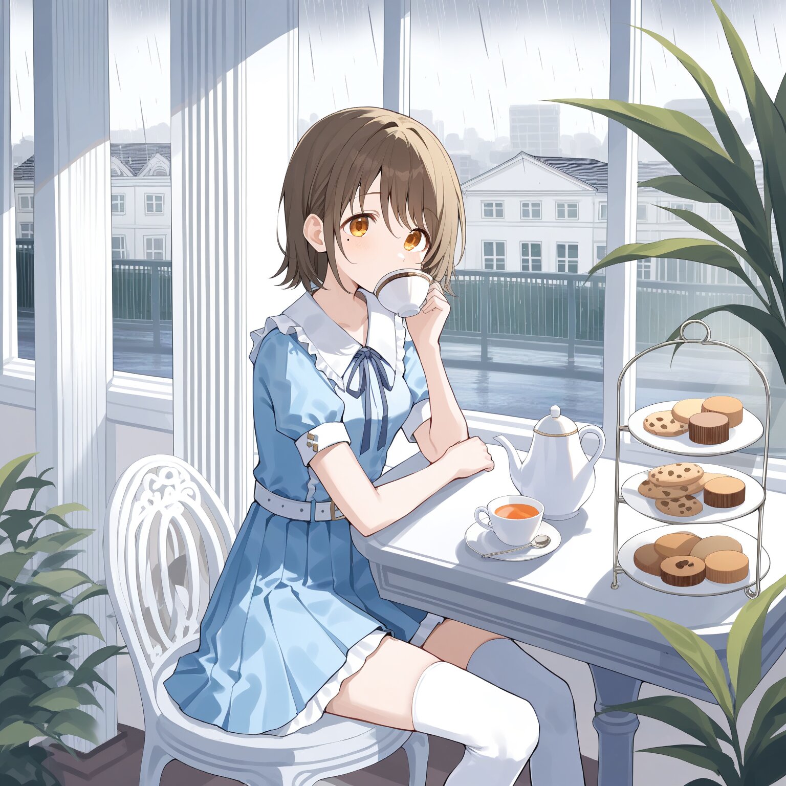 Cafe time, indoors, a cafe with large windows, a cityscape seen from the window, rain outside, daytime, summer, white-painted pillars, a girl sitting in a chair in front of the window, a white-painted desk, a white chair with a backrest, a light blue dress, a girl wearing a dress with a white belt around her waist, white stockings, a girl drinking tea from a white mug, a glass teapot on a desk, a teapot filled with tea, a plate on a desk, cookies on a plate,twin braids,bishoujo,early teen, black hair short cut, blurry background.tan., naughty face, tareme.brown_skin,early teen,curvy,Medium breasts,slender_waist,twin braids,bishoujo,early teen, black hair short cut, blurry background.tan., naughty face, tareme.brown_skin,early teen,curvy,Medium breasts,slender_waist,