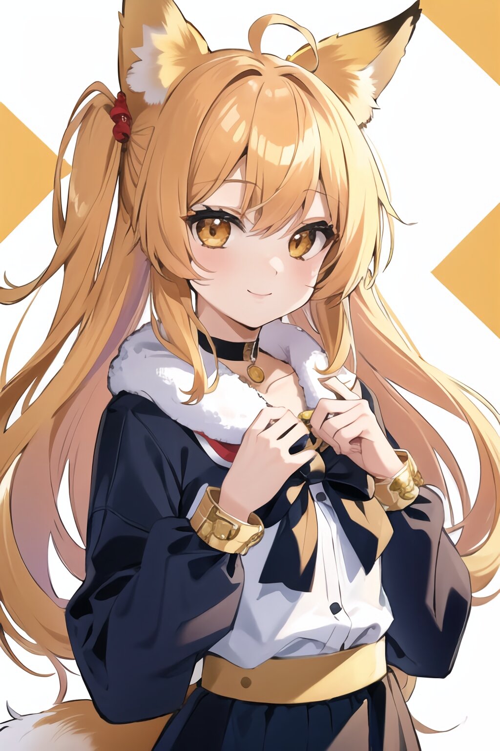 1 girl, (gold fox ears:1.4), (gold hair), long hair, crossed bangs, (two side up), gold eyes, hair scrunchie, choker, bracelet, flat chest, scarf,ribbon on chest, (mysterious stuffed toy on hands), smiles,