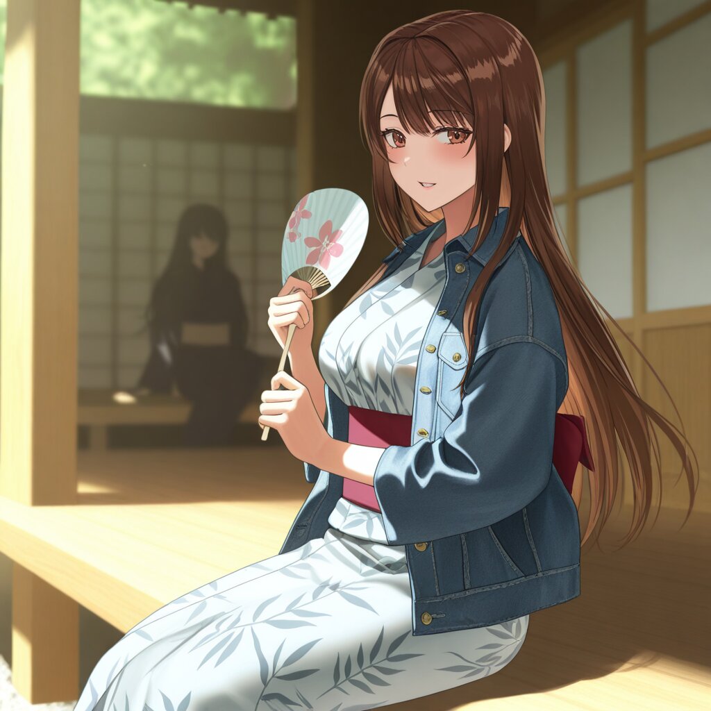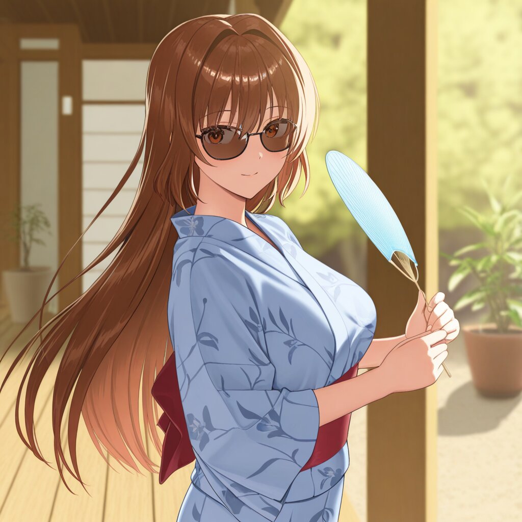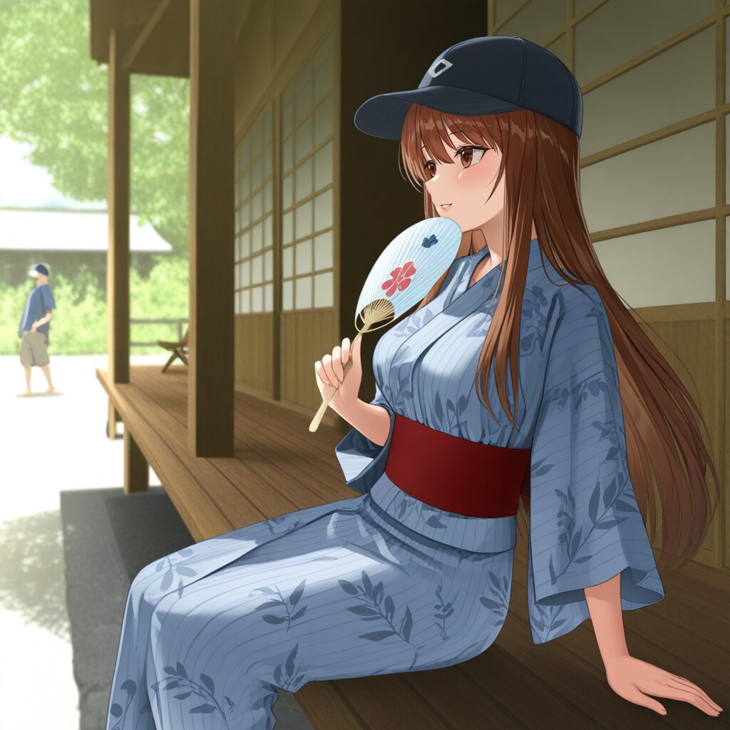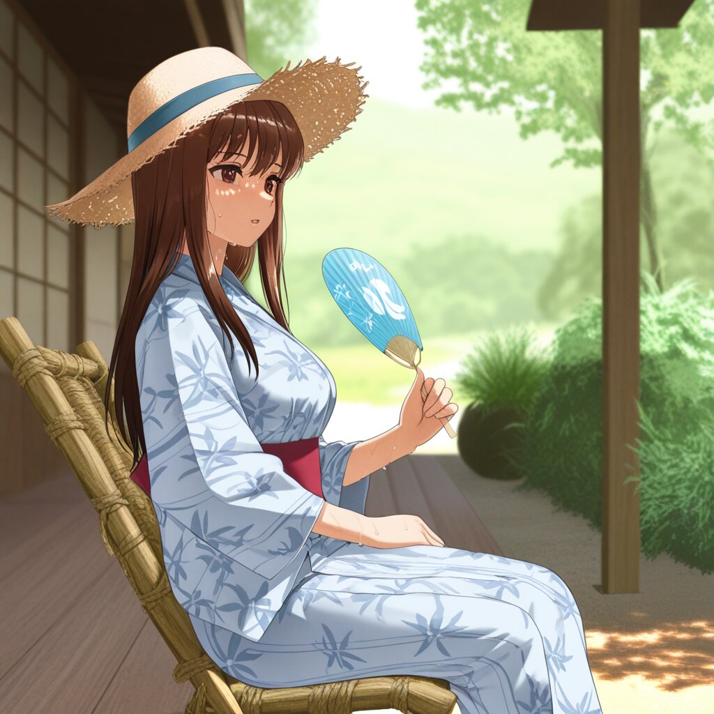 masterpiece,best quality,amazing quality,very aesthetic,absurdres,newest,highres,okashirastyle,8k,extremely detailed CG unity 8k wallpaper,(perfect face:1.2),1lady,27yo,long_hair,brown_hair,red_eyes,hair_between_eyes,very_long_hair,brown_eyes,red_hair,floating_hair,hair_intakes,straight_hair,shiny_skin,(medium_breasts:1.2),yukata,at engawa, holding the uchiwa, from_side, general,Veranda, cool off, weathered wood, dappled sunlight, worn wicker chair, lemonade, straw hat, shirt, slightly sweaty face, late afternoon, quiet, overgrown garden, distant mountains, shallow depth of field, soft focus, warm tones, 1950s Americana, relaxed posture, simple composition