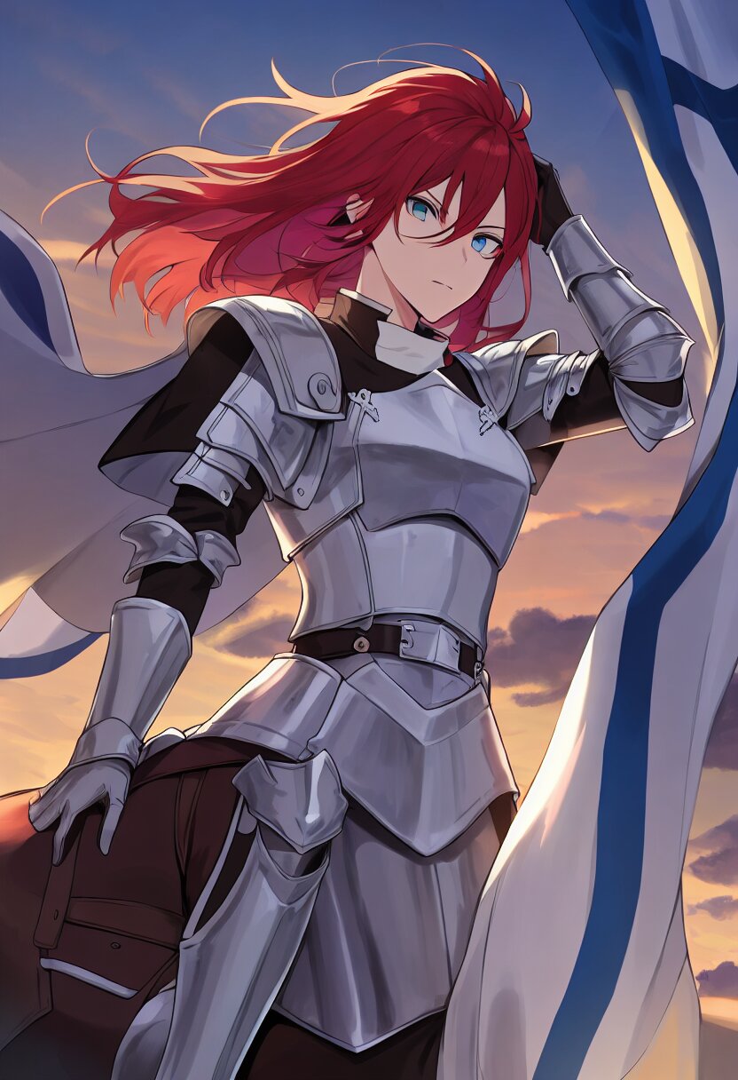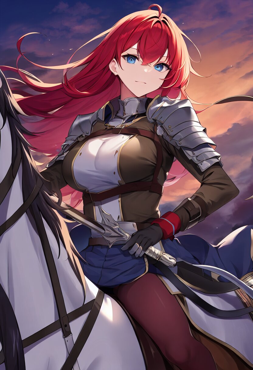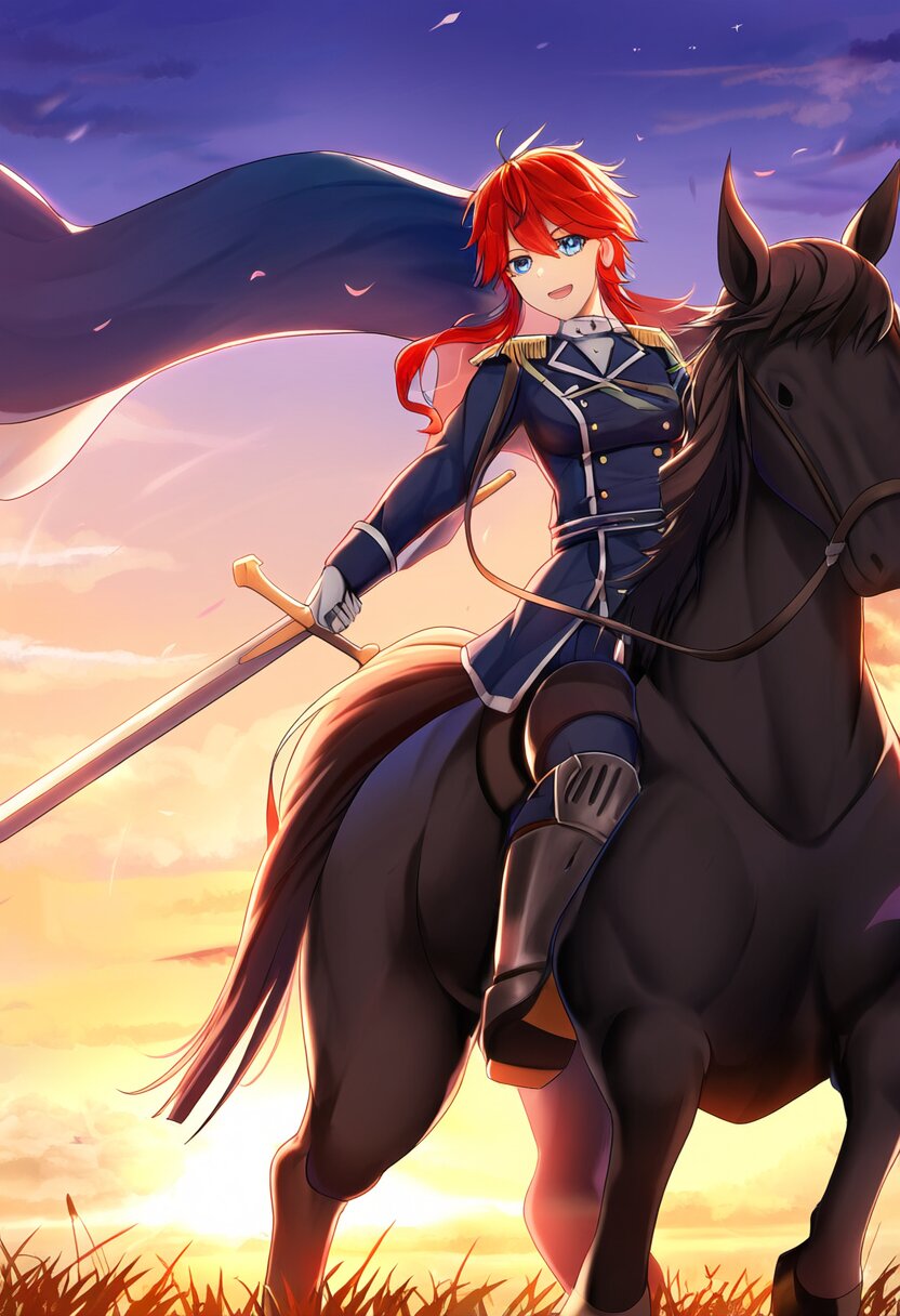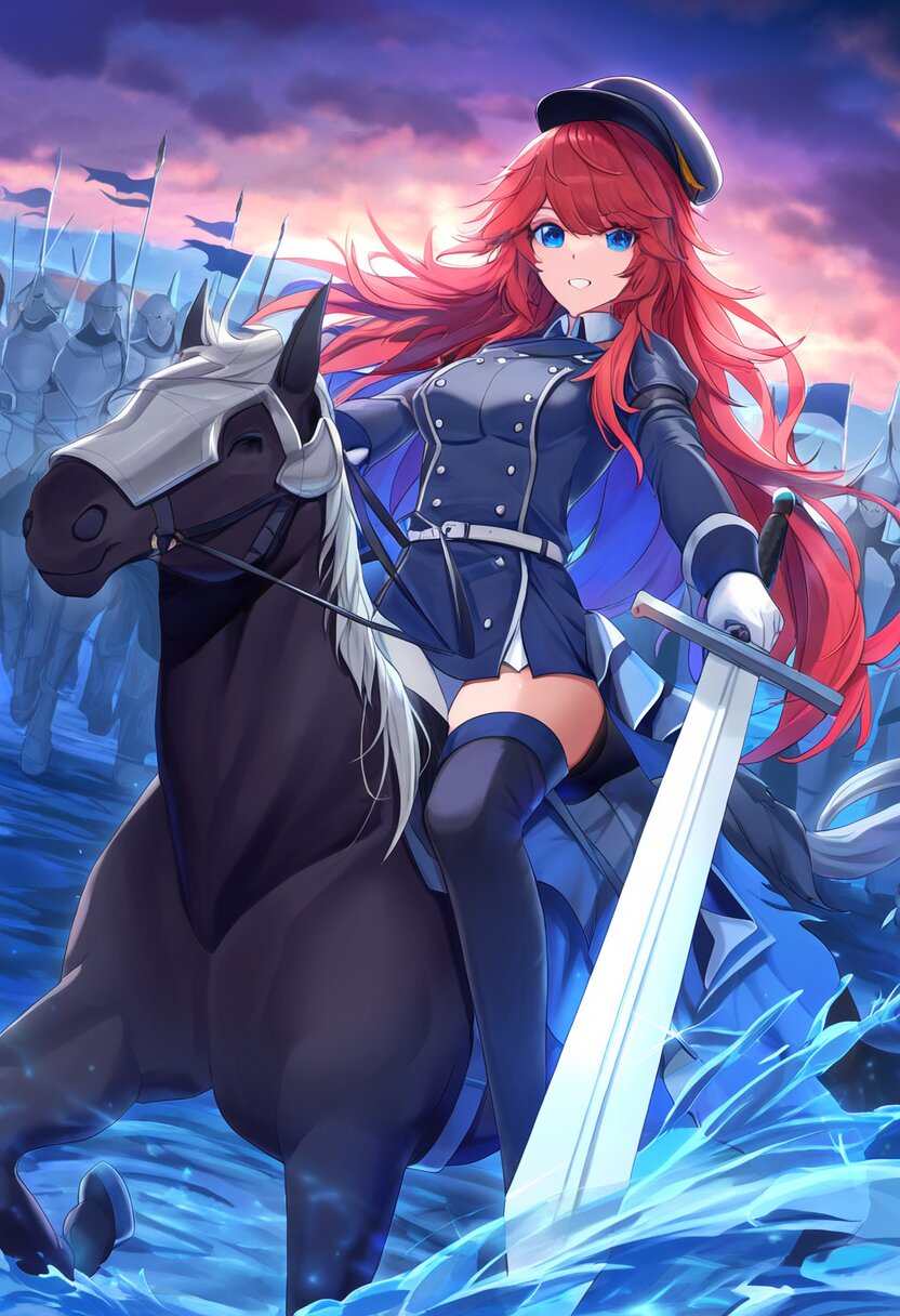 Twilight Battlefield, A 25-year-old knight with flowing red hair rides a majestic horse across a misty battlefield at dusk. Clad in a double-breasted deep blue army uniform, she wields a gleaming sword, her eyes reflecting determination. A deep blue flag flutters behind her, symbolizing her unwavering resolve., best quality, amazing quality, very aesthetic, absurdres