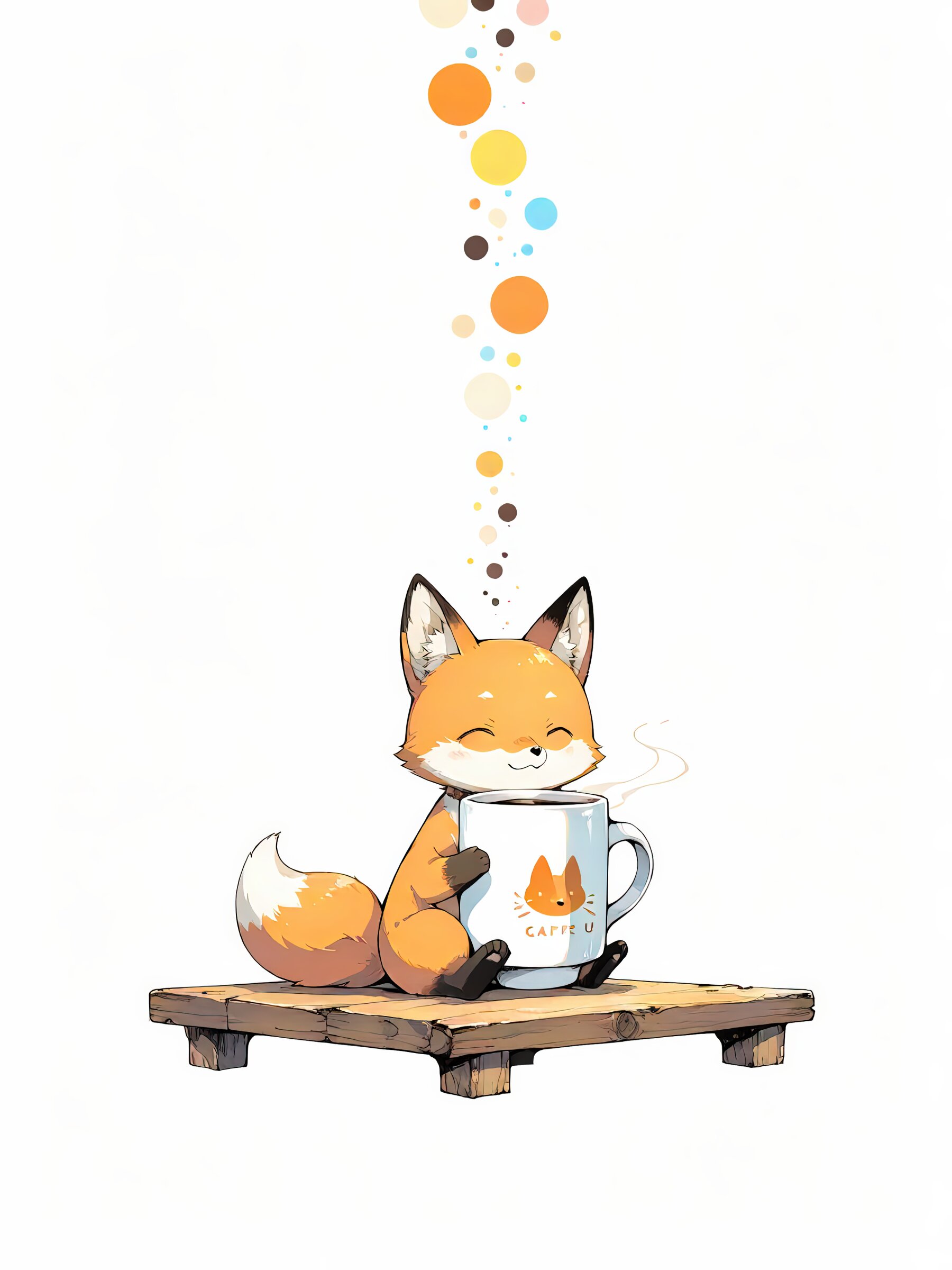 Best quality, Masterpieces, simple background, lots of negative space, anime-style illustration, white background, fine detail, solo, cute fox cub, happy, Summer Atmosphere, cafe-style room background, wood furniture, coffee mug, soft light, relaxed and warm, no humans, minimalism, cinematic angle, official wallpaper