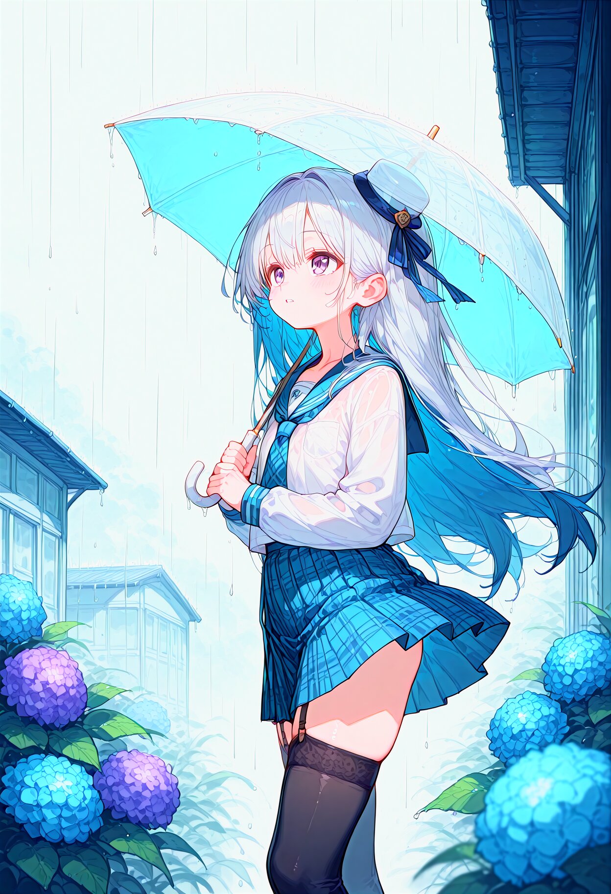 beautiful detailed background, best quality, (pale color:0.9), (wide shot:1.2), dark theme, blurry,depth of field, collarbone, parted lips,(Expressionless:0.8), big eyes,(half-closed eyes:0.8), tareme, pale purple eyes, (silver hair:1.1), (dark blue hair colored inner hair:0.8), long hair,very long hair eyebrows visible through hair, mini hat,garter straps, plaid blue necktie, plaid blue skirt, ribbon, school uniform,white shirt,long sleeves, thighhighs, (See-through underwear:0.7), looking up, look up at the sky, rain,,stratocumulus, (terrace,under the roof,:0.9), outdoors, from side, (looking at viewer:0.8), (holding umbrella,:1.2) wet clothes,wet hair, shelter from the rain,(Hydrangea:0.6) <lora:sdxl2-flat2-512b:-0.7> <lora:noline-16oa:-1.5> <lora:sdxl-shadow_01:-0.7>