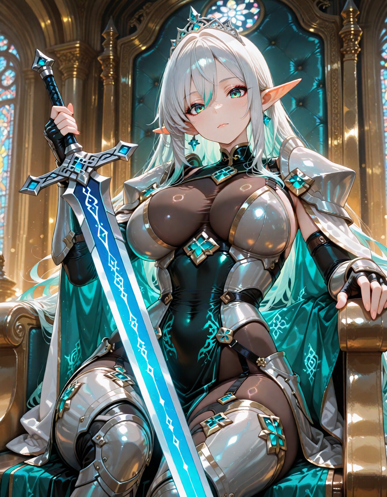 masterpiece,very aesthetic,absurdres,newest,ultra detailed illustration,safe,large breasts,long hair, Looking at viewer,detailed face,eyes_focus,sitting on throne,powerful pose,eathereal beuty, Fighter queen,delicate tiara,silver armor,holding a sword,glowing runes in the sword blade,see-through split cape, Throne room,stained glass,epic,windows,volumetric light,godrays,bokeh, beautiful,slender,female,elf,green eyes,eyelashes,eyeliner,smokey eyes,Long hair,silver hair,with turquoise highlights,hair between eyes, <lora:TrendCraft_The_Peoples_Style_Detailer-v2.3I-4_16_2025-Illustrious:0.4>,