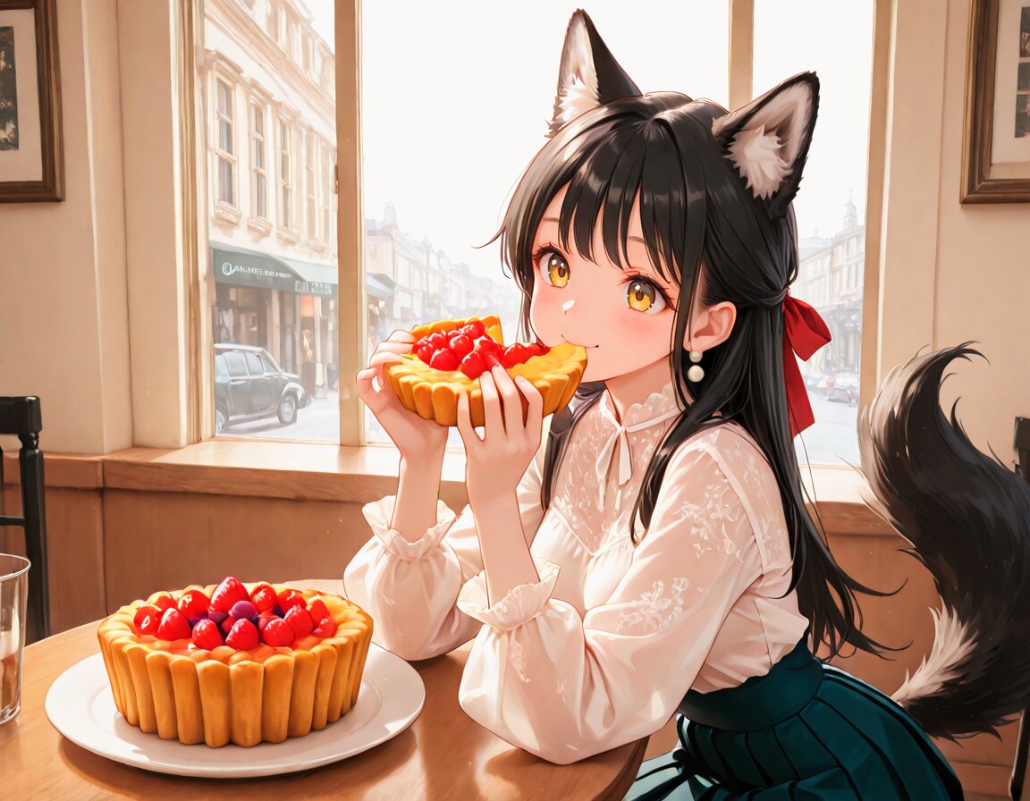 1girl,solo,<澪>, blush,smile,sitting at the table,(eating melon tart:1.3),(Silk_blouse:1.5),(Pleated_midi_skirt:1.4),(Pearl_earrings:1.3),(Parisian_cafe_background:1.5), BREAK FruitTart,full fruits tart,fresh fruits,vibrant colors,sweet dessert,French pastry, (upper body:1.2),in cafe,, appropriate posture,appropriate configuration,ideal ratio body proportions,perfect anatomy, <lora:Fixhands_anime_bdsqlsz_V1:1>, masterpiece,best quality,newest,absurdres,highres,ultra high res,8K UHD,hyper-detailed,