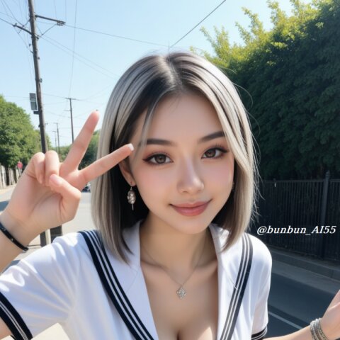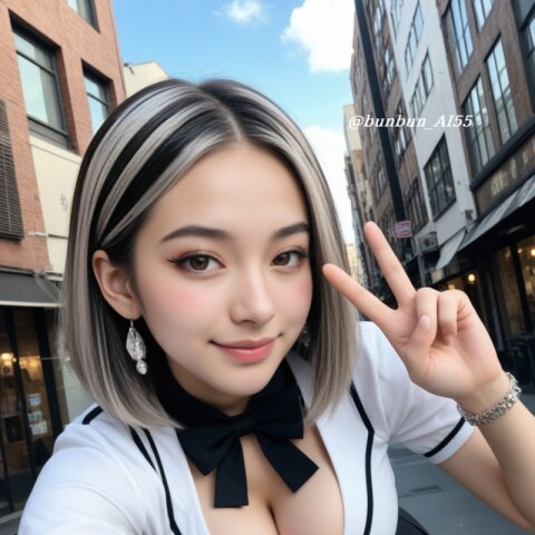 HDR, 8K,masterpiece, best quality, amazing quality, very awa, very aesthetic, absurdres, newest, detailed eyes, realistic eyes, realistic body, (realistic, hyperrealistic, photorealistic), highres, add detail, sharp detailes, sharp lines, sharp focus, fantasy style, anime style, BREAK perfect lighting, professional lighting, face lighting, (1girl, beautiful japanese gyaru:1.5, 20year old), (gyaru, model, kawaii), (beautiful face, k-pop idol face, slim face, small face, cute face, detailed face, brown eyes, gyaru makeup, pink lips), (looking at viewer, seductive smile), BREAK nsfw, (brown medium hair:1.5, silver highlights), (jewelry, piercing, earrings, bracelet), (huge breasts, pointy breasts),(long legs, muscle thighs), (perfect hands), (shiny skin, glossy skin), (super model body:1.2, slim body, athletic body:1.2), BREAK (wearing a american school uniform:1.5, microskirt), (light reflections), (shiny, glossy, luster), (tight fit), BREAK (standing, slightly leaning forward, one hand peace sign, other hand on hip, dynamic pose), (detailed background, street, wall, blue sky), (face focus shot:1.3, bust-up shot, medium shot:1.2, dynamic angle, dutch angle),