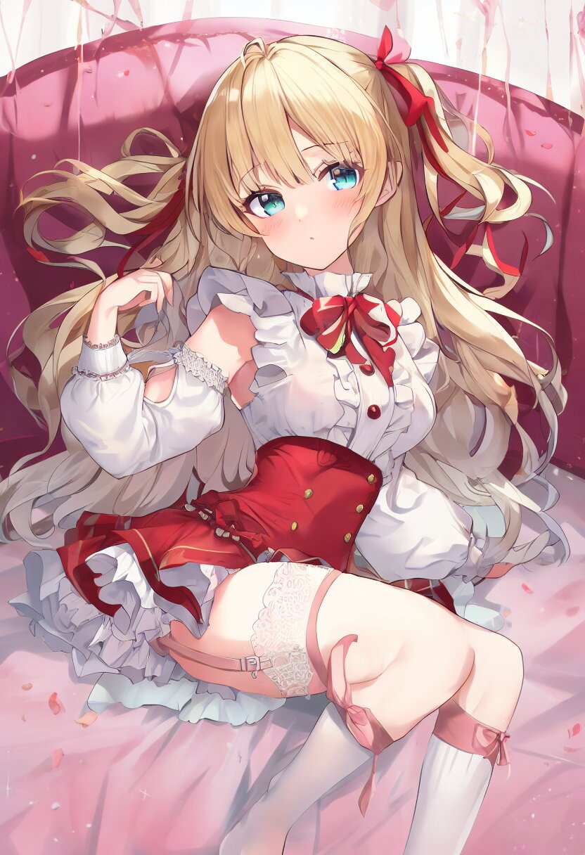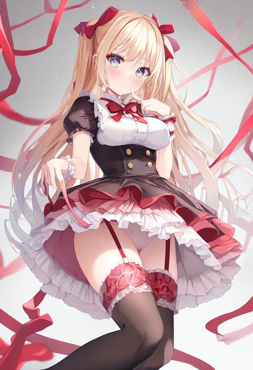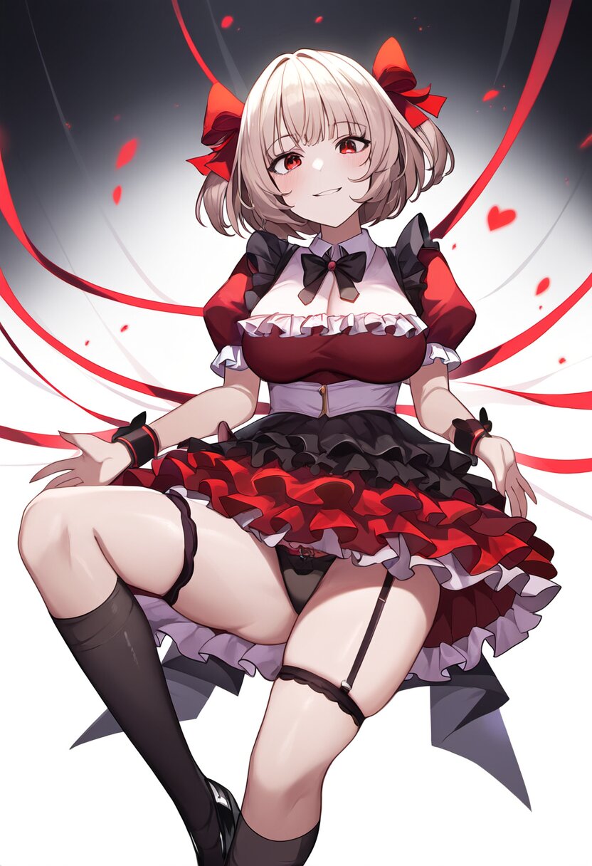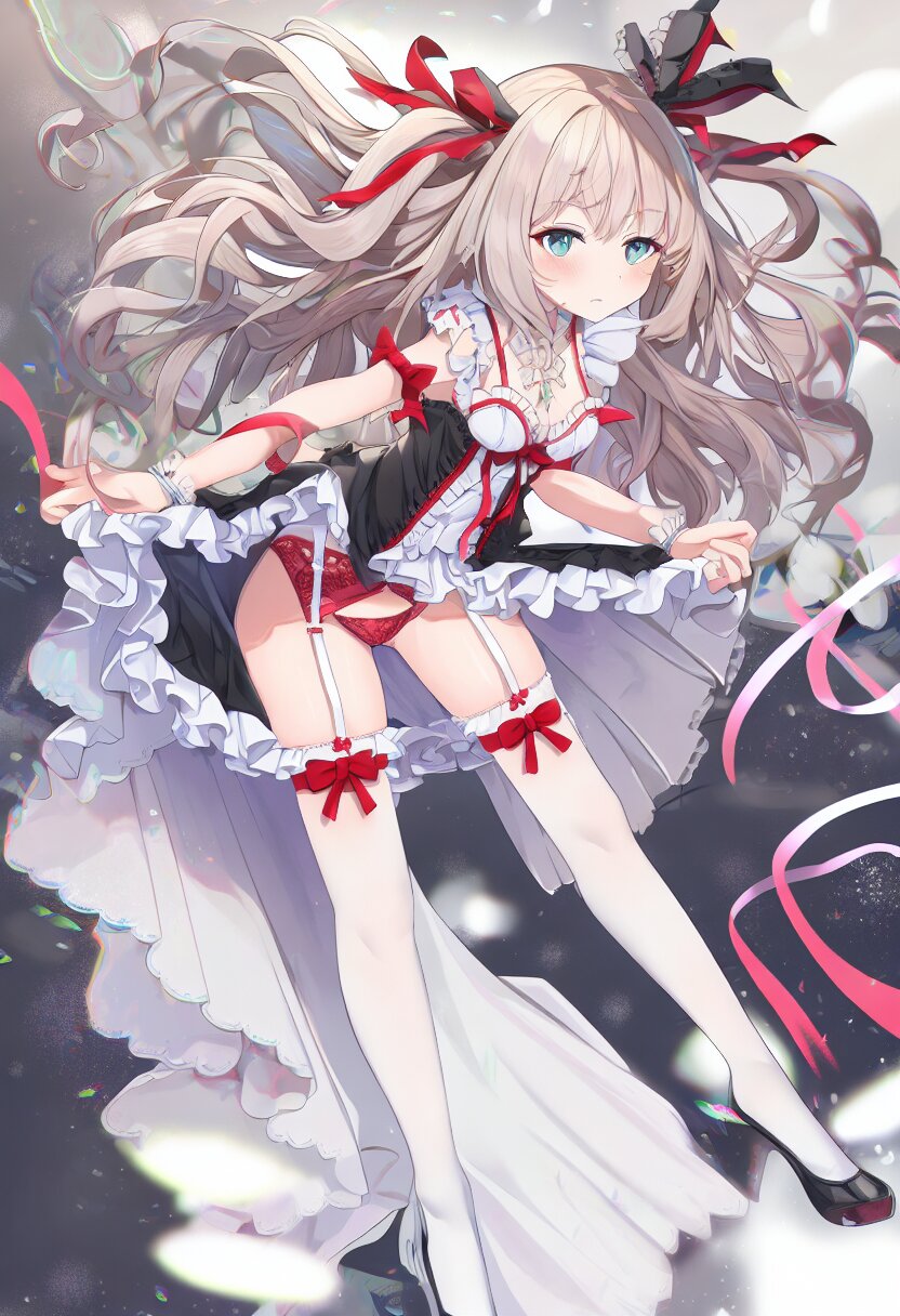 very aesthetic, best quality, absurdres, girl, solo, beautiful detailed hair, beautiful detailed eyes, medium breast, red ribbon, dress, micro mini skirt, many frills, garter belt, knee socks,