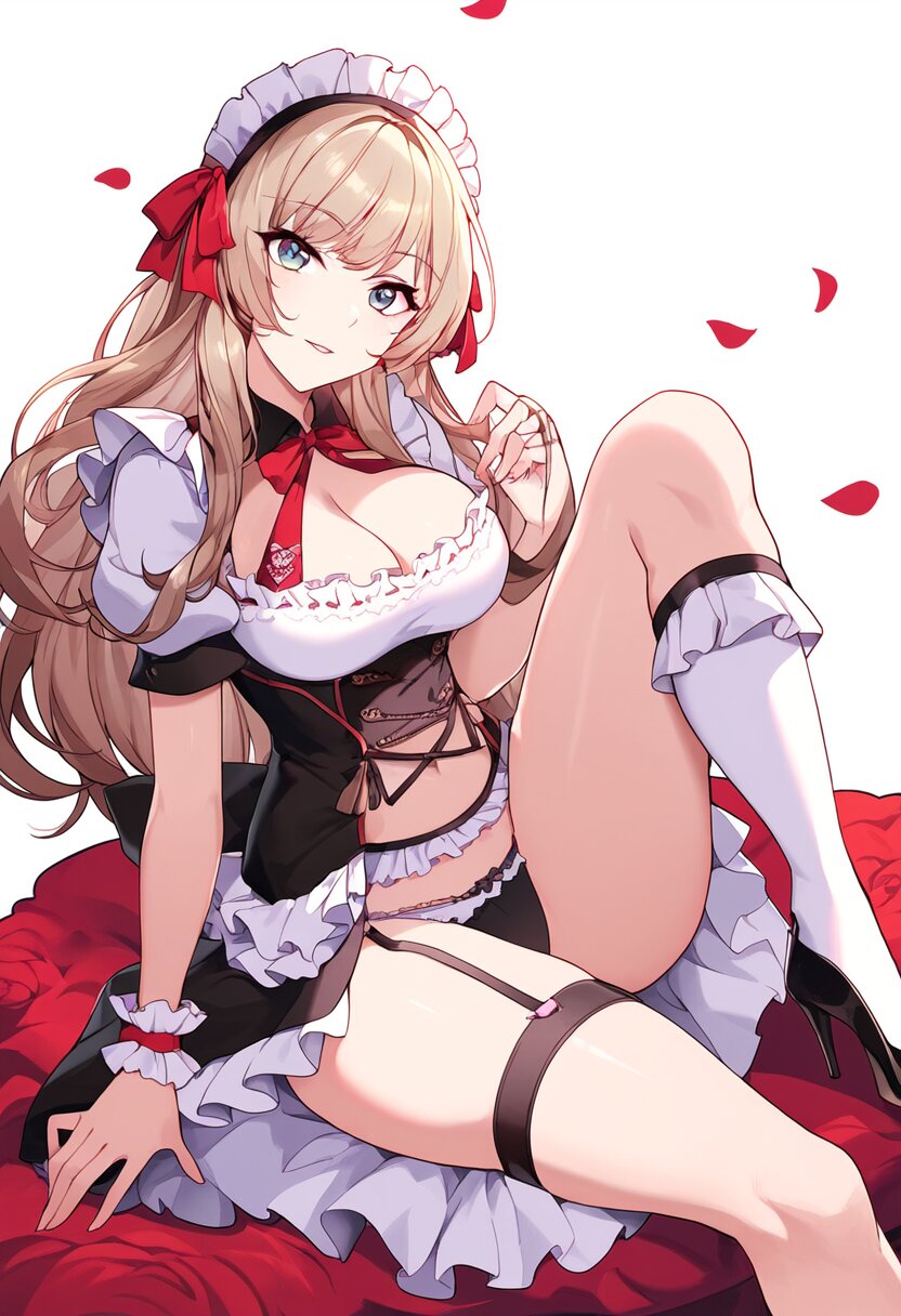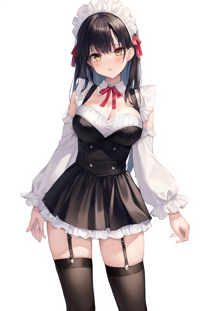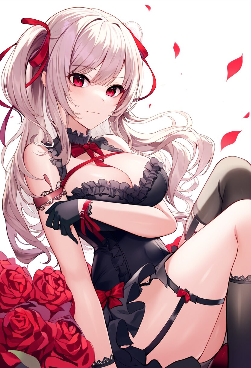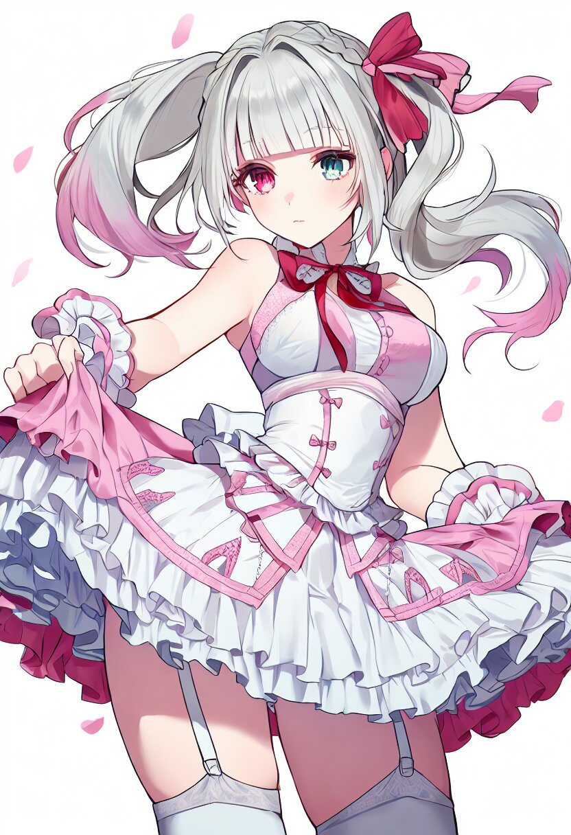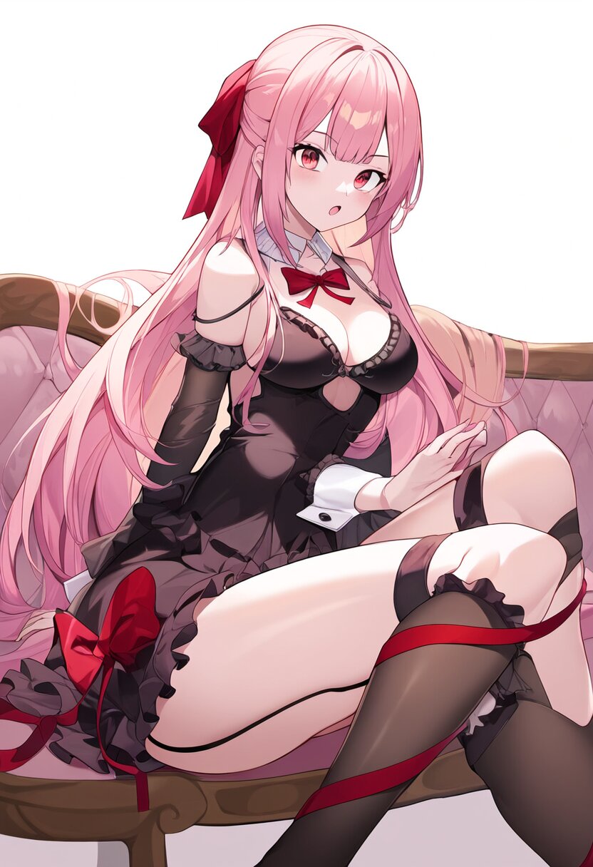 very aesthetic, best quality, absurdres, girl, solo, beautiful detailed hair, beautiful detailed eyes, medium breast, red ribbon, dress, micro mini skirt, many frills, garter belt, knee socks,