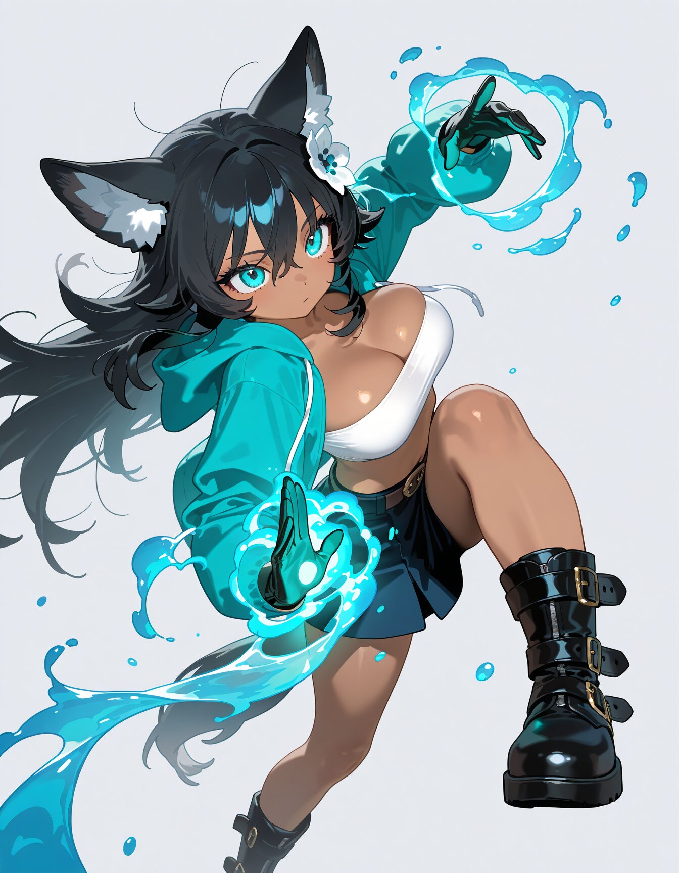 (close up:1.2) high angle shot, looking up (simple background:1.2) 1girl, black wolf ears, dark skin, young beautiful girl, large breasts, tall, wolf tail, (aristocratic features), (Black Hair:1.2) (disheveled long hair over ears:1.3) messy hair ornament flower, (perfect turquoise eyes:1.3) long eyelashes,, wearing turquoise hood down and white tube top leather gloves, lether miniskirt, belt boots, turquoise hoodie, water magic, , kung fu attack, kung fu pose, kung fu action, (swirling energy,energy magic,energy:1.2), water magic, floating water balls, great clear water, reflective water, , masterpiece, best quality, amazing quality, very aesthetic, absurdres professional art lots of details, , overexposure, shiny-glistening, (watercolor style:0.0), (pastel color style:1.0) <lora:noline (1):-0.5> <lora:sdxl2-flat2-512b:0.15> <lora:facelightup_xl_v10:0.5>