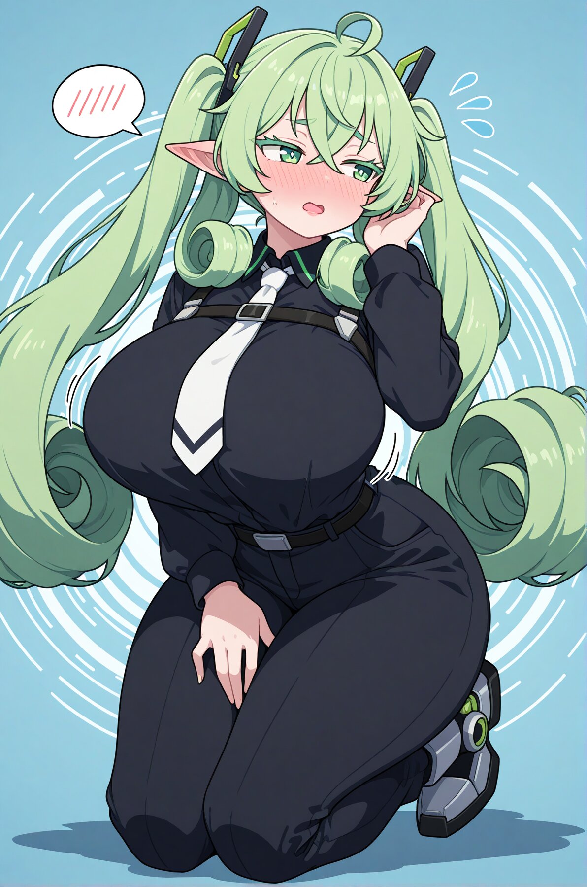 1girl,solo,layering,huge breasts shaped clothes,pointy breasts,pointy ears,slim,(long legs:1.1),(wide hips:1.1),(voluminous thick thighs:1.1),green hair,cowlick,crossed bangs,long twintail,(big spiral curled ends:1.3),green eyes,half-closed eyes,green eyelashes,green eyebrows,pink lips,open mouth,tsurime,chest belt over clothes,black collared shirt,white tie,shirt tucked in,black mechanical pants,light-blue mechanical shoes,full-face blush,embarrassed,open mouth,spoken blush,flying sweatdrop,tucking hair,motion lines,one hand between thigh,legs together,kneeling,blue background,full body,looking away,(stylized),(kawaii),(anime colored),(cute), ,((correct_anatomy)),gddw,flat color