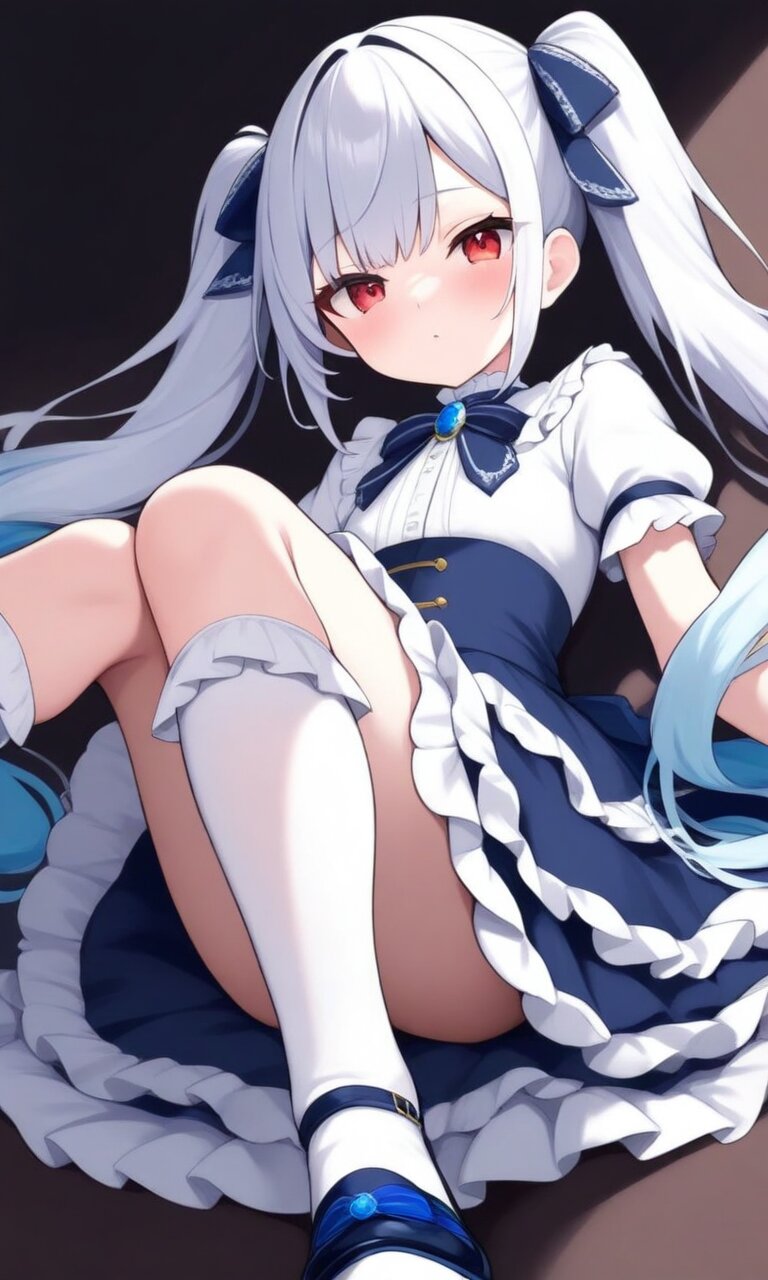 anime girl, upper body portrait, silver hair with light blue tips, long twin tails, red eyes, wearing a navy and white frilly jumper skirt, white puffed short-sleeved blouse with frills, blue gem ribbon tie, blue hair ribbons, white knee-high socks, navy strap shoes, elegant and classic lolita fashion, soft expression, beautiful lighting, plain background, masterpiece, high quality, highly detailed