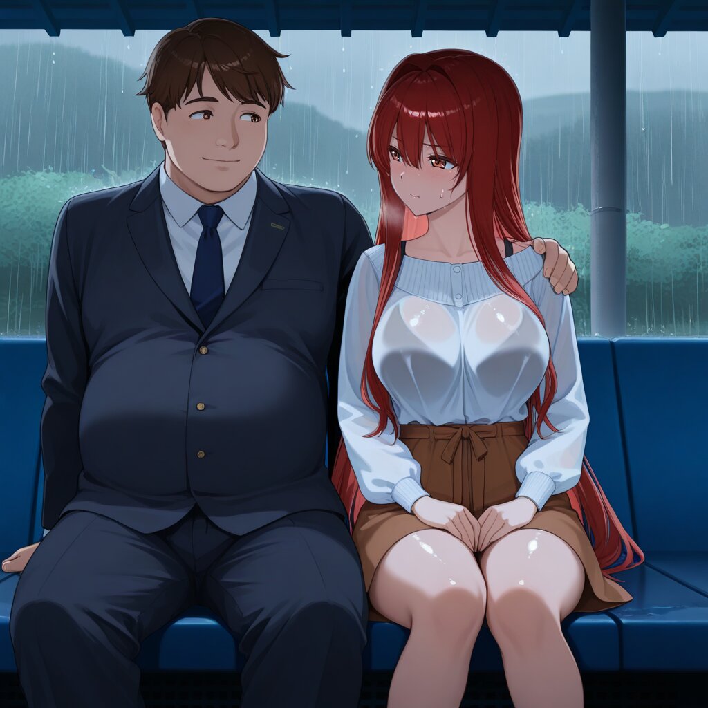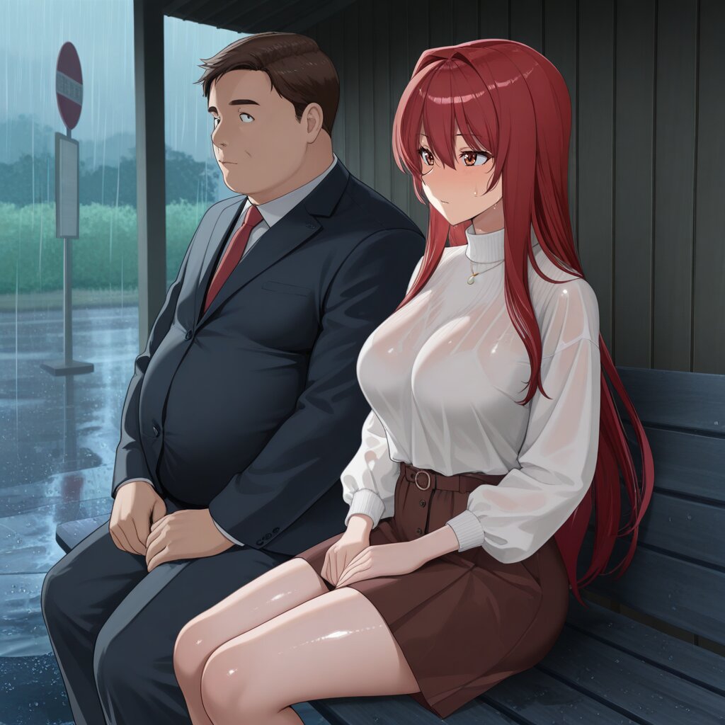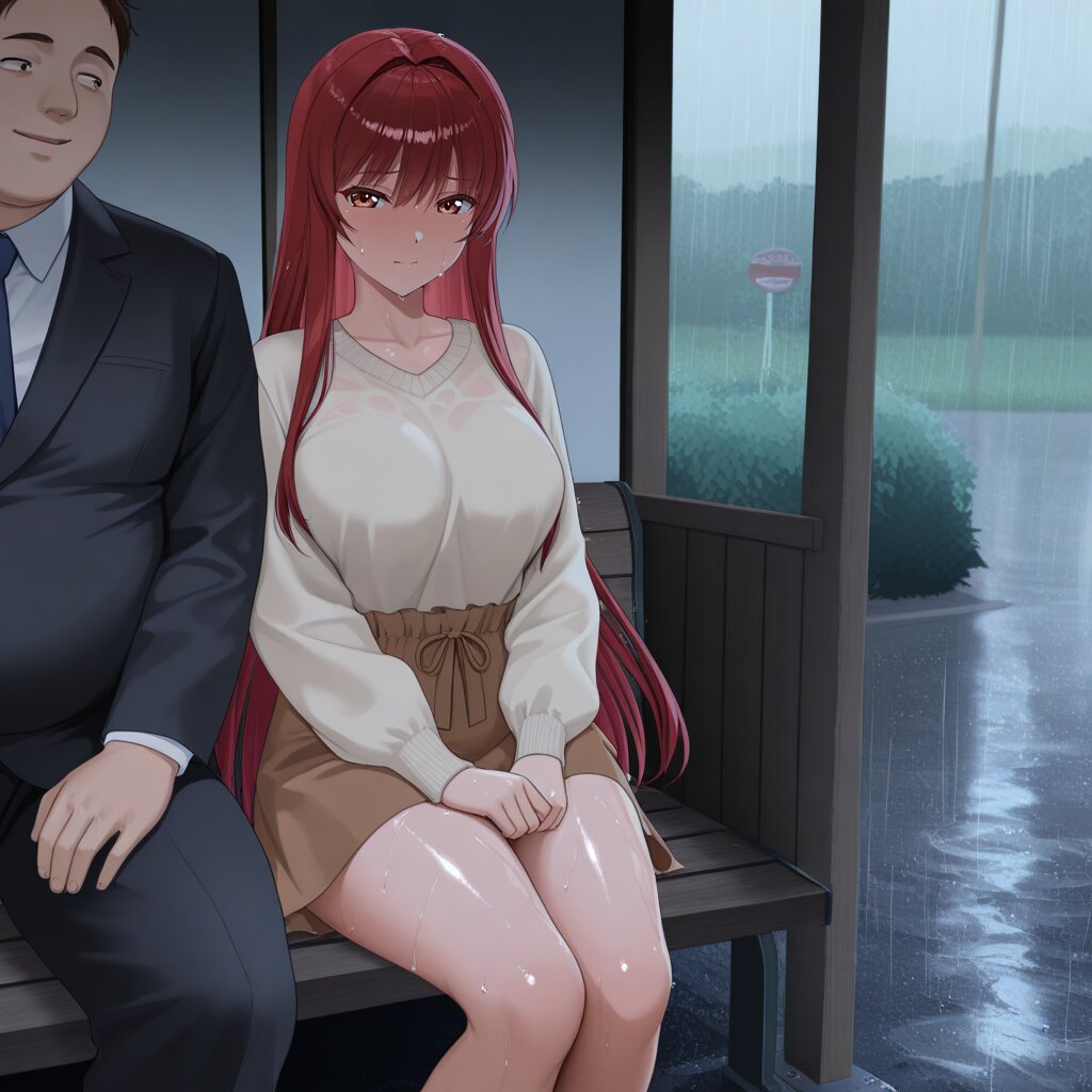 masterpiece,best quality,amazing quality,very aesthetic,absurdres,newest,highres,okashirastyle,8k,extremely detailed CG unity 8k wallpaper,(perfect face:1.2),general,1lady,27yo,long_hair,brown_hair,red_eyes,hair_between_eyes,very_long_hair,brown_eyes,red_hair,floating_hair,hair_intakes,straight_hair,shiny_skin,medium_breasts,wearing casual clothes,brown skirt, rain,looking_at_another, at a country bus stop,she is sitting on long_chair alone, at empty waiting huts,