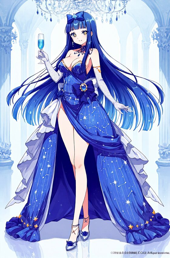 1girl, elegant noble girl, royal princess, cocktail personification, long indigo blue hair, flowing wavy hair, braided side hair, hair ornaments, large sapphire blue eyes, blueberry colored eyes, sparkling eyes with stars, pale porcelain skin, beautiful face, elegant expression, gentle smile, royal blue dress, champagne bubble decorations, constellation embroidery, organza fabric, silk dress, A-line long dress, flowing skirt, blueberry tiara, crystal crown, star accessories, sapphire jewelry, white lace gloves, glass slippers, blue high heels, {standing gracefully|sitting elegantly|dancing at ballroom|holding champagne glass|surrounded by blueberries}, {confident expression|gentle smile|determined look|graceful pose|royal dignity}, {palace ballroom|elegant garden|champagne cellar|starlit terrace|royal dining room}, {crystal chandelier|sparkling bubbles|floating blueberries|golden starlight|champagne bottles}, sophisticated lighting, soft rim lighting, elegant atmosphere, royal ambiance, anime style, beautiful illustration, detailed artwork, elegant character design, masterpiece, best quality, highres, extremely detailed, perfect anatomy